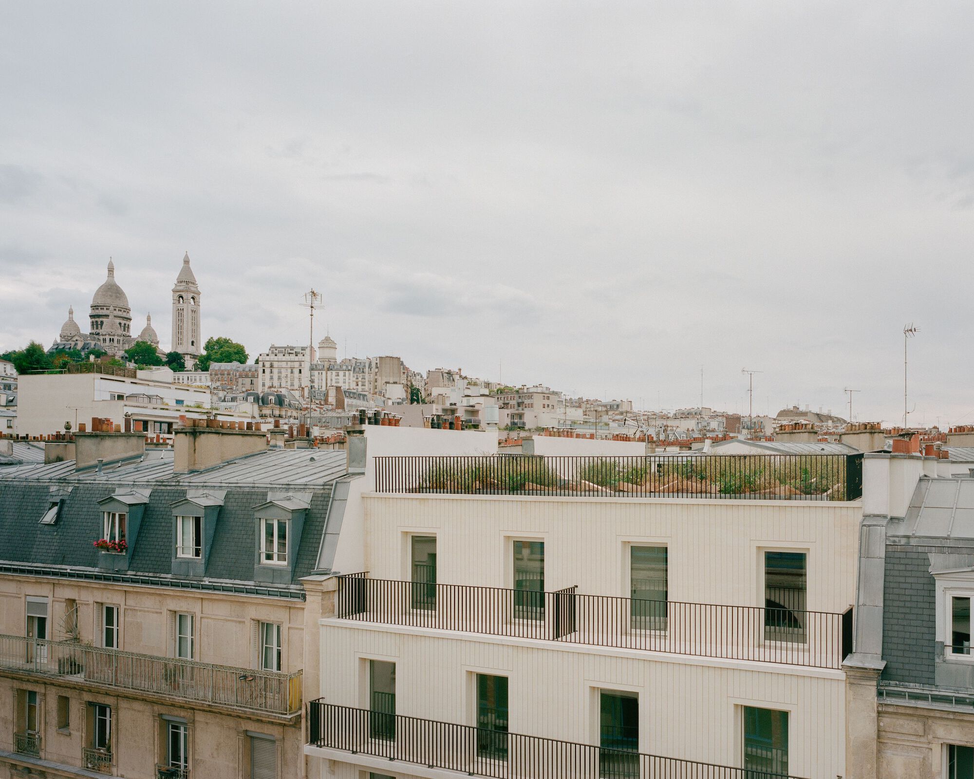 On the Roof, Experimental Architecture for our Non-Human Co-Tenants – In addition to the long balcony on the fifth floor, the building’s top floors are reinterpreted with two successive setbacks that replace the eaves and little terraces. Thus, the traditional zinc roof gives way to a flat roof and architecture specifically dedicated to biodiversity.