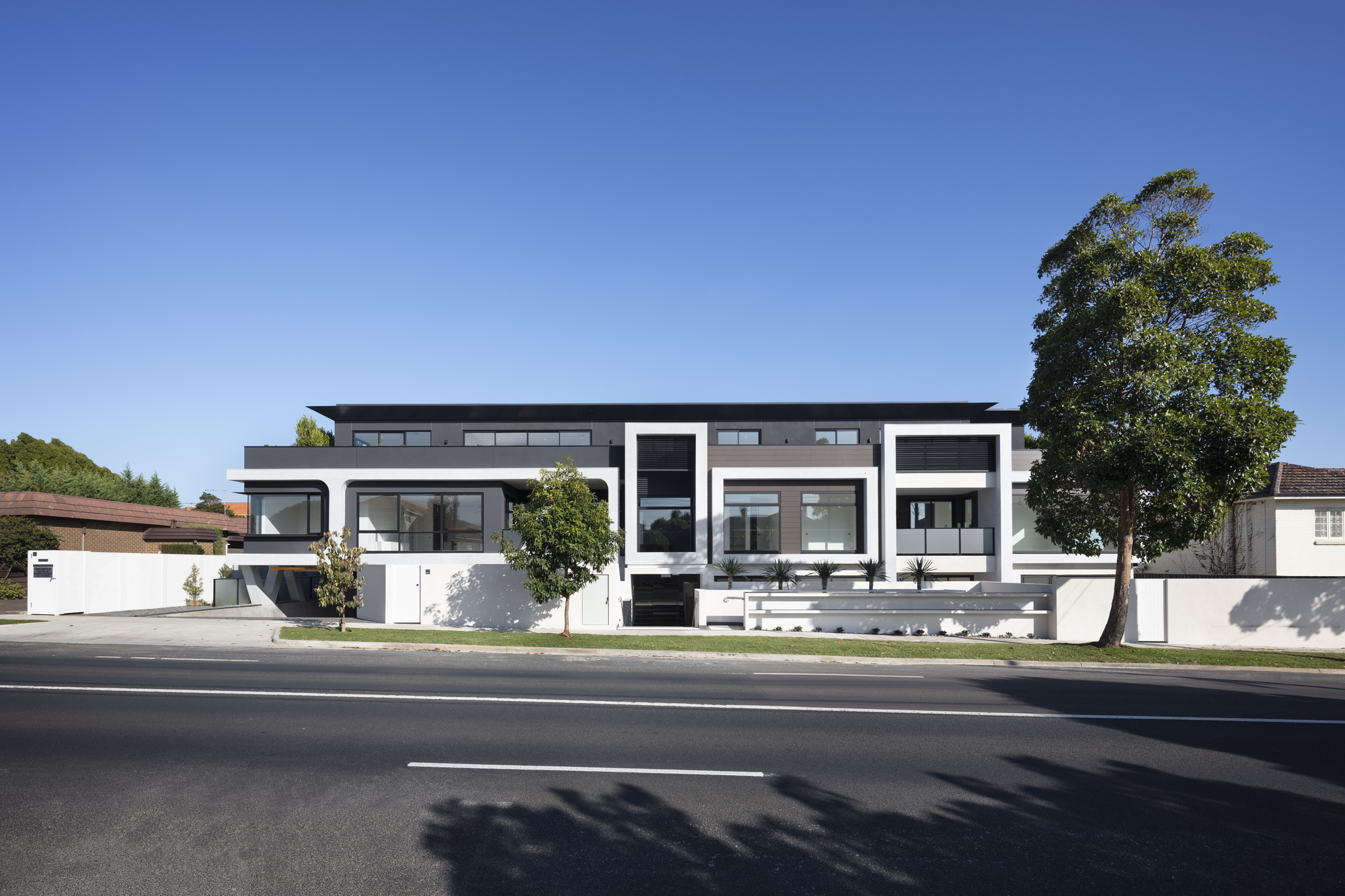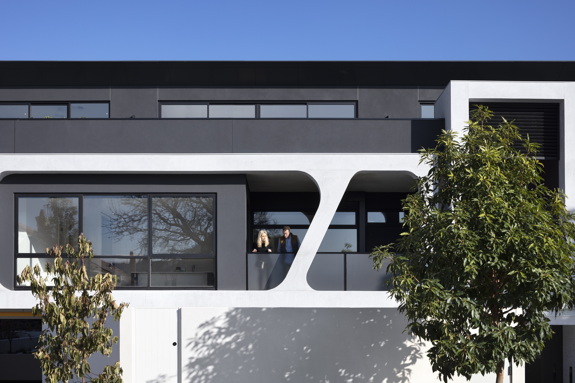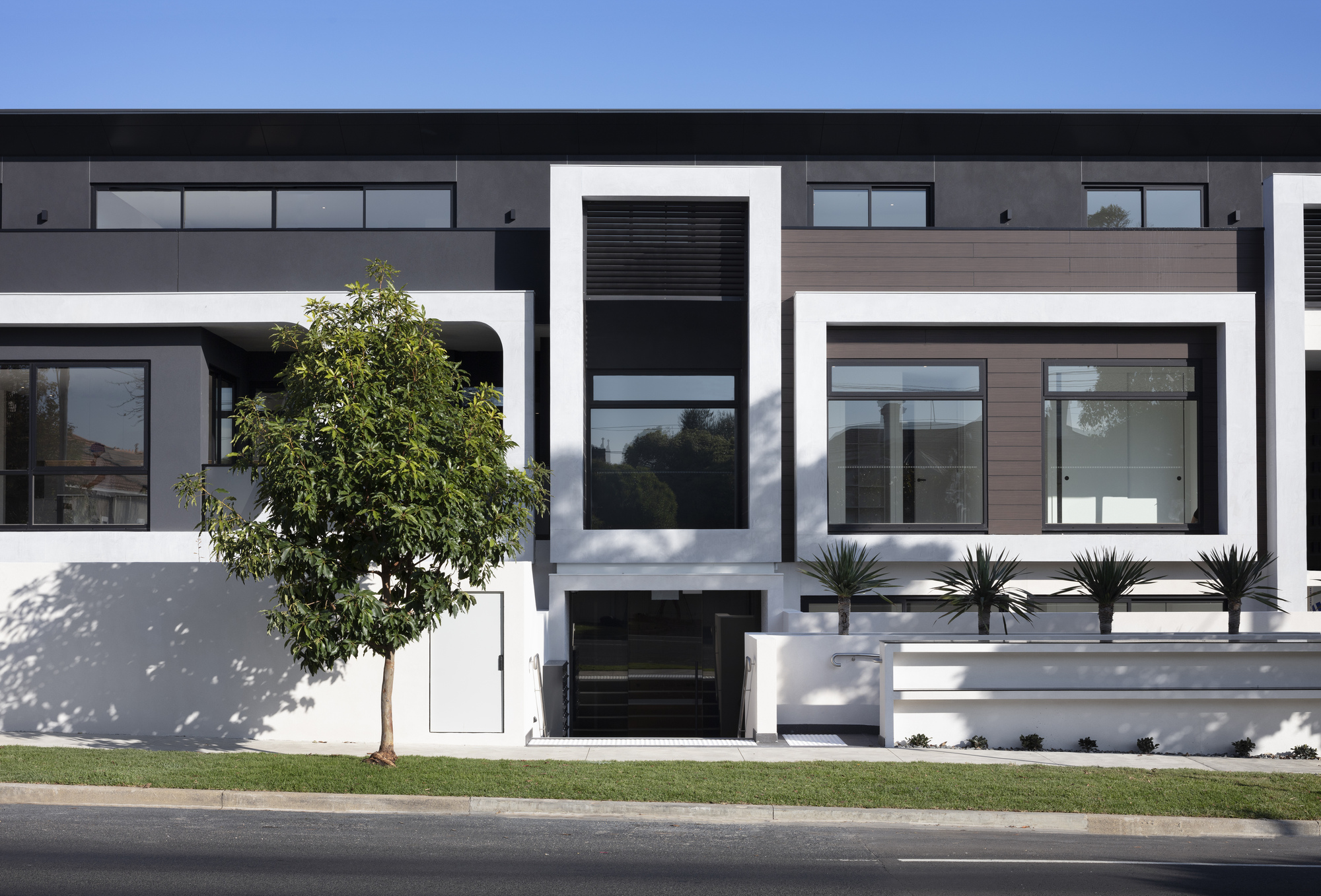 Without being able to easily distinguish between the apartments seen on the façade lessens the visual impact on the street when combining with a light colour palette of majority white rendered concrete and timber cladding.
