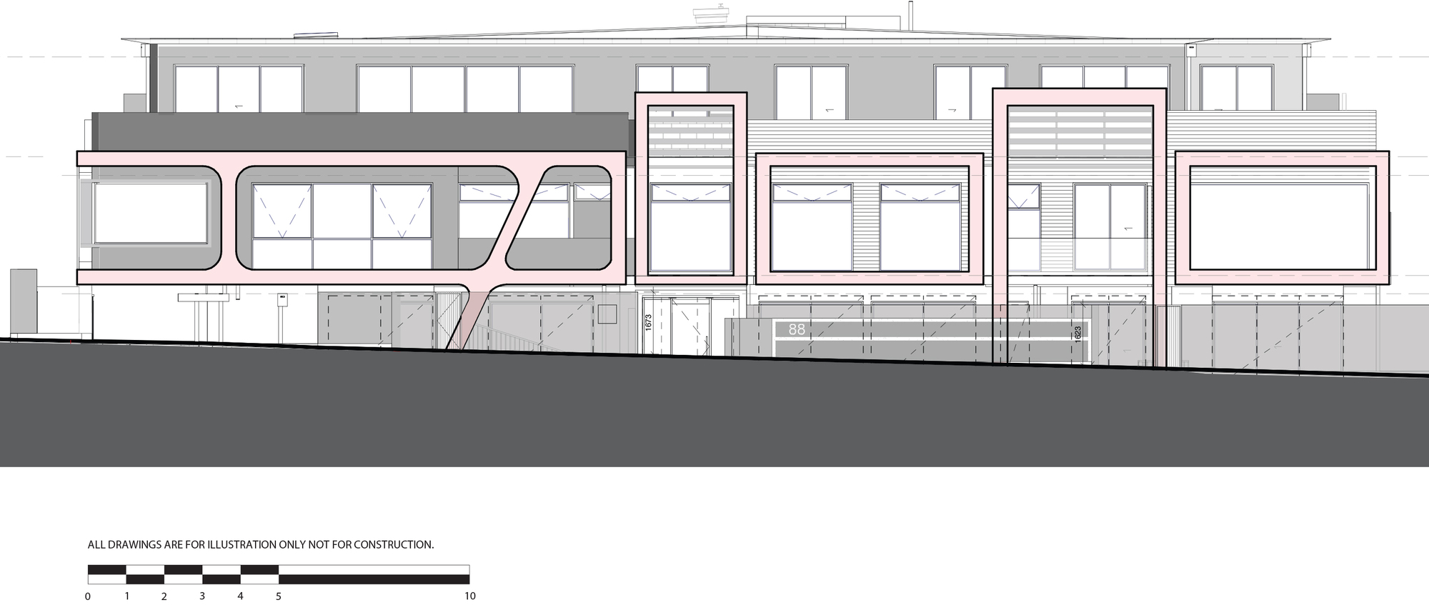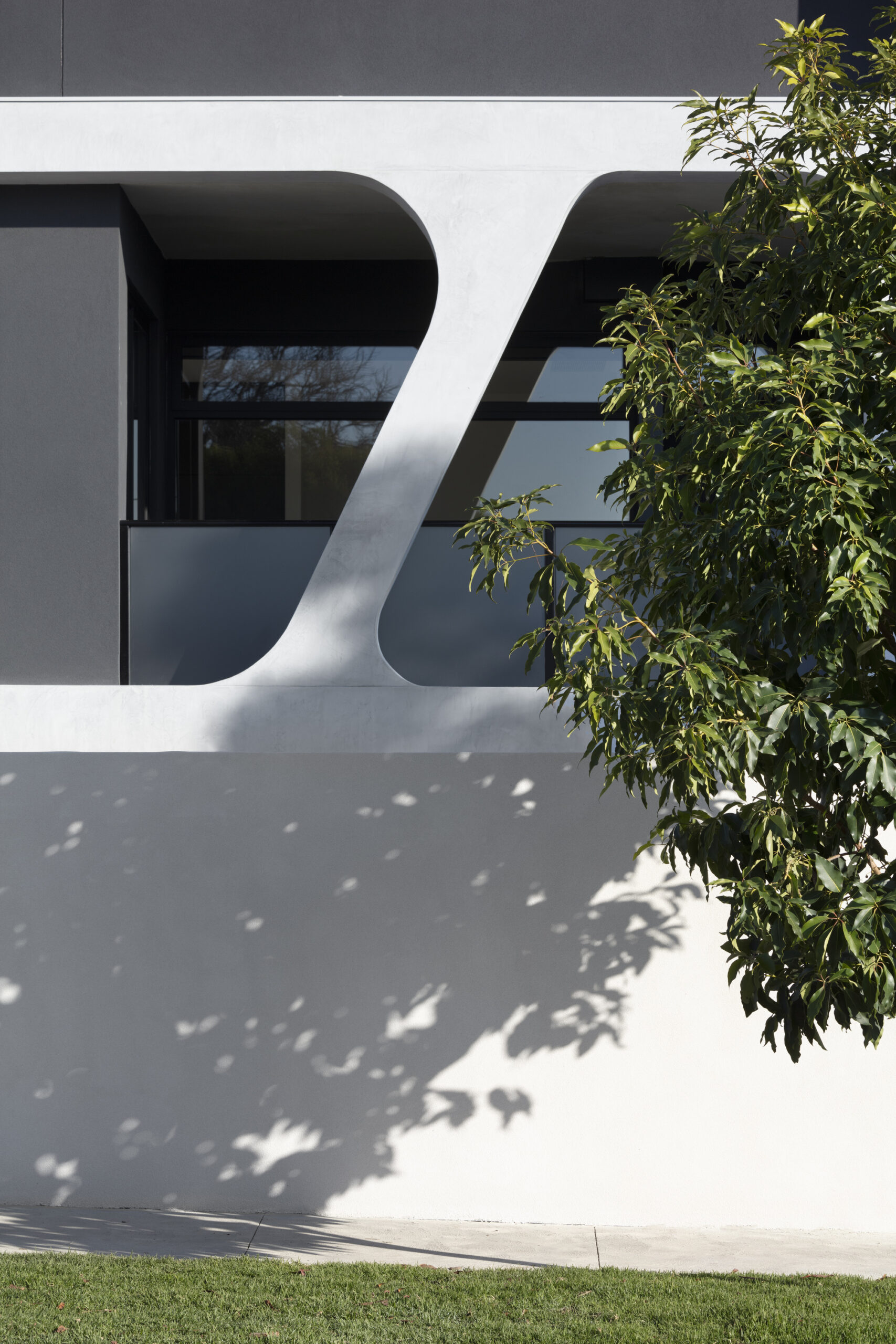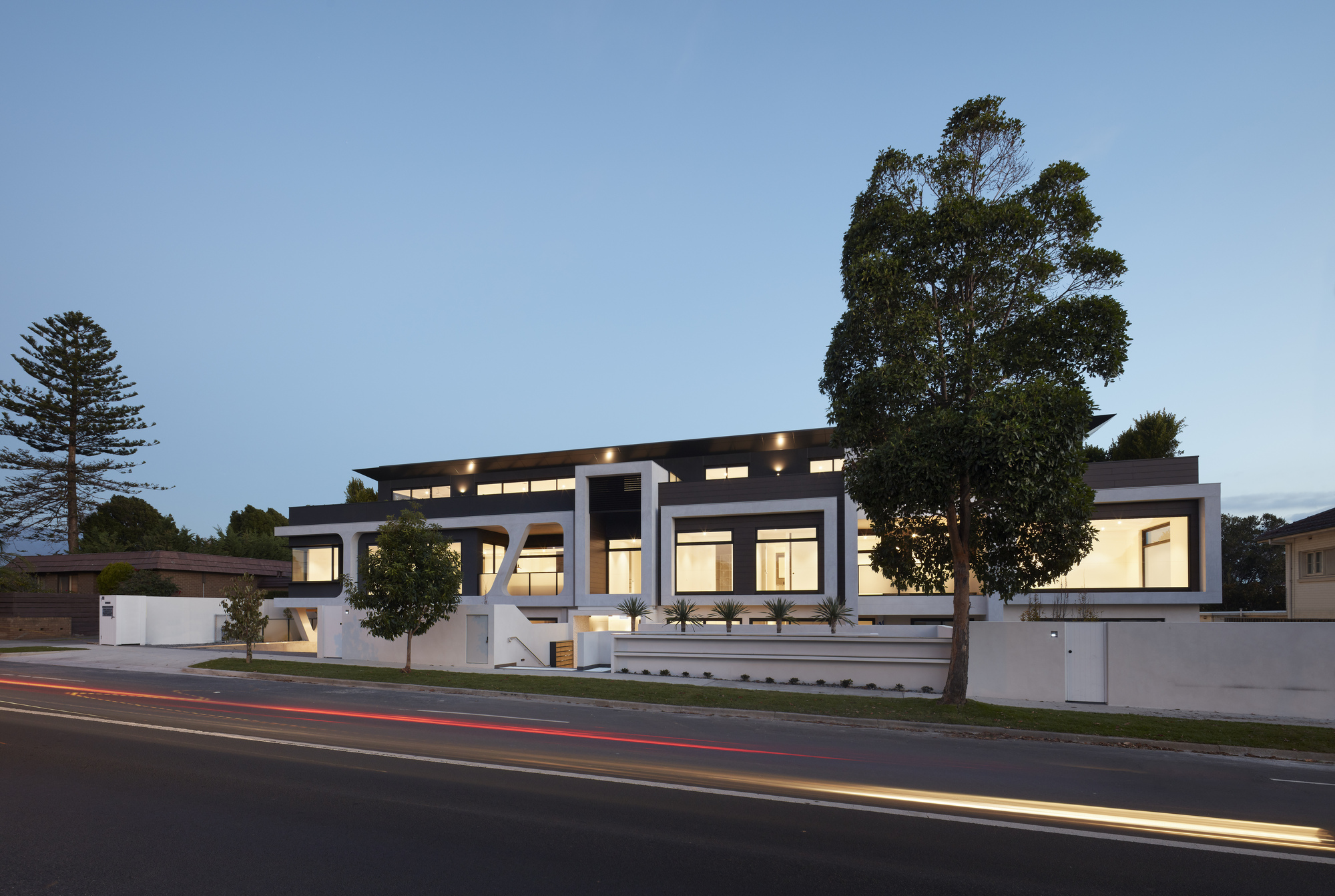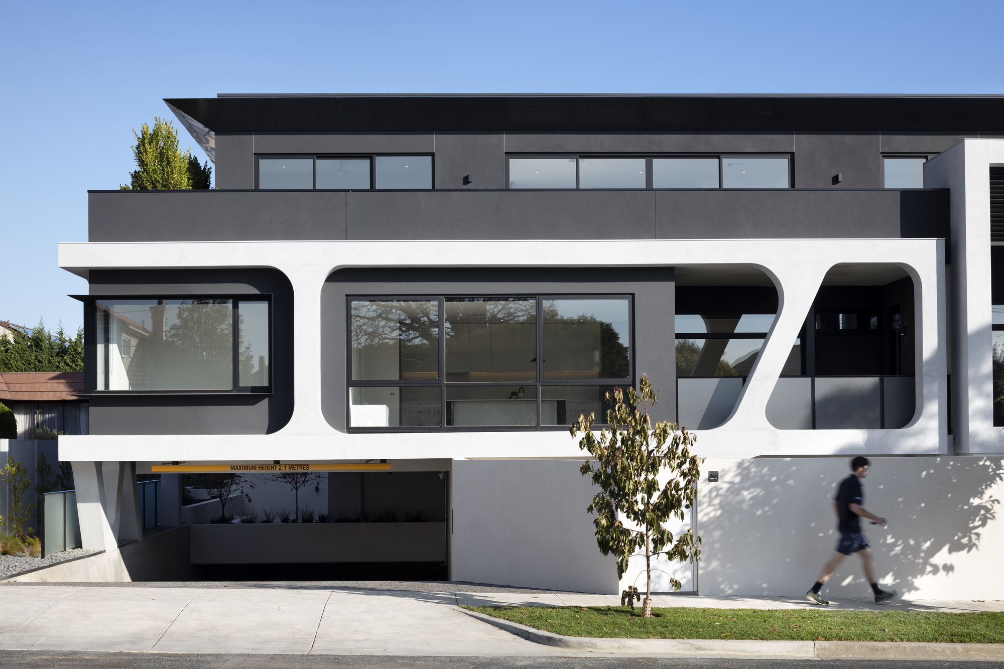 Without being able to easily distinguish between the apartments seen on the façade lessens the visual impact on the street when combining with a light colour palette of majority white rendered concrete and timber cladding.