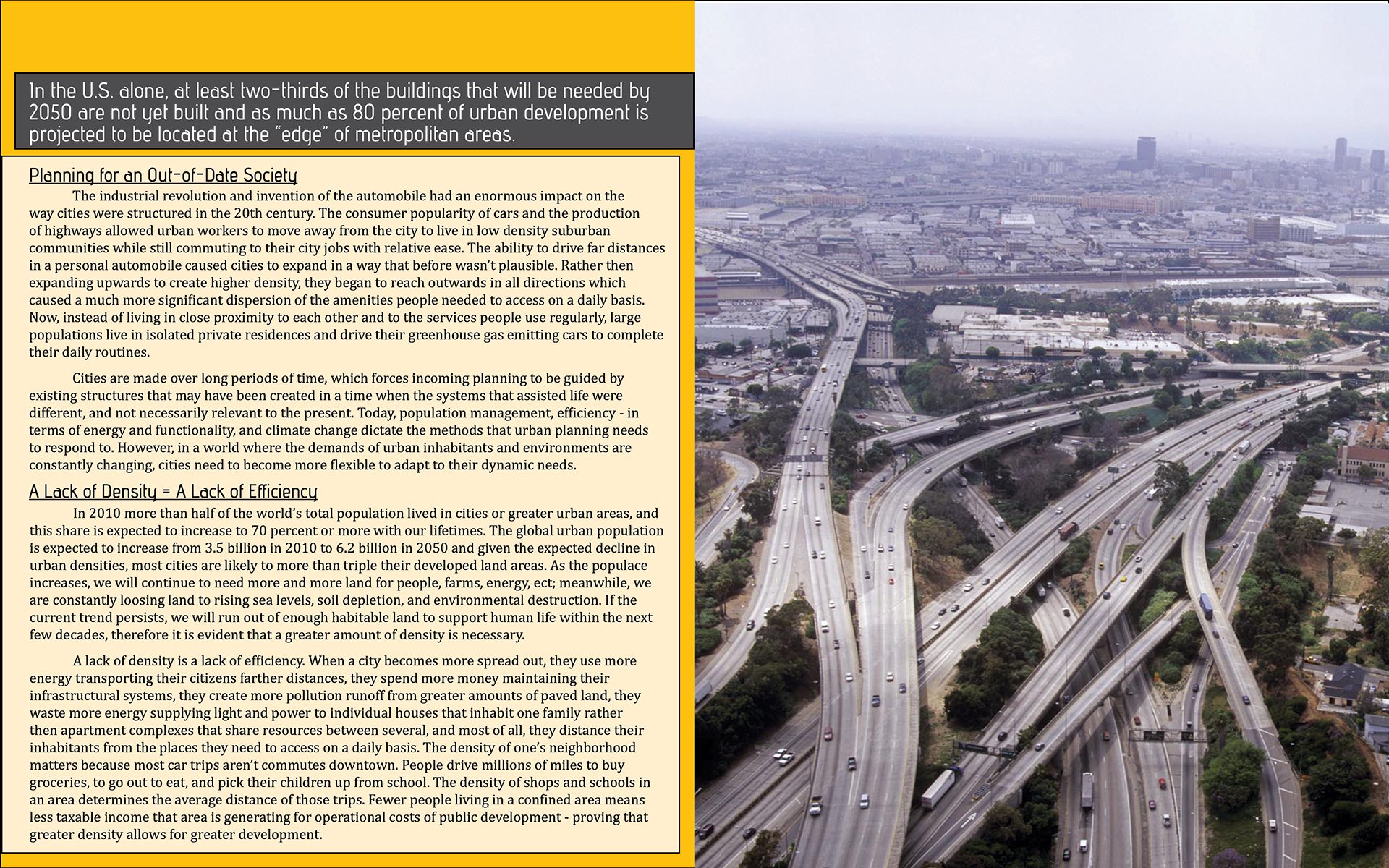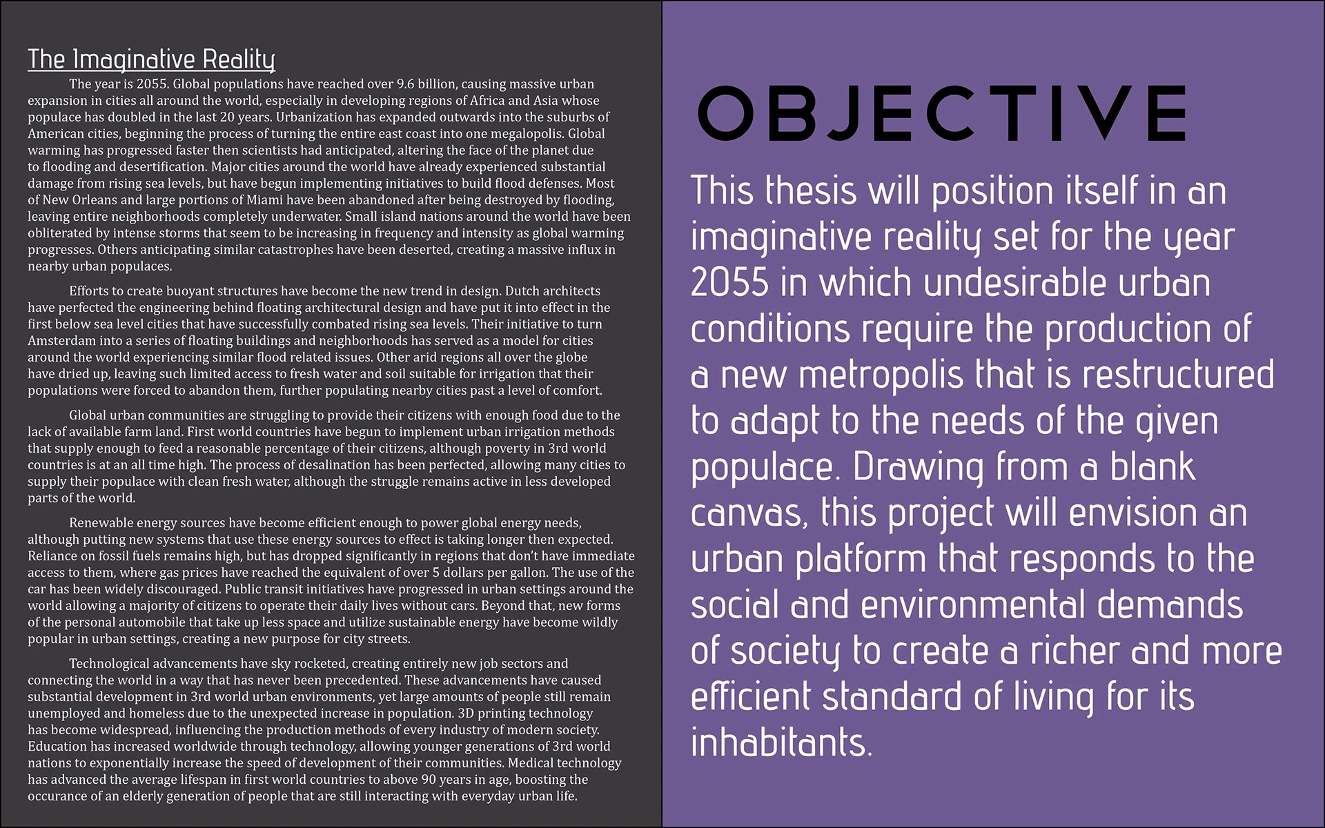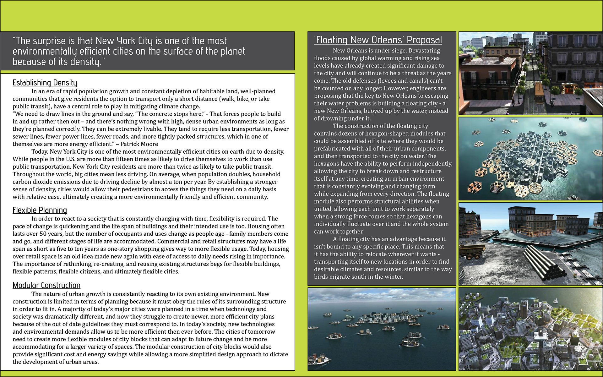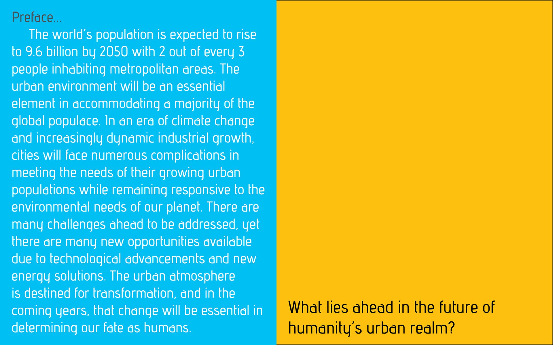 After first analyzing the potential roadblocks that face tomorrow’s cities, and then reactions created to solve those problems, one can make assumptions about the direction that the future of urban design is headed towards. The goal of this project is to do just that. This thesis will imagine a futuristic setting based on predictions made by scientists and architects to develop a vision of a new urban realm that responds to the anticipated dilemmas of the forthcoming generations for a more efficient and environmentally friendly society.