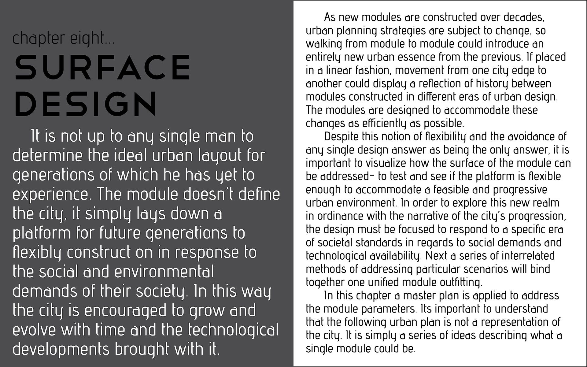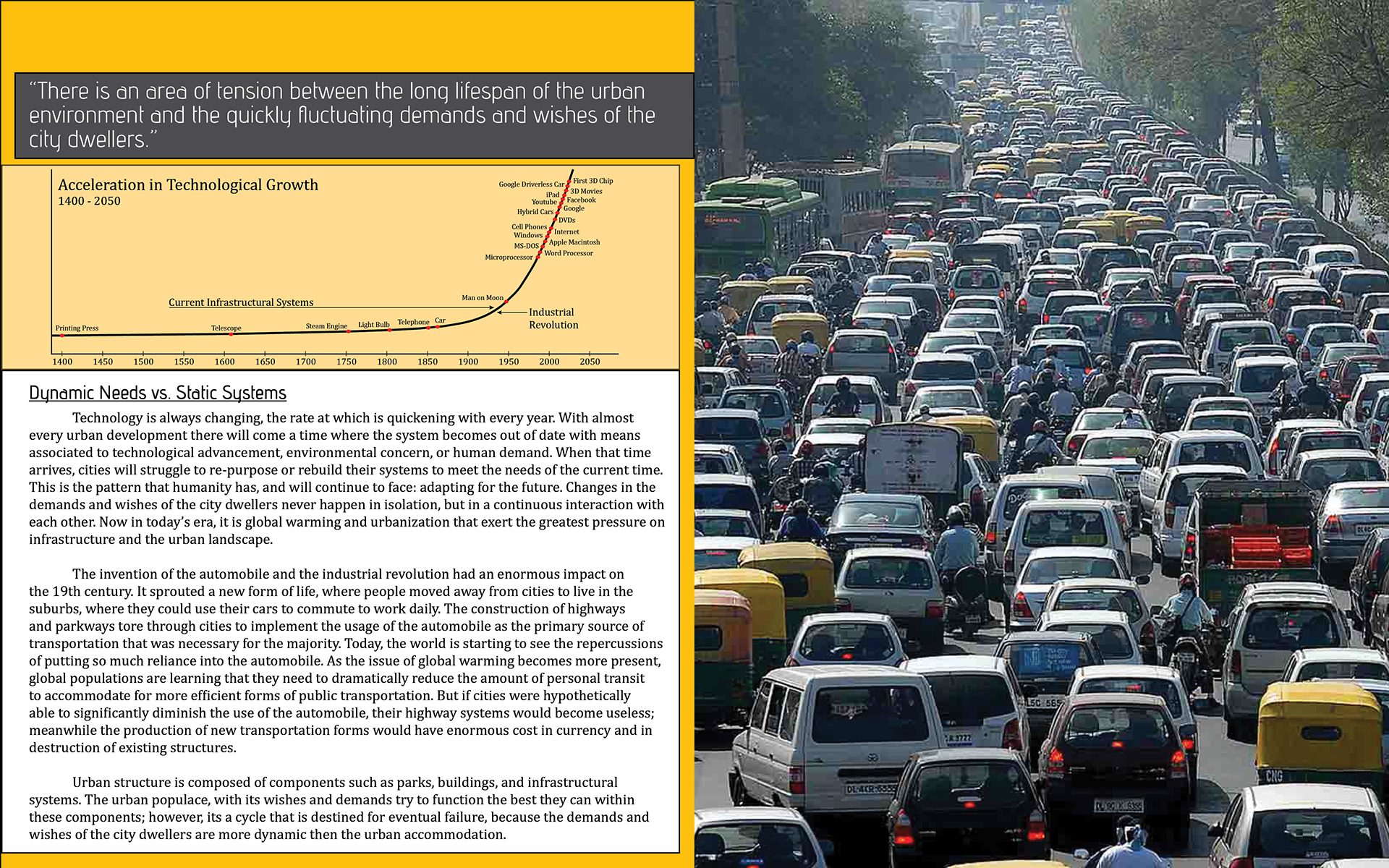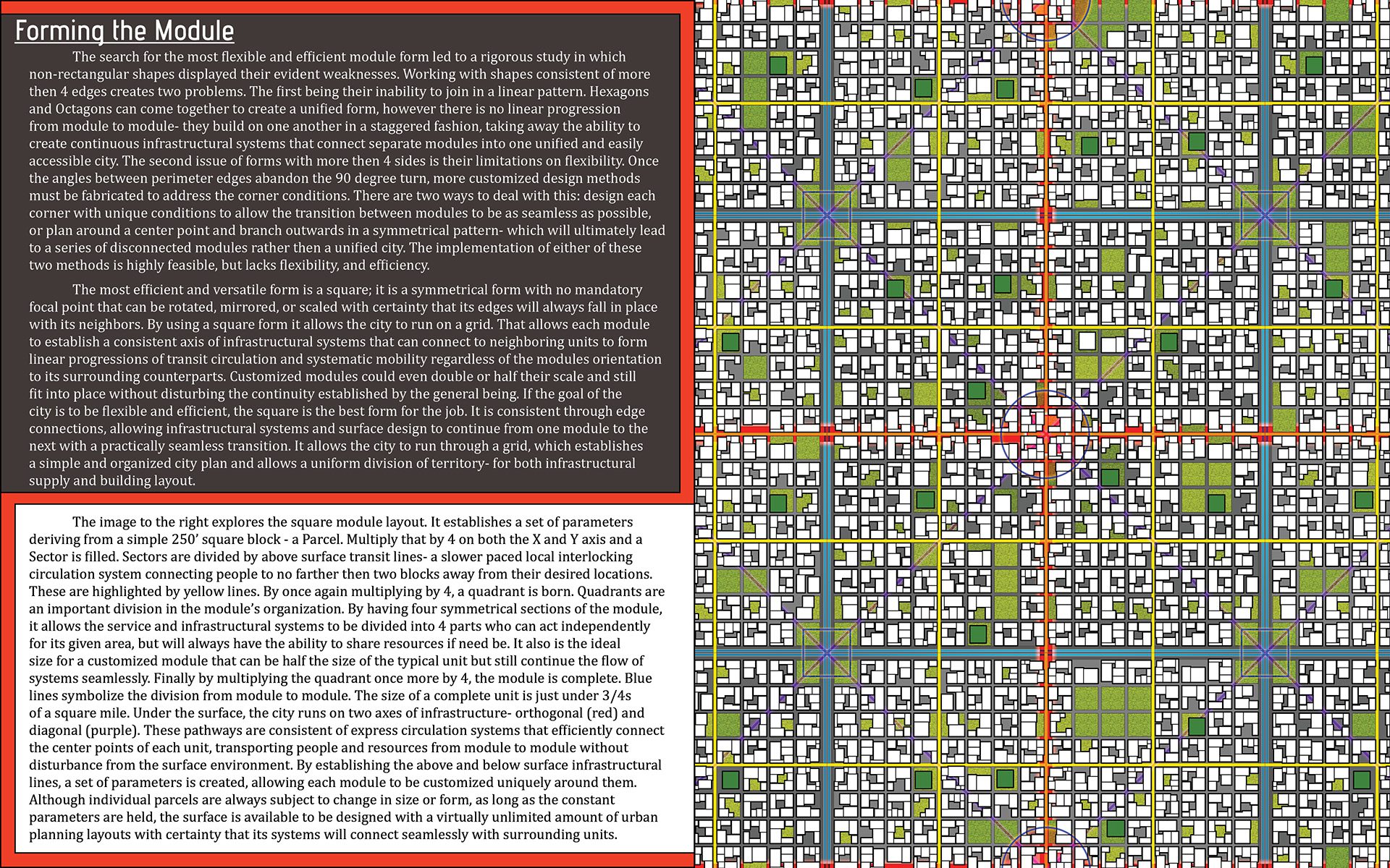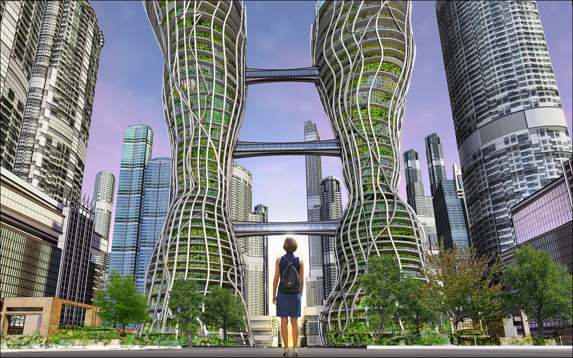 After first analyzing the potential roadblocks that face tomorrow’s cities, and then reactions created to solve those problems, one can make assumptions about the direction that the future of urban design is headed towards. The goal of this project is to do just that. This thesis will imagine a futuristic setting based on predictions made by scientists and architects to develop a vision of a new urban realm that responds to the anticipated dilemmas of the forthcoming generations for a more efficient and environmentally friendly society.