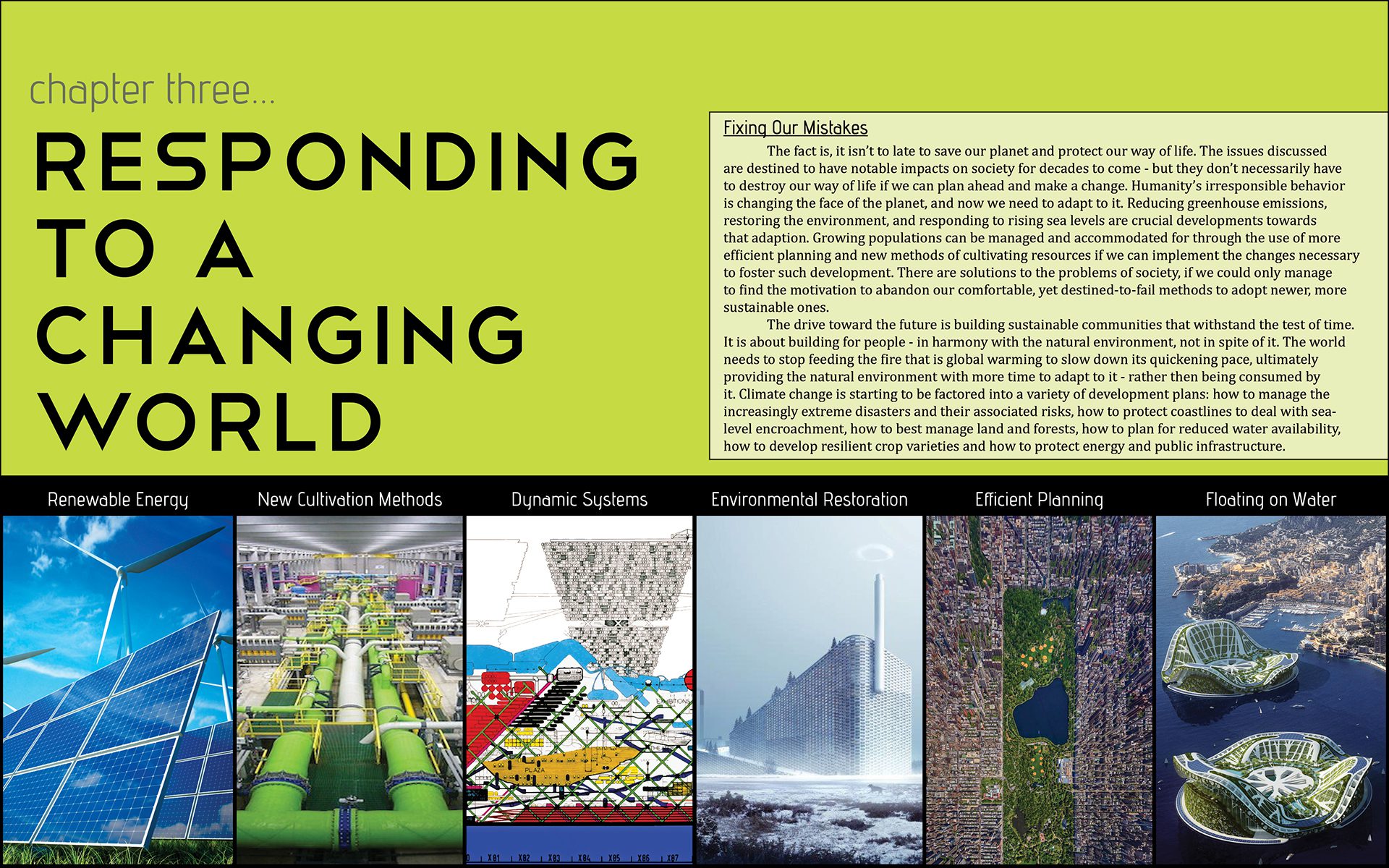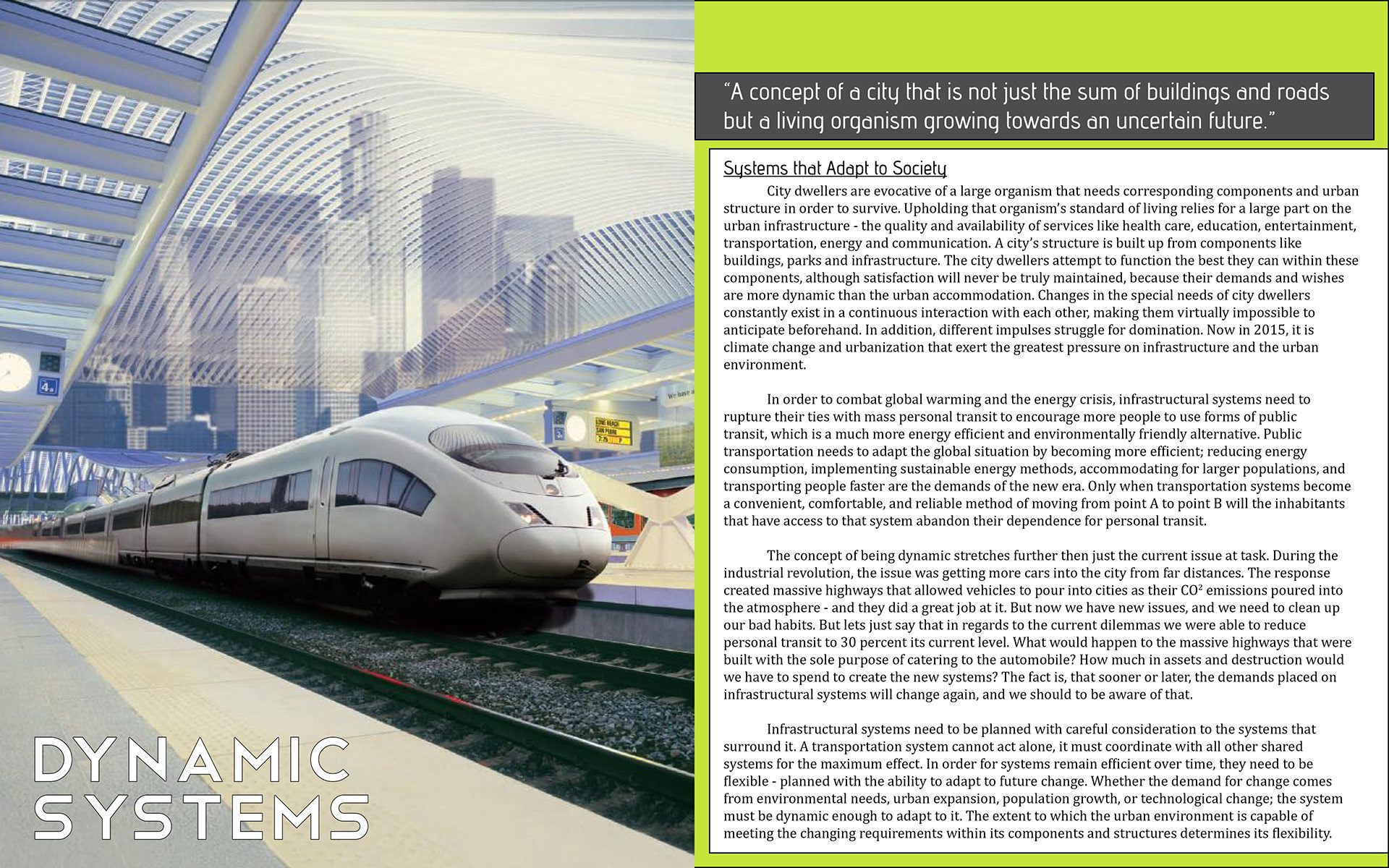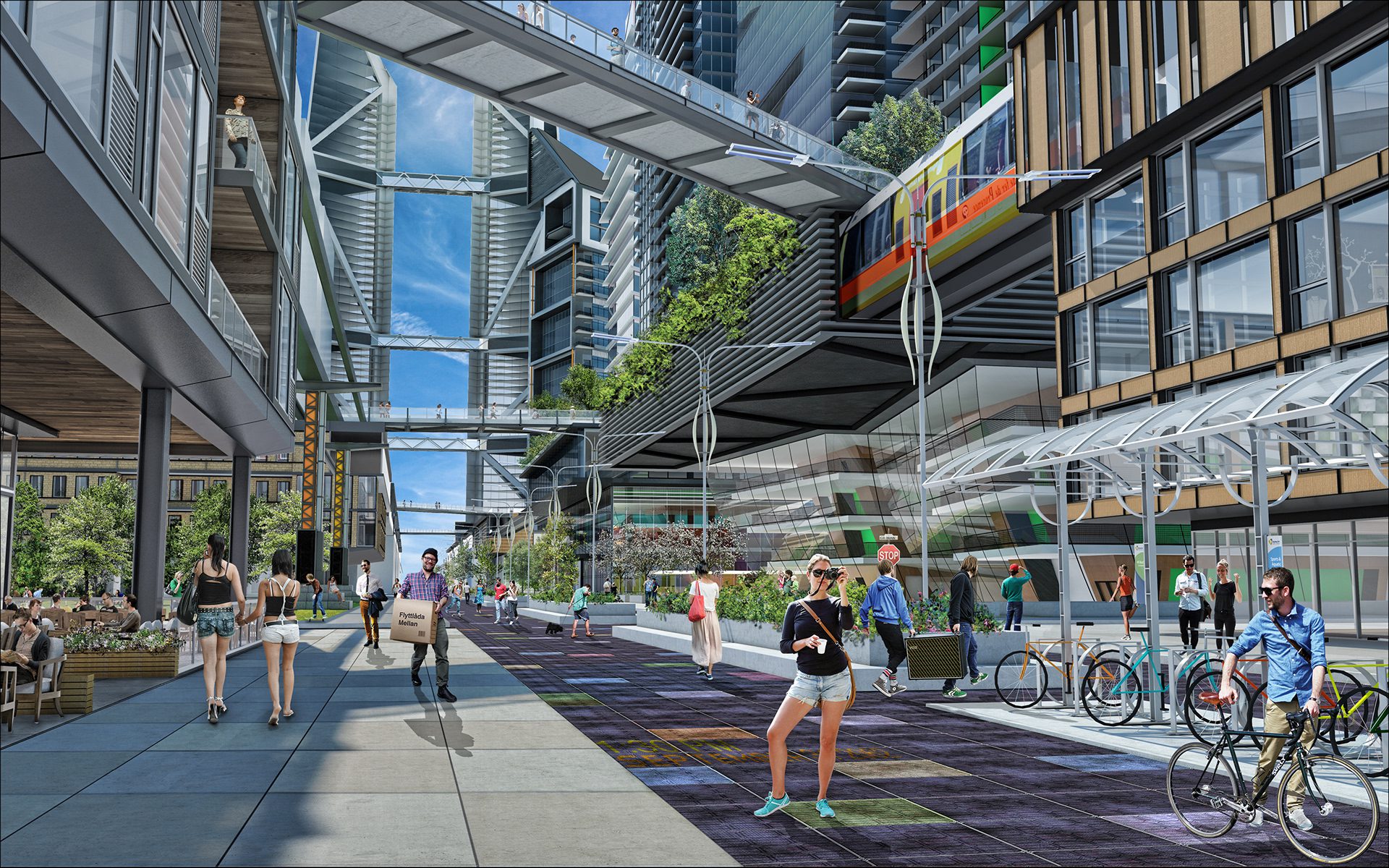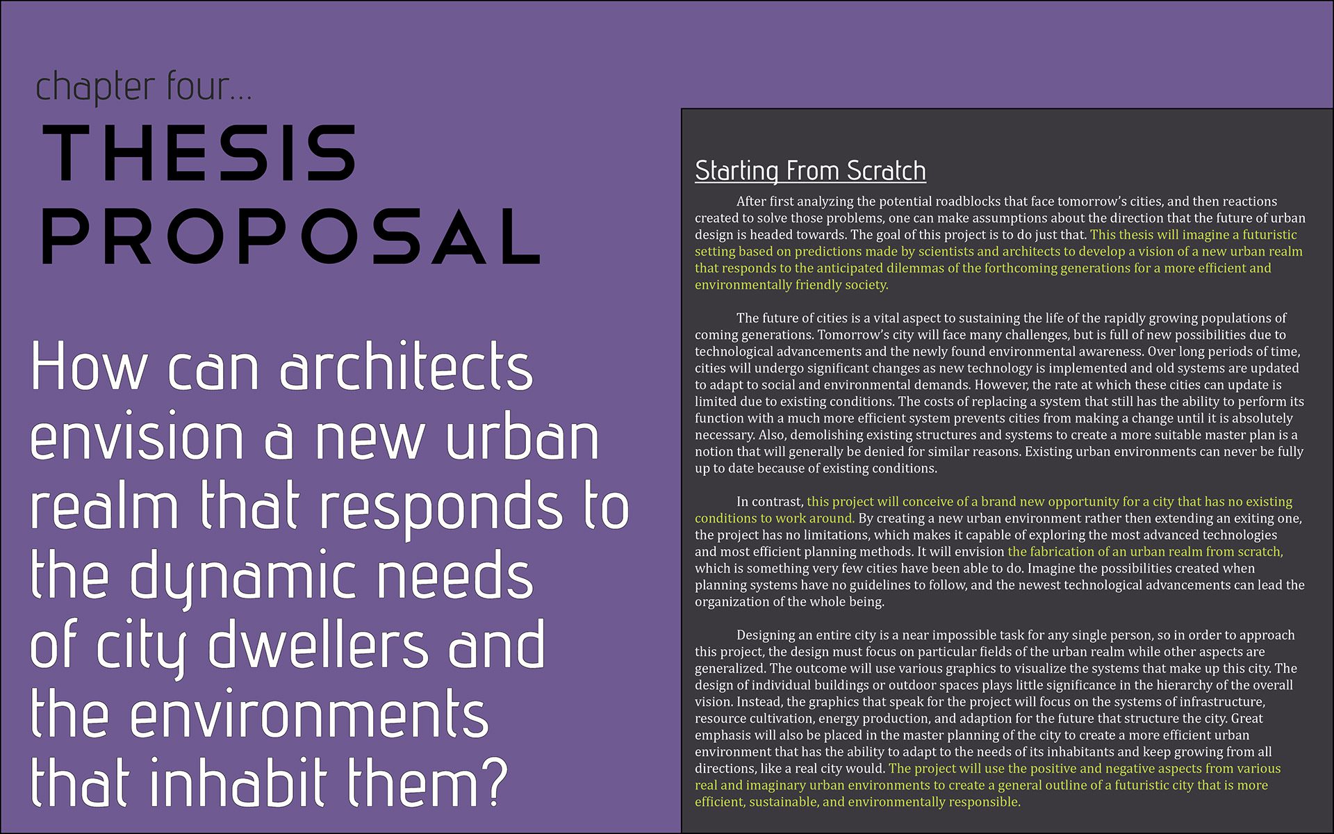 After first analyzing the potential roadblocks that face tomorrow’s cities, and then reactions created to solve those problems, one can make assumptions about the direction that the future of urban design is headed towards. The goal of this project is to do just that. This thesis will imagine a futuristic setting based on predictions made by scientists and architects to develop a vision of a new urban realm that responds to the anticipated dilemmas of the forthcoming generations for a more efficient and environmentally friendly society.
