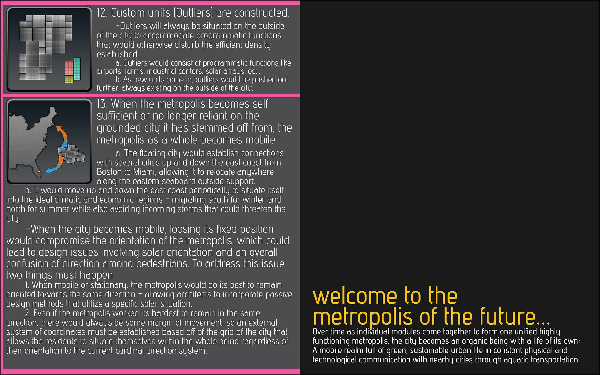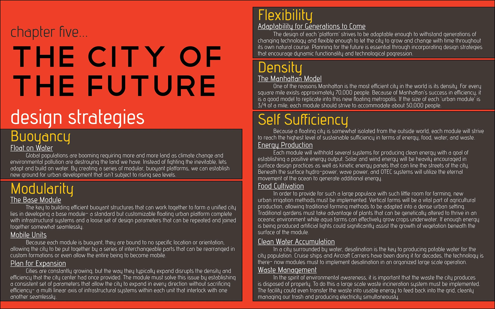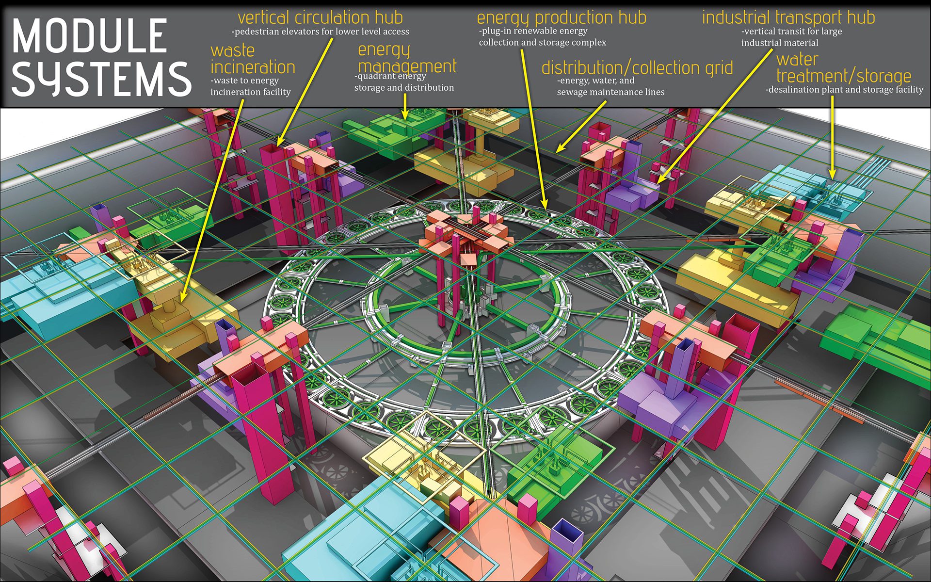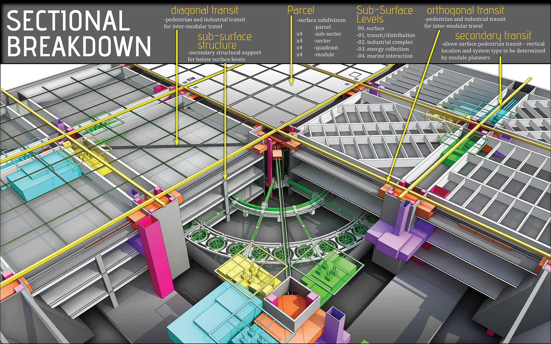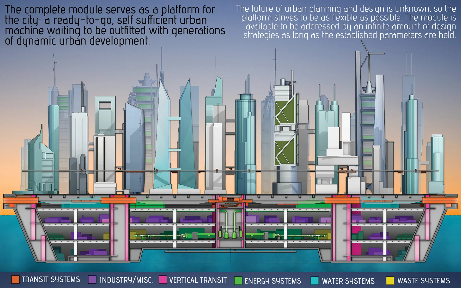 I spent almost a year researching and designing every aspect of the proposed city from the mechanisms that allow it to be buoyant to the organization of transit and streets and even the systems that supply the city’s energy, water, food and waste necessities. It is not just a floating platform with life on it- it is a visionary city that encompasses every aspect of urban life to create something that strives to be truly better than the contemporary situation.