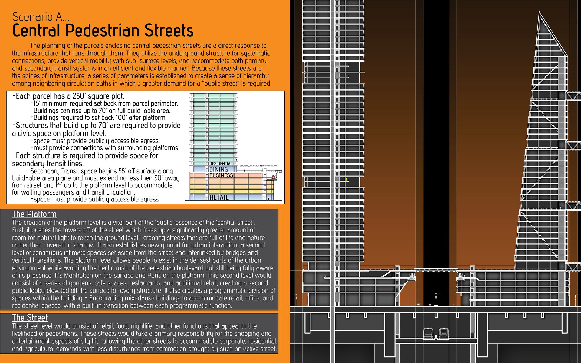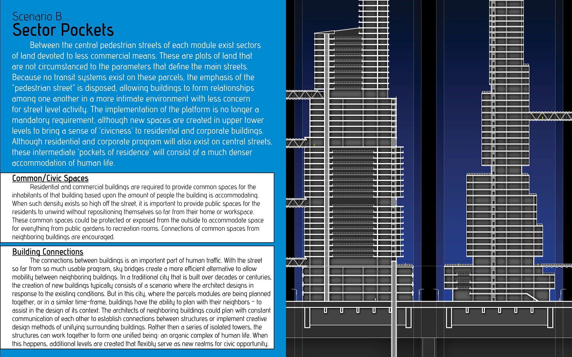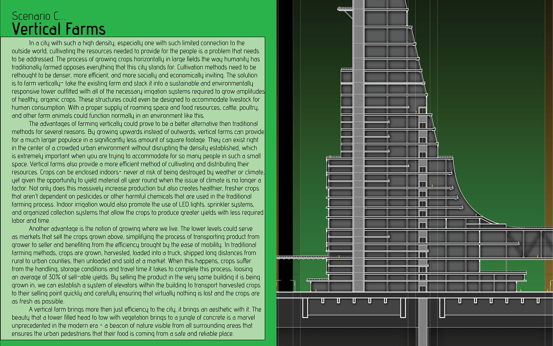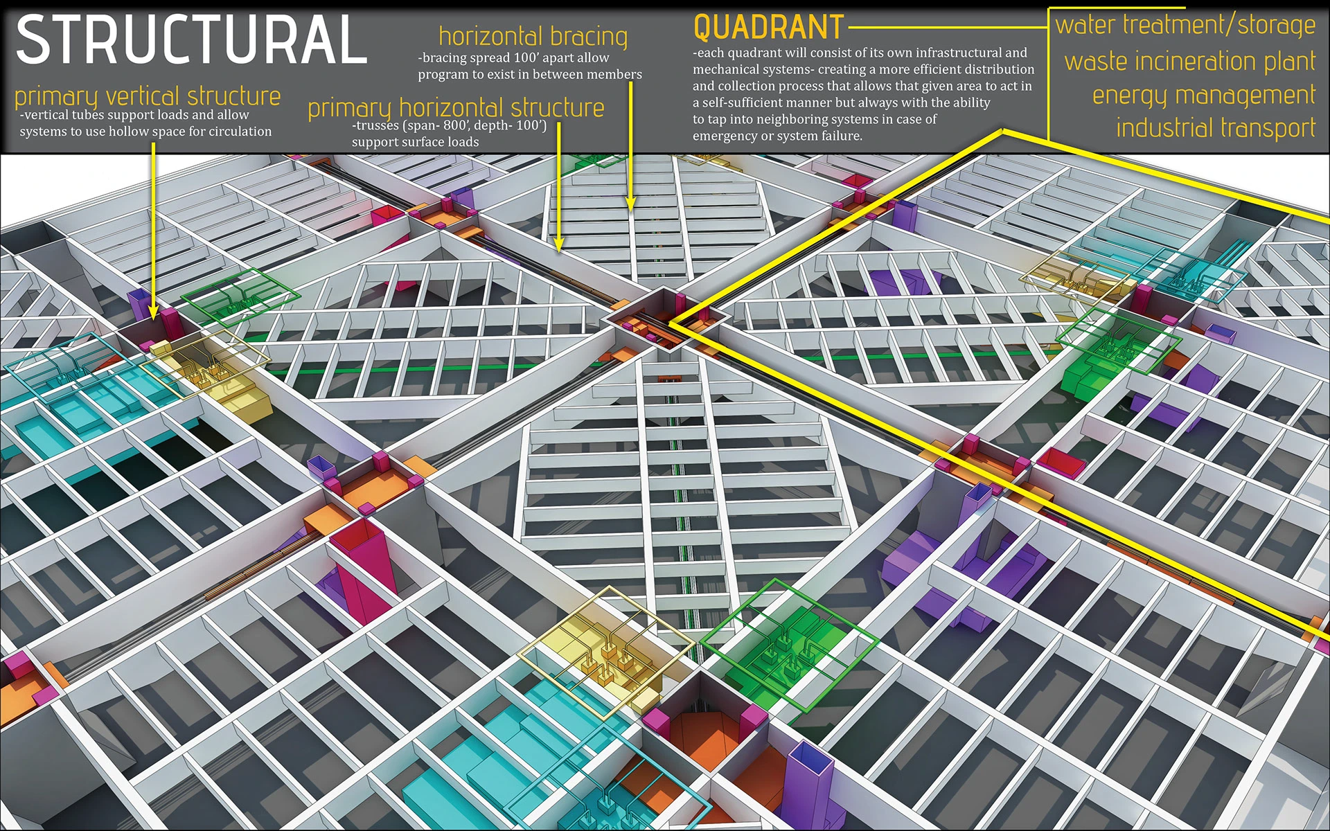 The visionary aspect of the project is key to defining it, and provides a whole new series of opportunities that otherwise wouldn’t be plausible. It allows one to escape the parameters set by reality to create broader theoretical ideas that conceptualize what an urban realm could be. It proposes systems that haven’t been precedented, and makes assumptions about the world that may never become factual. The visionary aspect allows this project to explore ideas, rather then architectural design – these ideas are then visualized through architectural graphics that speak for the systems created and the way of life those systems can provide.