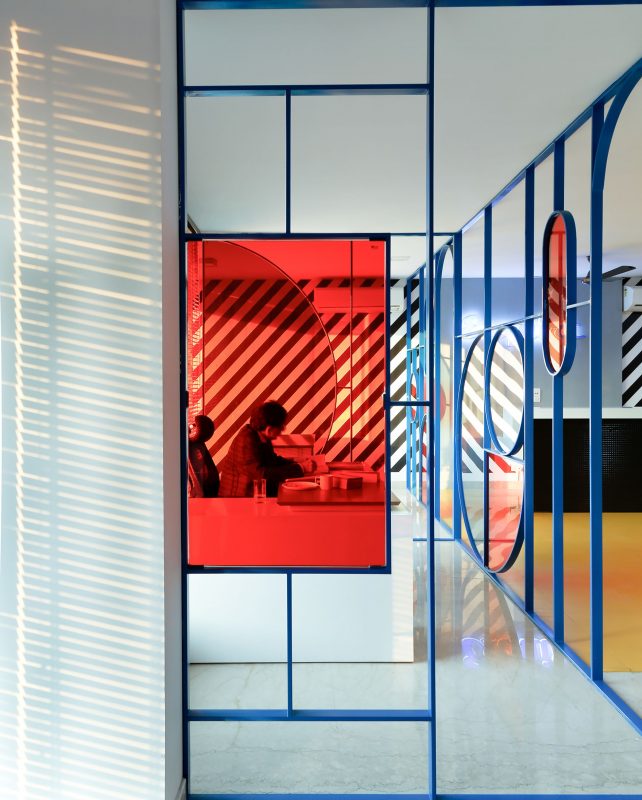Moreover, here, a large space had to be divided into individual sections which would have a porous nature for the purpose of connectivity and linkage amongst the holders and at the same time, having a provision of privacy to those sections. This led to an idea of punctured partitions. These partitions were composed of slim metal plates bending to form simple geometric shapes which would house tinted glass pieces.