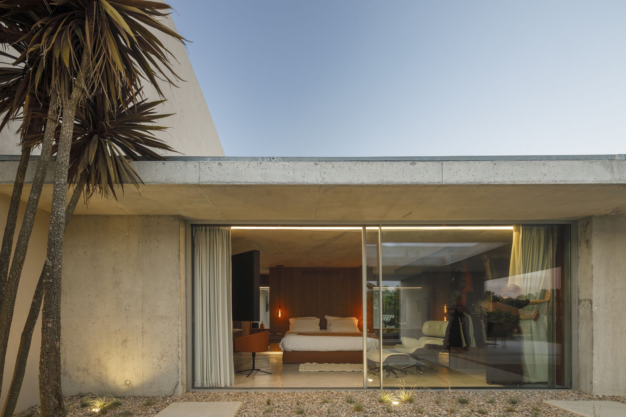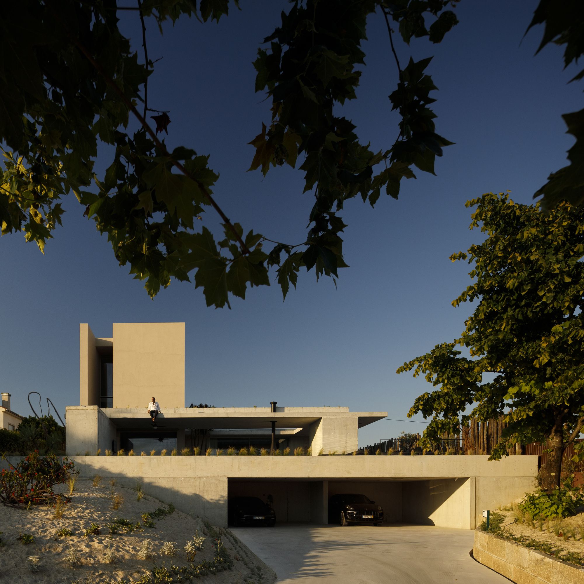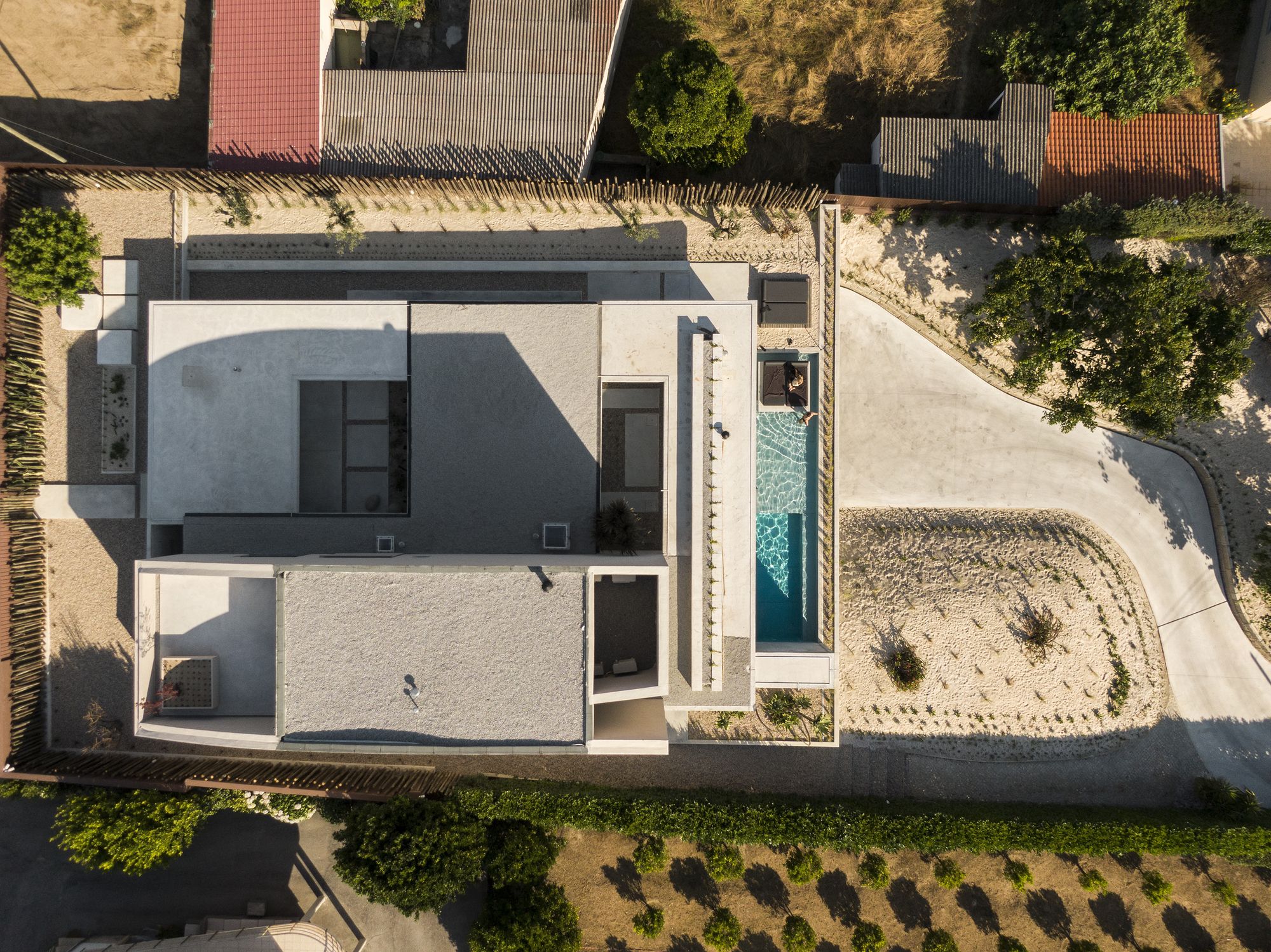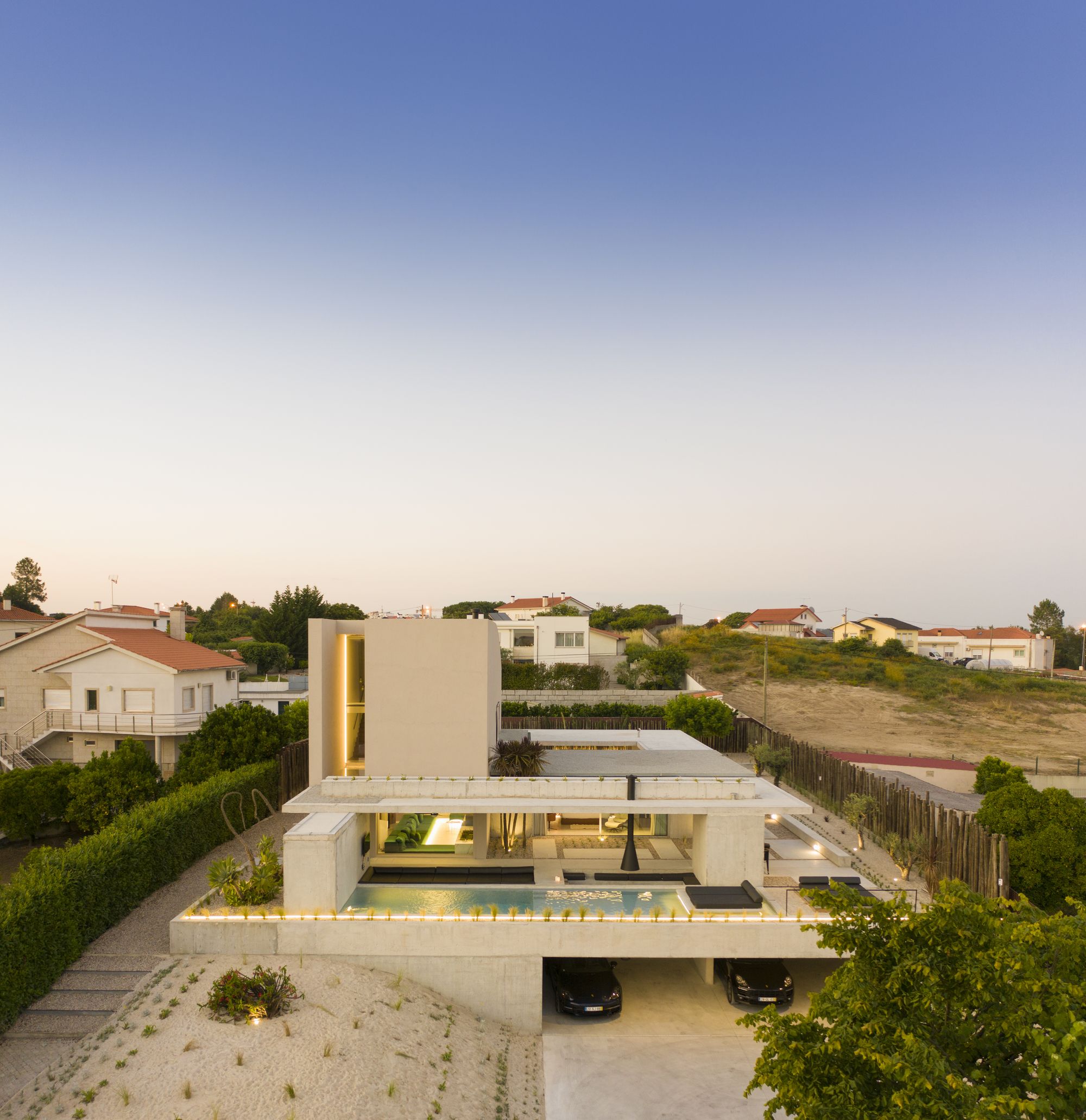 The latter is crowned by a longitudinal concrete platform whose pool and water mirror shelter the garage at the lower level.