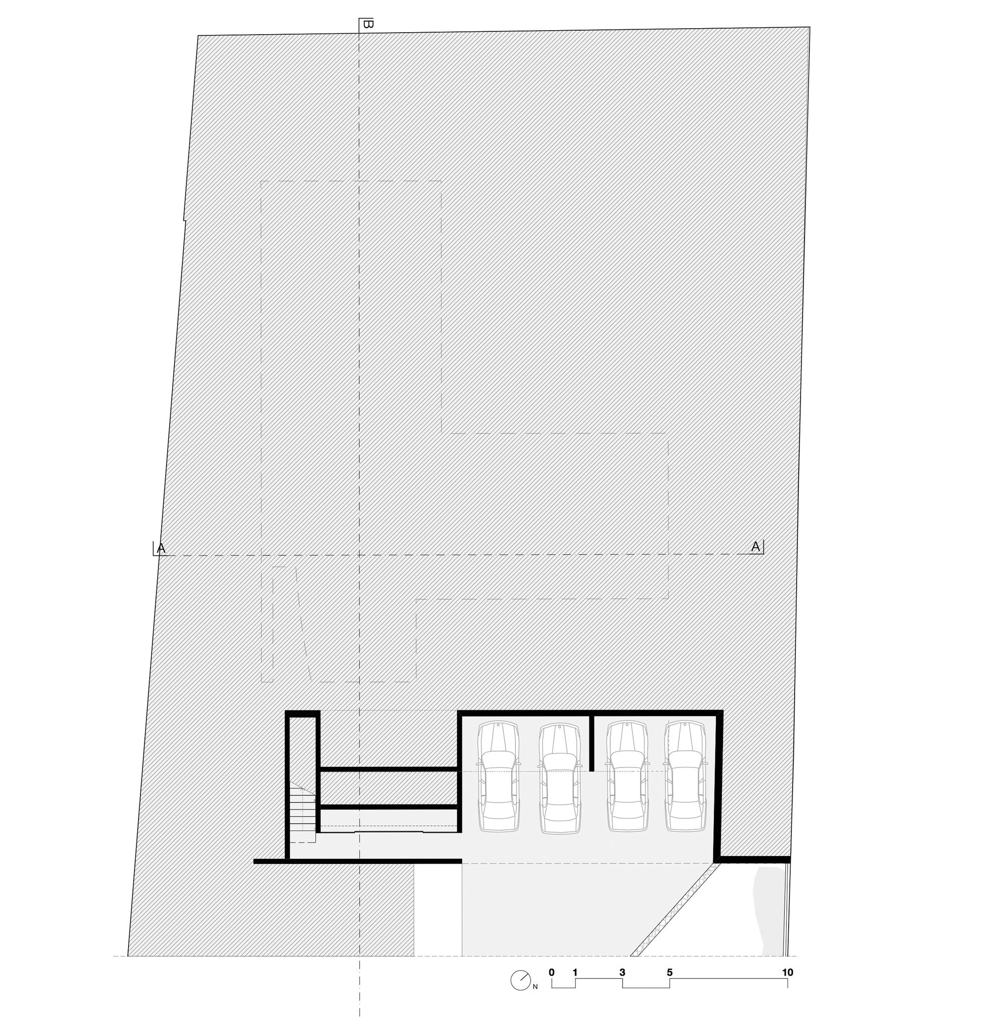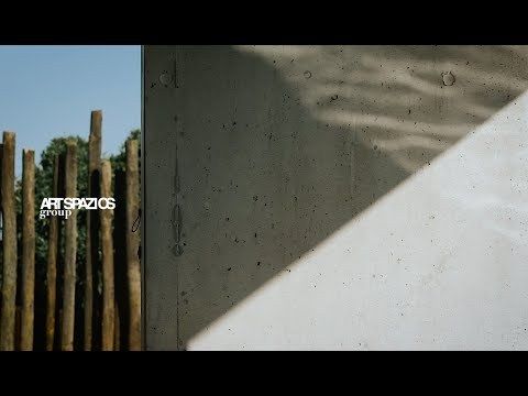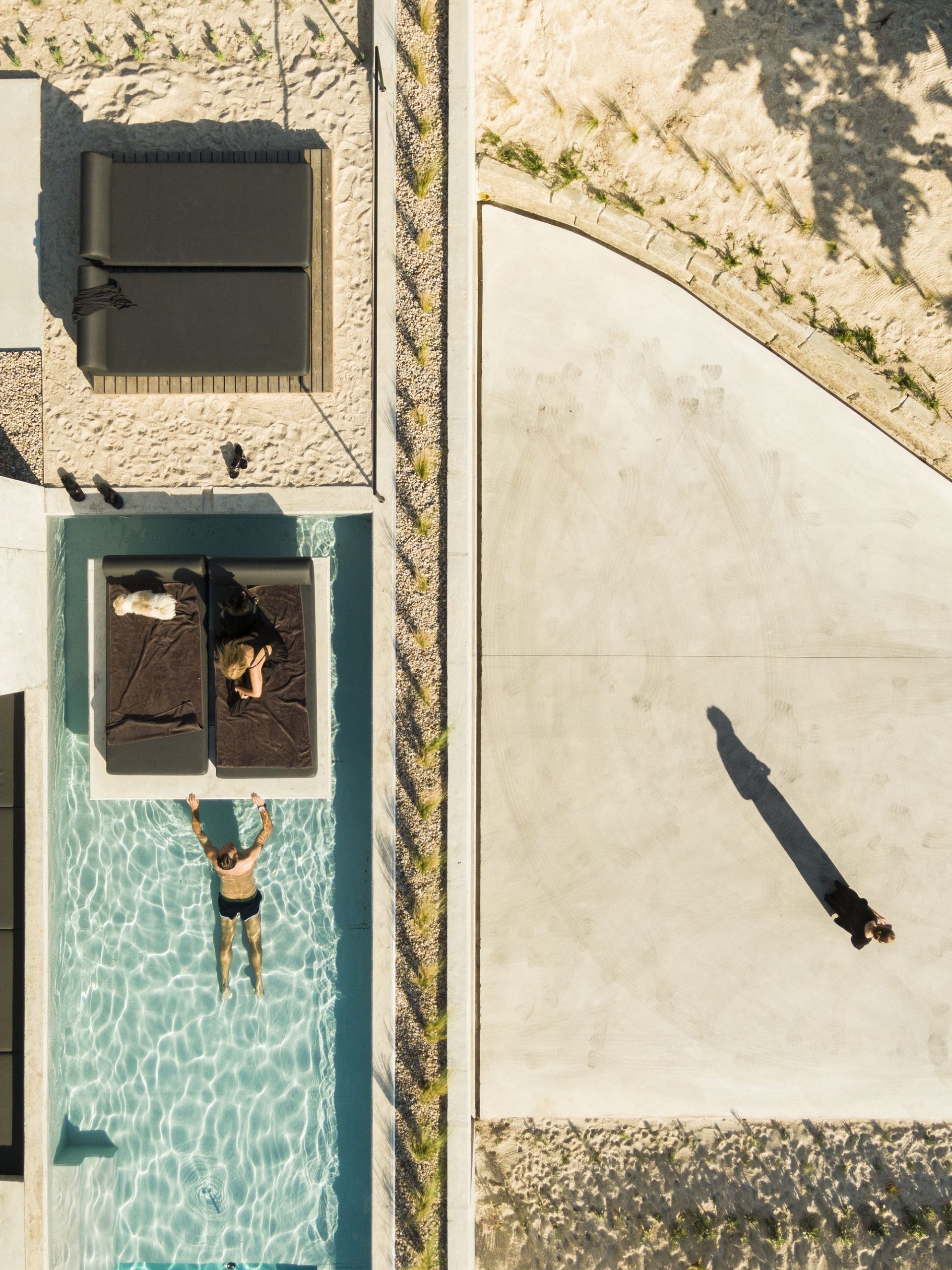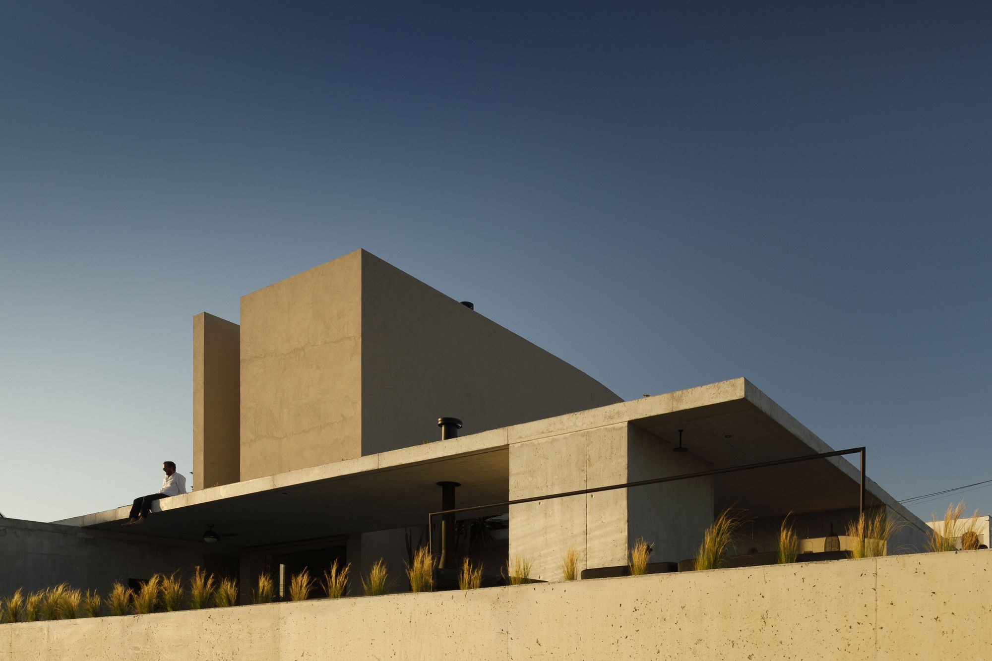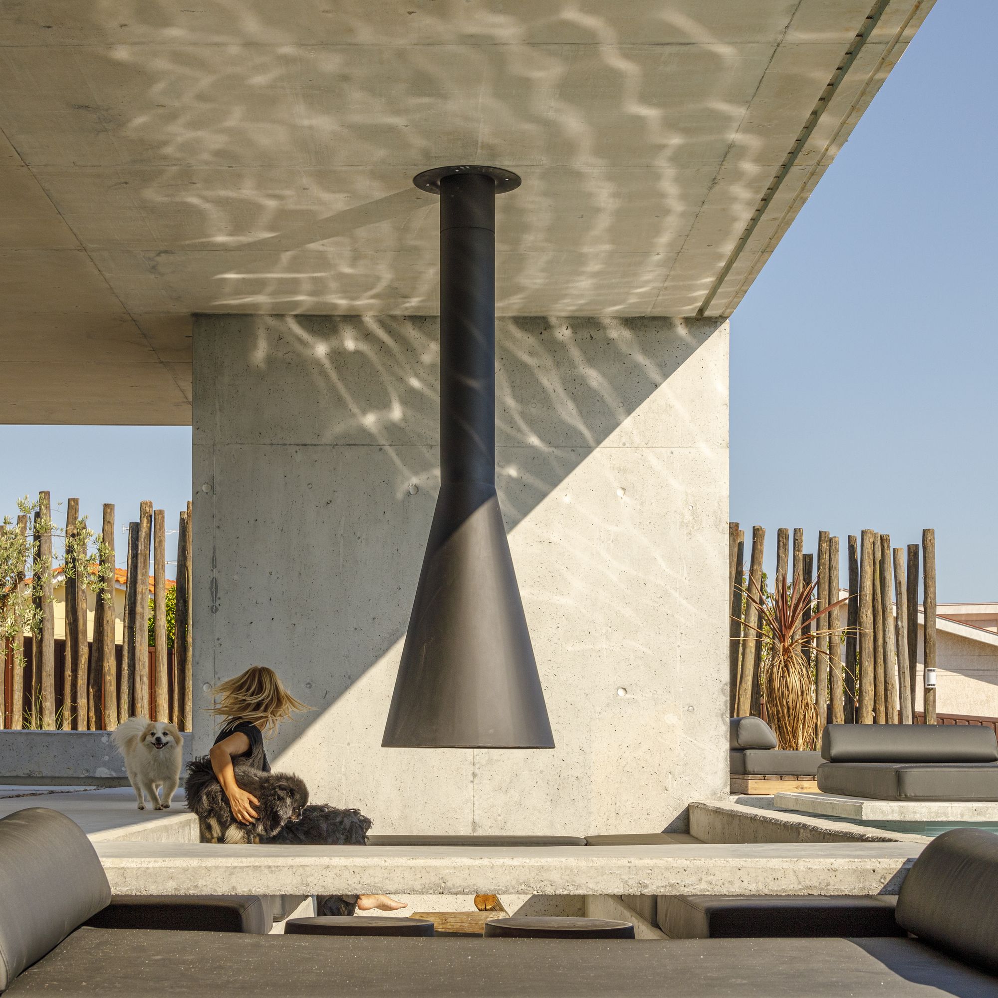 The latter is crowned by a longitudinal concrete platform whose pool and water mirror shelter the garage at the lower level.