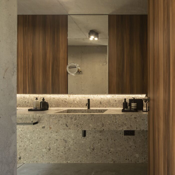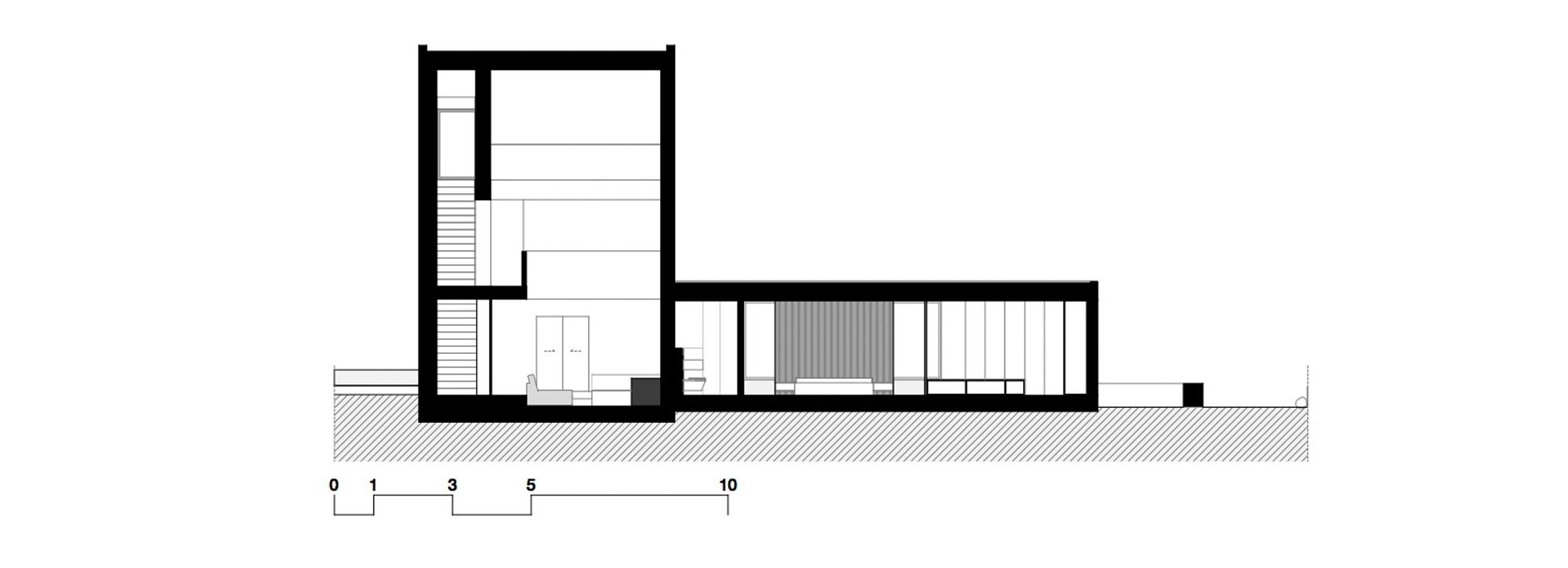 This verticality is also found in the living room unfolding into an uninterrupted indoor height though the floors. This allows for the living room to be contemplated from the study and guest room both upstairs.