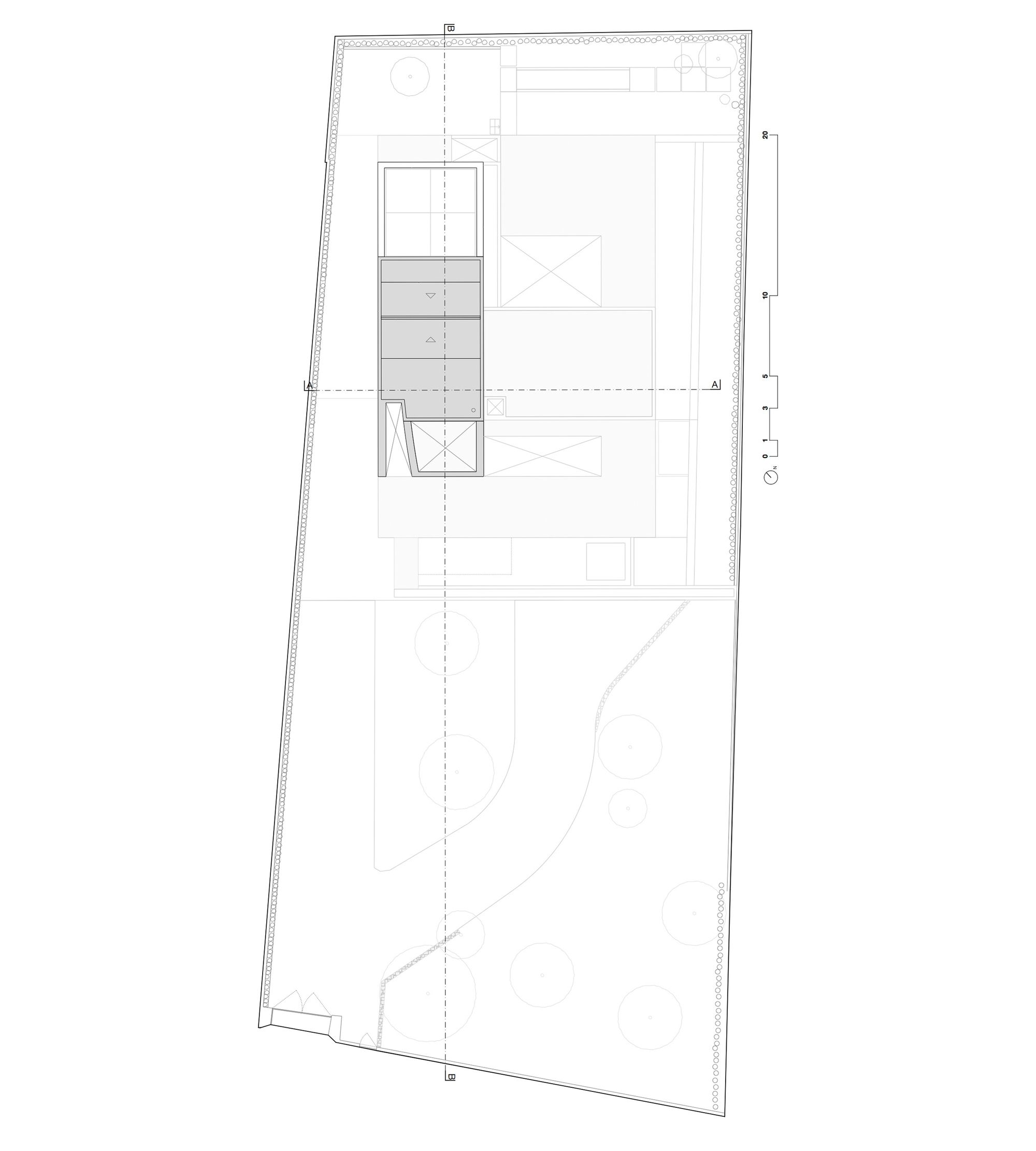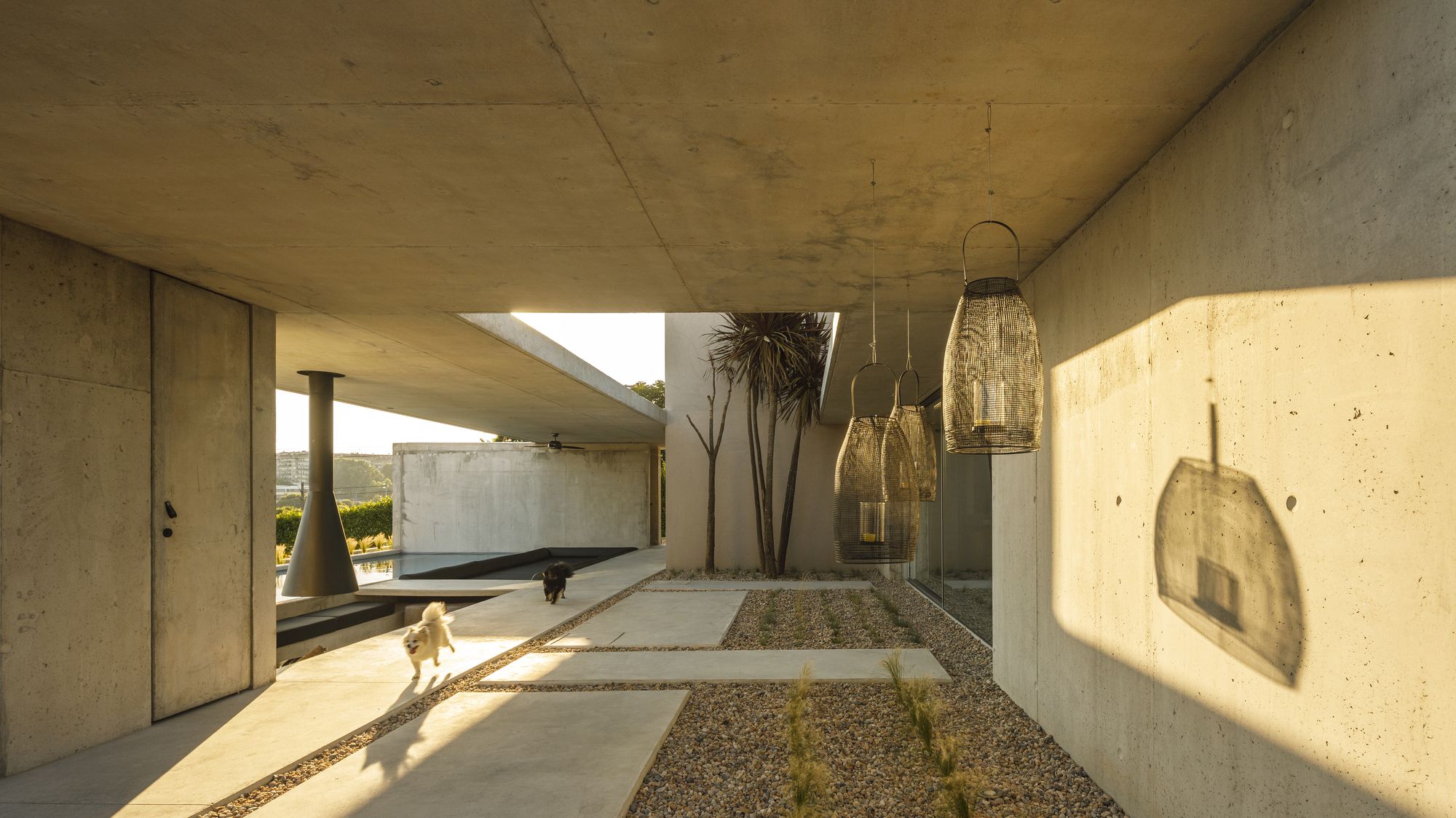 Around the pre-existence of concrete sheets, which create covered living areas around vegetative patios, providing different moments of living and dining areas to the east.