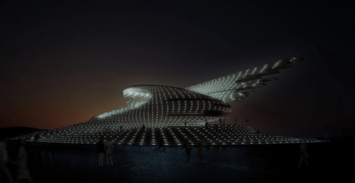 The stacked (apparently) timber masses flow together to create a form that holds its occupants while itself being held by circumstance. Placed atop an old mining site, it stands as if being a wisp of breezing from the mouth of a cave (or a mine). Form turns in on itself to create a main auditorium space for contemplation and inspiration alike. This flowing form continues on its path before fragmenting and terminating as if in the middle of a question. This is the past, what do we thing of the fut.