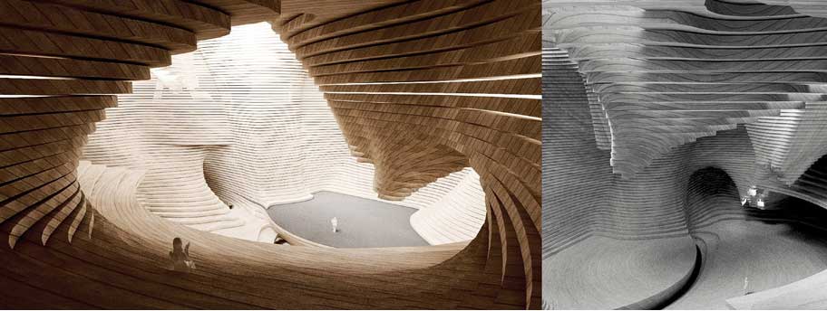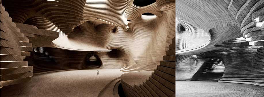 Rather than the flourishing exterior, the inside of the Opera Theater reveals wood-clad cavities where every seat in the house is different. Not only will the building have little havens of picturesque hanging gardens, but the architecture of the entire structure is organic – bringing the sensory experience of nature to the site on a grand scale.