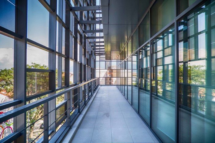 In this project, it was very important to create a high quality work environment so we challenged the traditional double-skin facade section of the building in order to also offer shaded balconies that surround the office space. The one outer skin is arranged using modular BIPV panels, while the other using painted glass shadings. When these two come together, they account for an irregular rhythm of shadows on the interior of the building and create a light controlled comfortable office spaces.