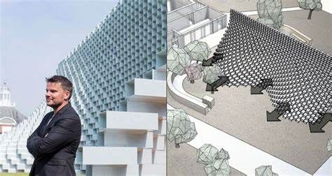 Every year the Serpentine Gallery commissions an Architect to design a pavilion which will sit on its yard, greeting the hundreds of thousands of people who will visit over the summer months. This year’s Serpentine pavilion, designed by Bjarke Ingels Group, is a complex sculptural form that can be constructed using simple geometric rules. The Pavilion is described by the Danish architect as “both transparent and opaque, both solid box and blob” The Pavilion by day houses a café and free family activities and by night hosts the Serpentine’s acclaimed Park Nights programme of performative works by artists, writers and musicians. This year’s Serpentine Gallery Pavilion is designed as a soaring and curvaceous structure that returns to one of architecture’s most basic elements: the brick wall, resulting in a dramatic shift between a straight line and a three-dimensional space. In detail, the repeated brick geometry embodies the playful spirit of Lego and Minecraft. The design is based on the idea of an “unzipped” brick wall, recreated using hollow rectangular fibreglass blocks. As a whole, the structure fits together with the calculation and precision of an algorithm. “We liked this idea that, quite often, interesting things happen when you change seemingly incompatible elements and you combine them into a new hybrid – we call it BIGamy!” said Ingels The North-South elevation of the Pavilion is rectangular, while seen from the East-West elevation as a curving silhouette. It also changes from opaque to see-through, depending on the viewing angle. Bjarke Ingels explains his design saying: “This simple manipulation of the archetypal space-defining garden wall creates a presence in the Park that changes as you move around it and as you move through it. The North-South elevation of the Pavilion is a perfect rectangle. The East-West elevation is an undulating sculptural silhouette. Towards the East-West, the Pavilion is completely opaque and material. Towards the North-South, it is entirely transparent and practically immaterial. As a result, presence becomes absence, orthogonal becomes curvilinear, structure becomes gesture, and box becomes blob.” Photographers at the press event included Luke Hayes and Iwan Baan, who both shared their own images on Instagram. Ingels has been sharing images of the structure ahead of the publication of official photography, an image of the blocks during construction with a caption saying “Minecraft”.