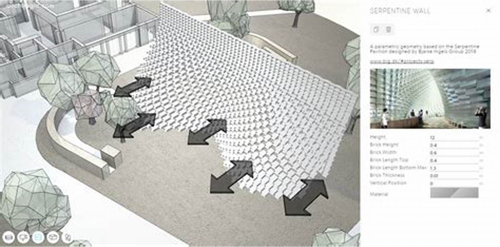 This is the 16th structure commissioned by the gallery as part of its summer pavilions series. Each one is awarded to an architect who has yet to complete a significant building in the UK. Ingels pavilion stands in the front of the original Serpentine Gallery building in Kensington Gardens, which is one of London’s Royal Parks. For people who cant make a visit to London, archilogic offers you a virtual opportunity to visit the pavilion, you can interact with any of the virtual scenes below by hitting the 3D button. If you have a Google Cardboard or similar VR device, a small VR button will pop show up when you open the model on mobile. You can interact with any of the virtual scenes below by hitting the 3D button. If you have a Google Cardboard or similar device, a small VR button will pop show up when you open the model on mobile. “We modelled the pavilion using web technologies, following simple rules; starting with a brick, reusing the brick to create a wall, ‘unzipping’ the wall so that it’s base follows a curve. Building a model by defining rules allows us to change the components of the wall, the height of the bricks, the shape of the curve, in the end generating a new unique Serpentine pavilion without tediously remodelling everything. Modelling this way is powerful, with a few changes we can explore the infinite possibilities of the wall system.” Archilogic. Serpentine Pavilion opens to the public from 10 June to 9 October 2016.