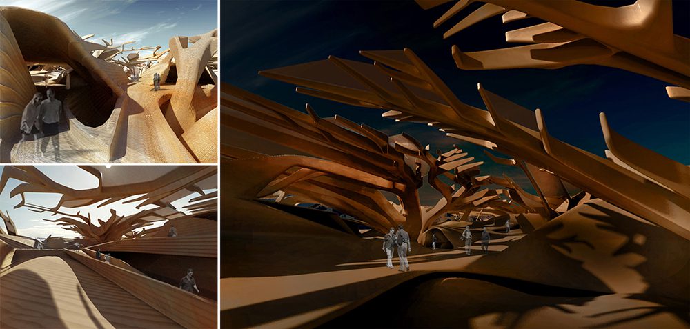 DuneLab further explain they have gained inspiration from innovative technological instruments such as: the new CNC drilling machine, the composite D-Shape 3-D printing machine by Enrico Dini, and most importantly: the geological scanner which is self-sufficient and uses locally extracted/locally available sources. The human element involved requires for more than just light intensity control: there are narrow and protected pedestrian pathways, striated walls and built-in furniture and the areas underneath are shaded using fabric shading systems . DuneLab’s research project explores not only an extreme environmental condition for the development of urban organisms and living spaces, but the inform of the new and innovative methods of enhancing architectural production that could remain self-sustained.
