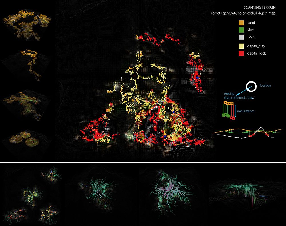 Inspired by the specific dune patterns and erosion processes, the team creates a design based on striae, contours, and caverns in order to complete the visual aesthetics of the object. The design process starts off with an initial scan of the landscape with the use of swarming robots for the gaining of geological data and conditions. Afterwards, the team is able to generate a Height map with the geological consistency of the area and the next stage is set: mapping the building on site, excavating and 3D printing.