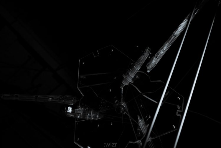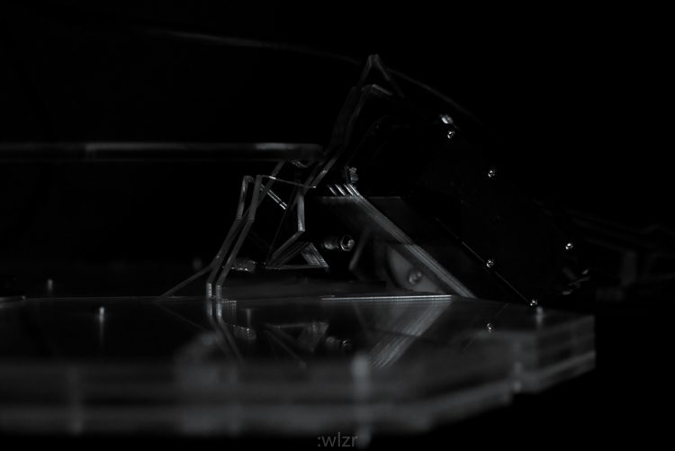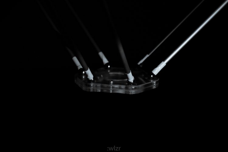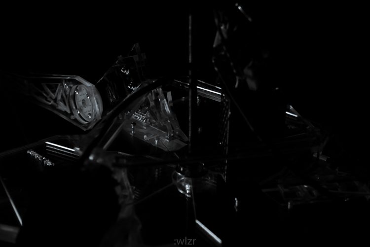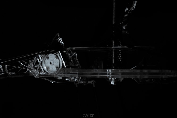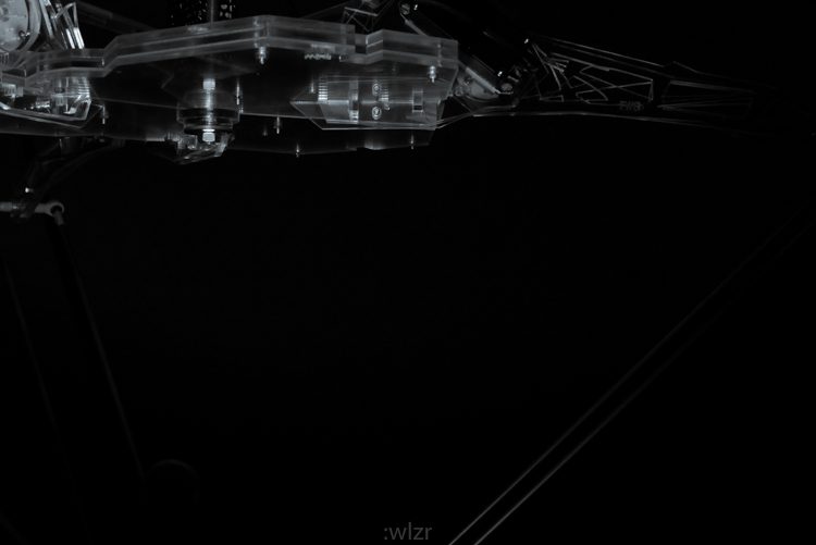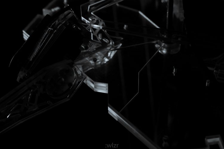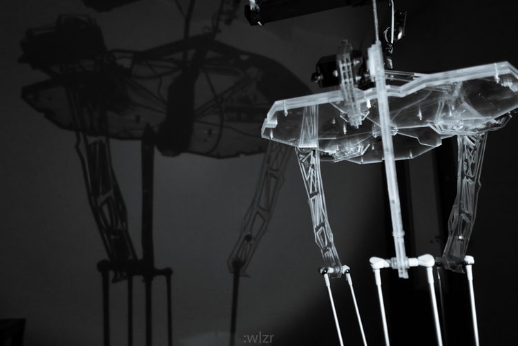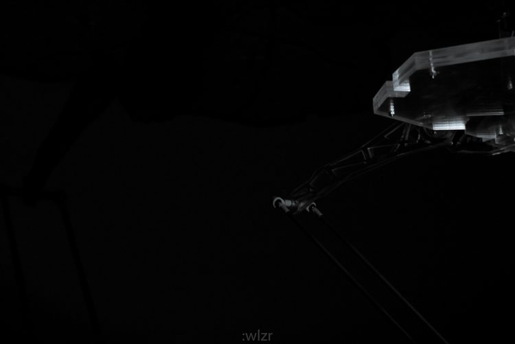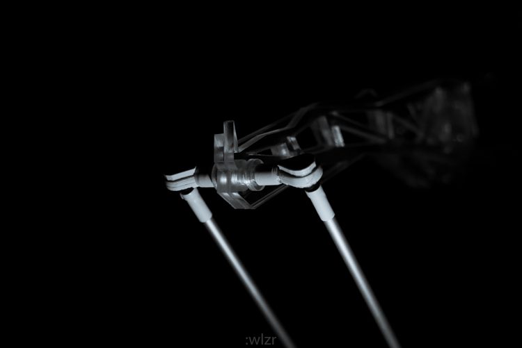 A delta robot is composed of three two-segment arms/legs mounted in 120 degree intervals. The arms and legs use parallelograms to restrict the motion of the “wrist”, the end effector. Wrist and elbow use ball magnets in order to keep the distance but not a certain angle. That is the magic of the kinematics and it’s interesting to watch how the position of the effector is constantly being negotiated between the three servos.