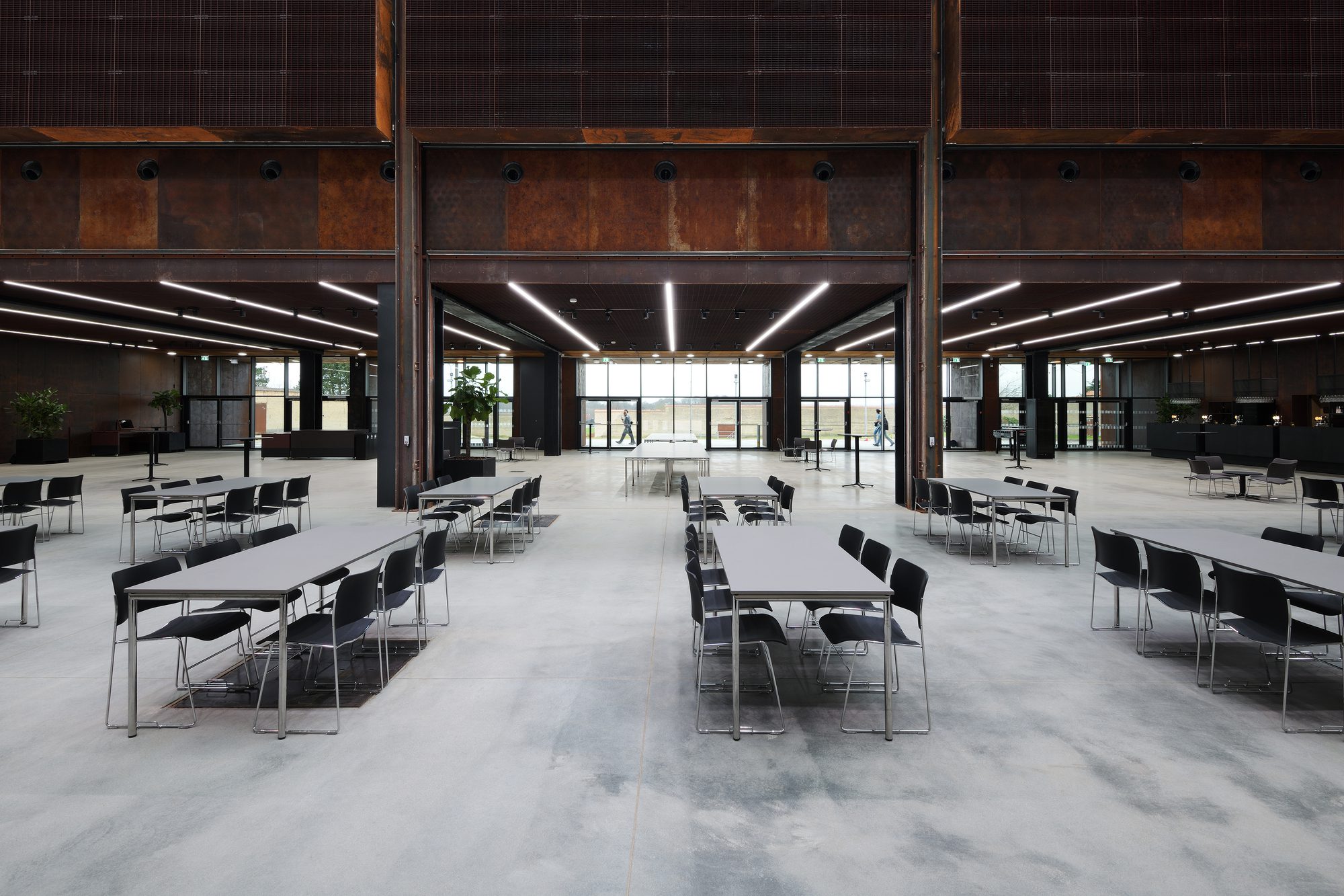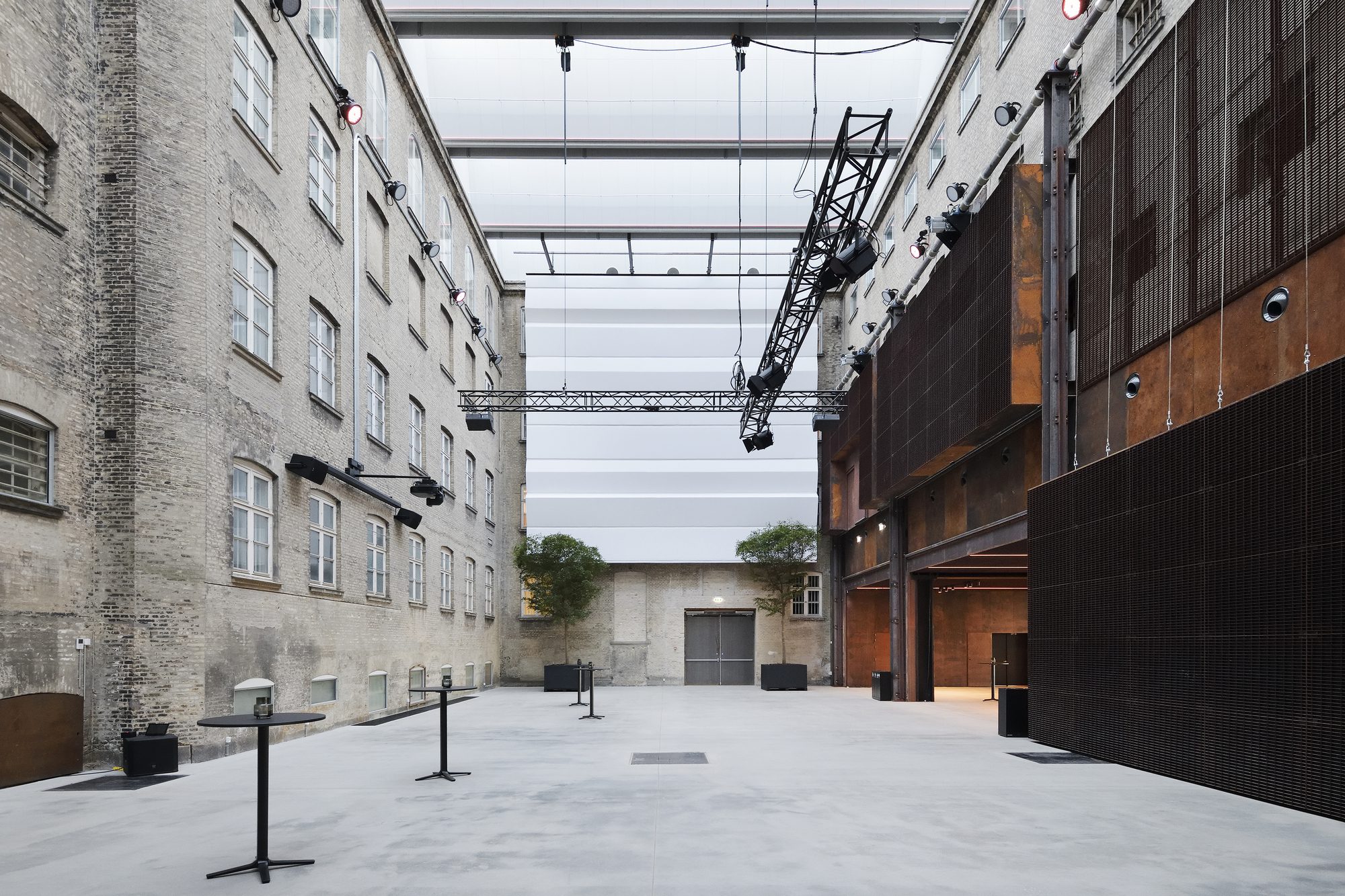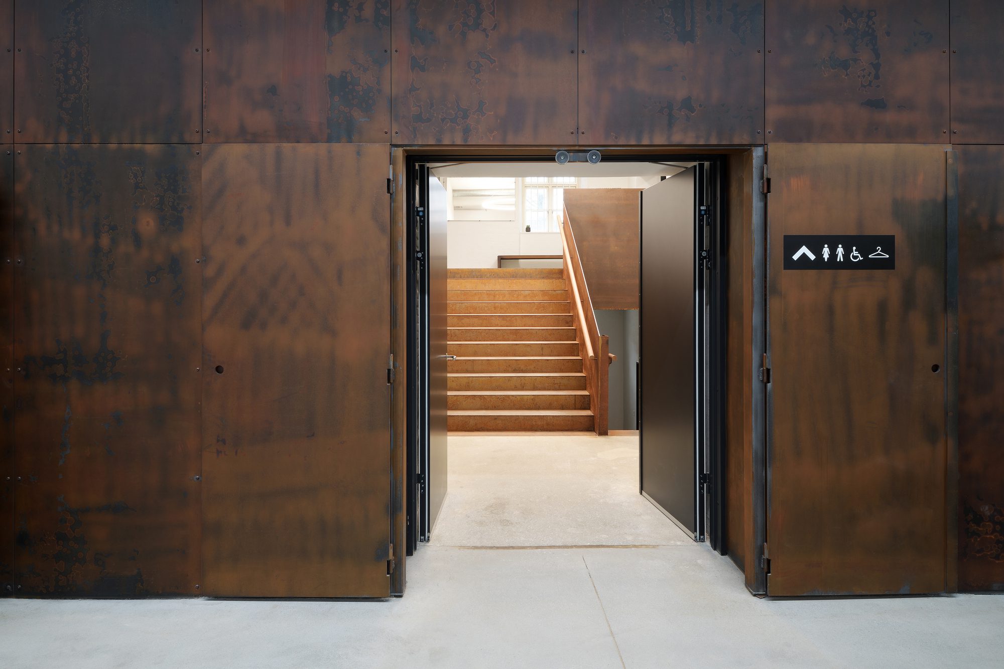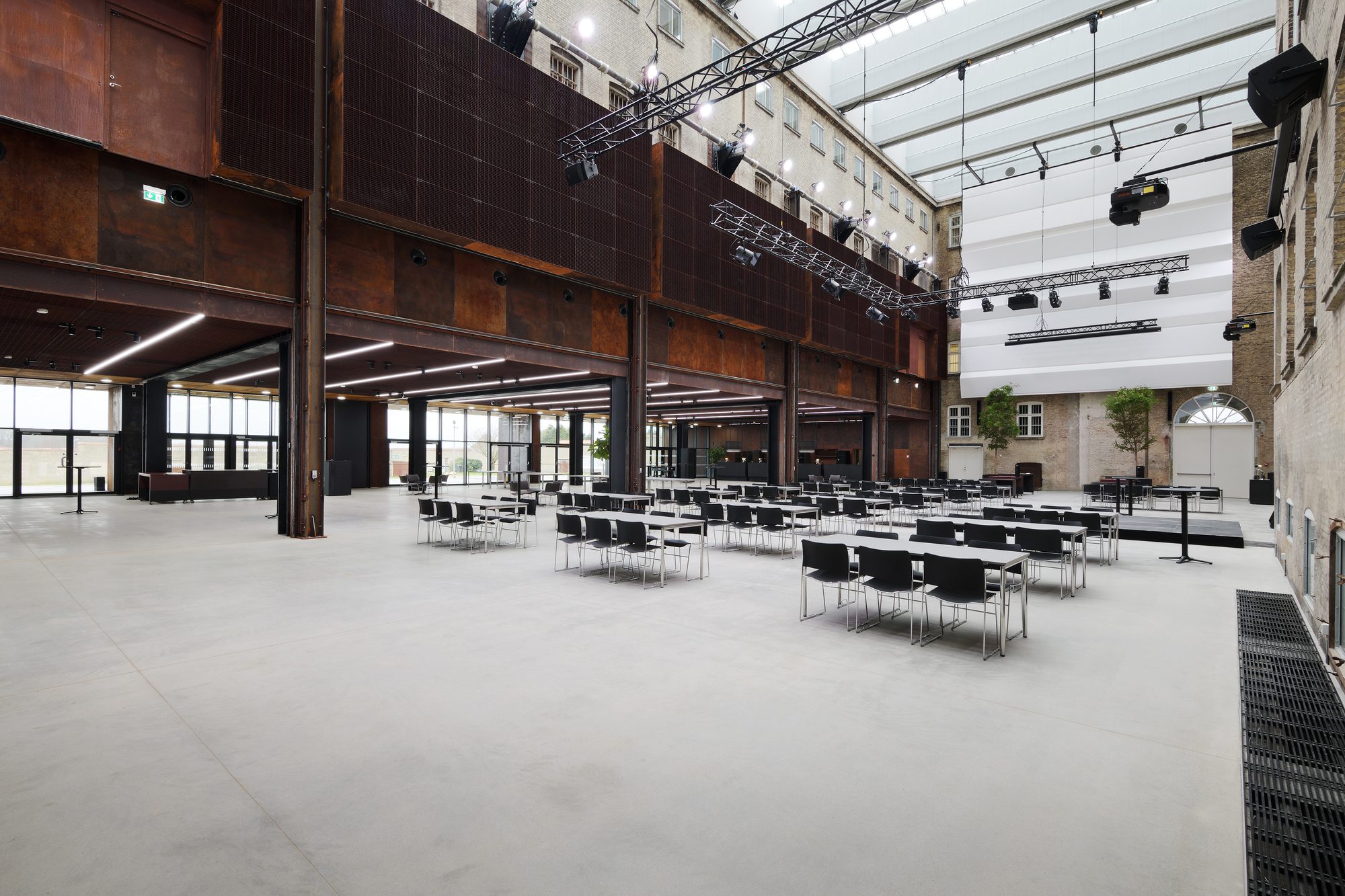 In 2006 the gates closed behind the last prisoner and since 2012 the prison yard has been used for concerts and other events. To meet logistics and emergency regulations openings were cut in the prison wall and massive steel gates were inserted. The gates are now covered in a red, rusty patina that naturally blends in with the old brick walls. The new West Hall opens the building in a similar way, with rust-red steel covering the holes where needed. The West Hall is a flexible event room that can be divided into three smaller rooms: The Inner Yard, The Big Hall, and The Little Hall. The halls are flexible for individual use, and they connect in various combinations. The huge concrete plinth that juts into the prison yard is a natural extension of the indoor sanded, polished concrete floor and creates a large stageable area, useful for open-air events in the summertime.