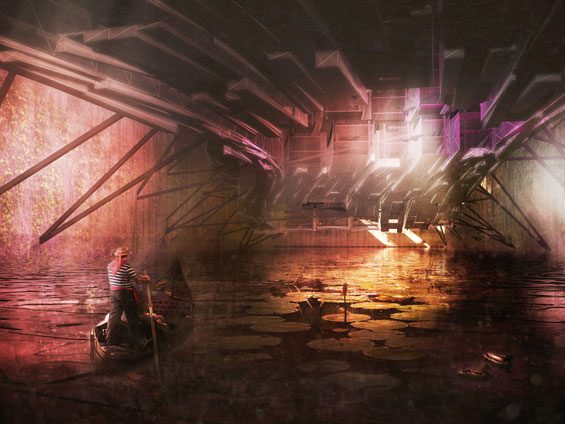 The inherent wetness in the low-lying area of the National Mall is exacerbated by the reopening of the Washington Canal as the ground level begins to flood. In addition to the naturally seeping ground water, the Capitol reflecting pool spills over the East canyon wall to create a waterfall which cascades down into the water below. Using Abraham StroockÃs invention of a synthetic root system which transports water through evapotransporative techniques, ganglia-like ribbons dip down from the roof surface and into the reservoir below. Water is passively transported throughout these fibers, allowing for a thick vegetative growth to take hold. Rather than rewriting the historic LÃEnfant plan, this project seeks to work within the bounds. In addition to the acknowledgment of the cityÃs limits, this project seeks a commentary on the future trajectory of growth within a city, with explicit attention toward the federal growth and spatial-composition within the confines of Washington DC.