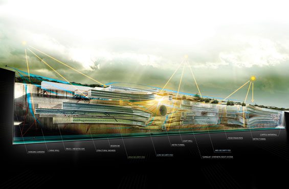 Our design is opposed to these grand edifices which break apart the fine mesh work needed for a city to thrive. The solution to these mega structures is not a building reaching ever-higher into the atmosphere. This would pull apart the connections we have with the ground and further disconnect the government from the city.  Rather, our proposal intends to dig into the earth, burying the program beneath whilst activating the ground plane.