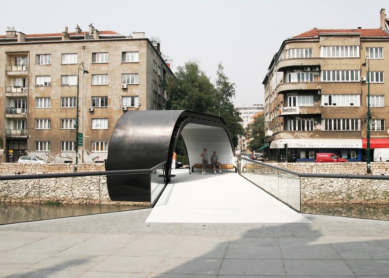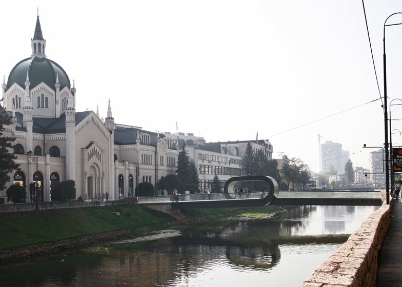 Five years ago, three Bosnian students from Academy of Fine Arts, Adnan Alagić, Bojan Kanlić and Amila Hrustić won the competition for the design of this bridge. This project, called “ Festina Lente ” is localised outside of Academy of Fine Arts in Sarajevo and offers a loop inside the bridge. Festina Lente, which in Latin means “make haste, slowly”, the looping bridge spans 38 metres over the Miljacka river and loops-the-loop in the middle to create a shelter with two seats. More details from the architects after the jump.