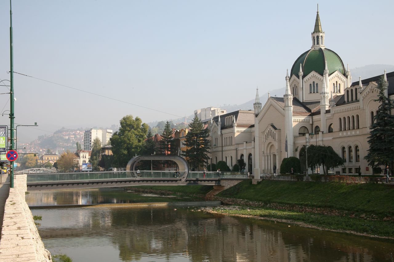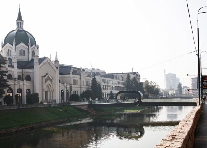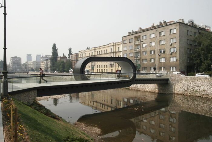 The basic idea of the bridge is the union of the secular and spiritual and to establish a balance between left and right side. Crossing the bridge is a unique experience because of its specific layout and the views that we encounter when going through the gate (the closed part of the bridge), preparing us to enter into another dimension and awake spirituality. Technological solutions and the modern design of the bridge become the brand of Sarajevo. The tender for the construction of a pedestrian bridge was announced in 2007, and five years later the bridge was built. The bridge construction is steel with aluminium trim and a glass fence. The bridge spans 38 metres. The bridge creates a true “genius loci” appropriate to the area in front of the temple as the Academy of Fine Arts. The former church, today the Academy of Fine Arts, was built in the time of the Viennese secession.
