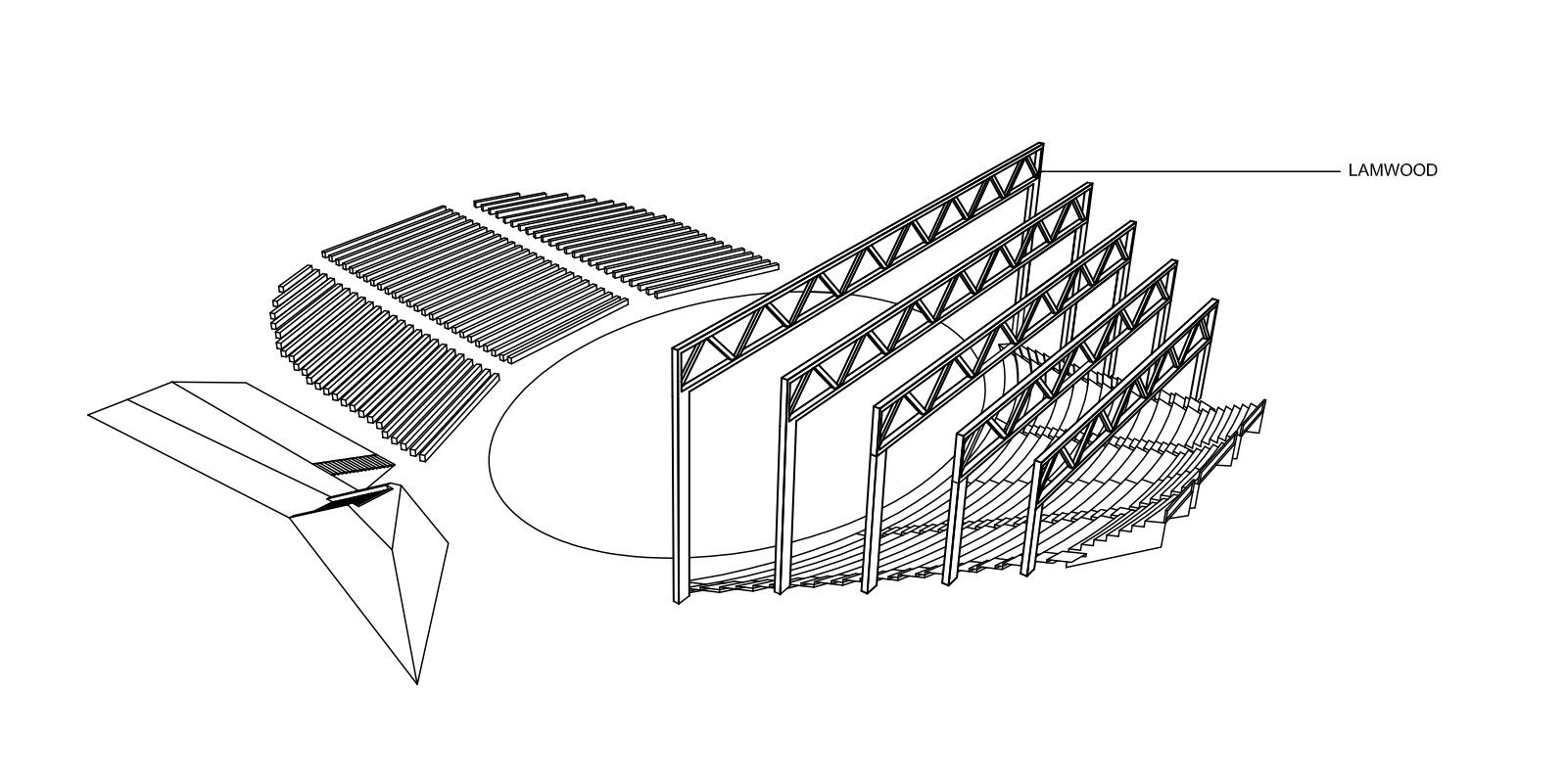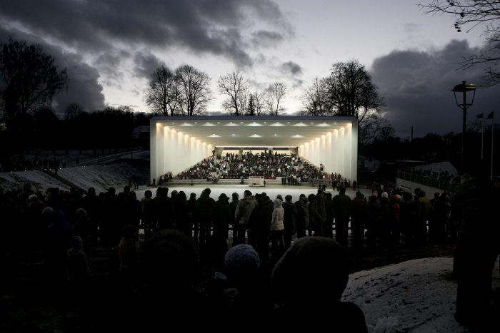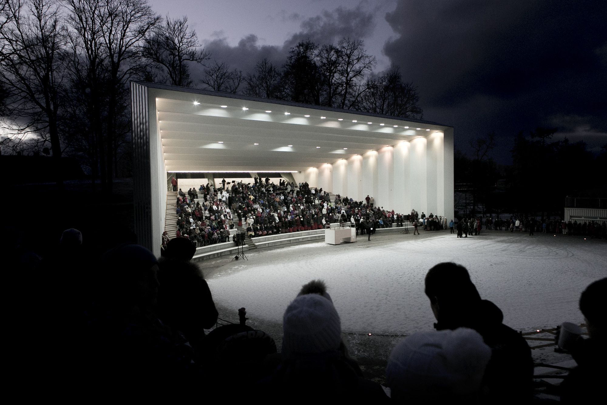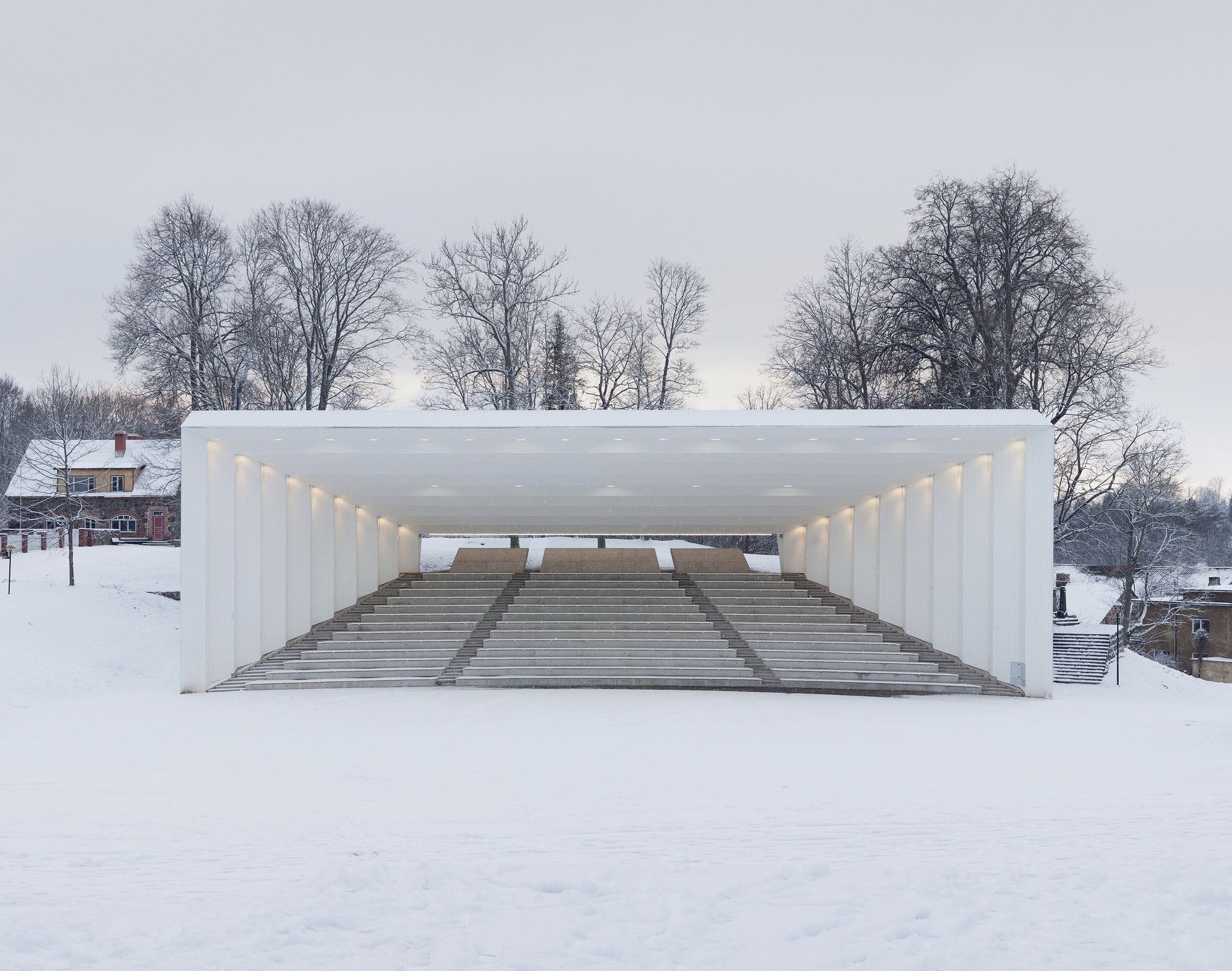 Festival arena design is derived from the aspirations of acoustically pure sound. The inner surface of the bandstand is articulated enough to eliminate the need for electronic amplification. Taking account of the delicate location (site of the former manor park, Viljandi Town Heritage Conservation Area), the out building is designed to fuse with the landscape.