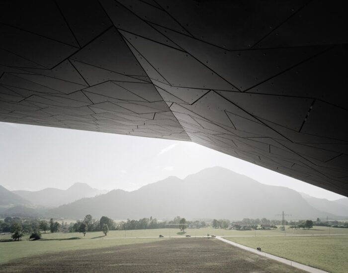 Designed by Delugan Meissl Associated Architects, The geometry of the Festival Hall developed from the topographical conditions, placing it in an adequate relationship with the existing Passionsspielhaus. The building’s form and positioning both relate to the impressive landscape setting defined by the rock formations in the back, and to the dynamic presence of its neighboring historical counterpart. This existing building and the new one are oriented towards one another. They complement and elevate their respective architectural articulation of the reference to the landscape by interacting visually with one another.