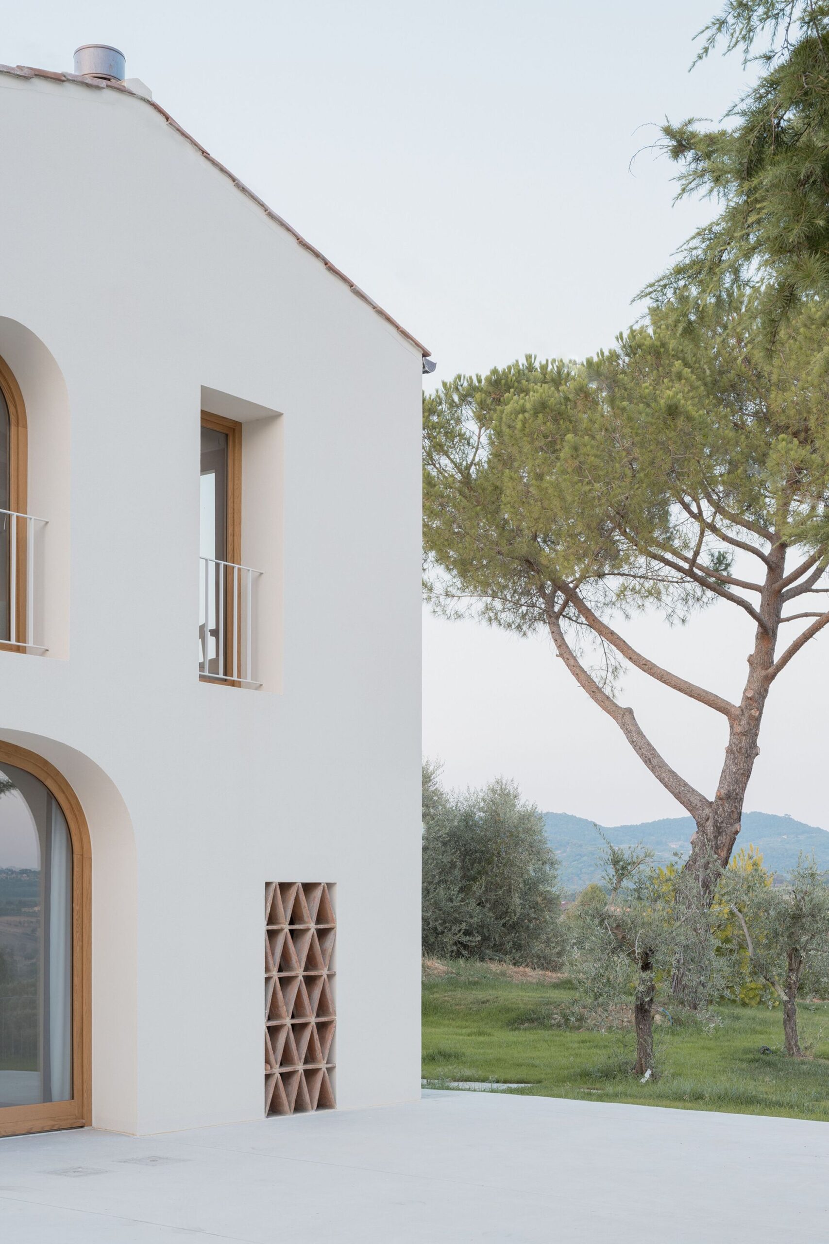 The decision to place the living area on the upper level and the sleeping quarters below is an exception to conventional layouts. This arrangement allows the bedroom to remain a more private and enclosed space while enhancing the openness of the living and kitchen areas. Although the design prioritizes intimacy in the sleeping quarters, the existing openings, left unchanged in both size and position, frame expansive views of the rolling hills and surrounding countryside, cultivated with vineyards and olive groves. Some openings, particularly those corresponding to the barn’s upper level, reinterpret traditional mandolati (the lattice-like brickwork typical of rural architecture), maintaining natural ventilation while offering protection from the sun. The project stands out for its deceptively simple composition, skillfully reinterpreting elements of traditional rural architecture to redefine domestic life within a building that openly embraces its historical roots.