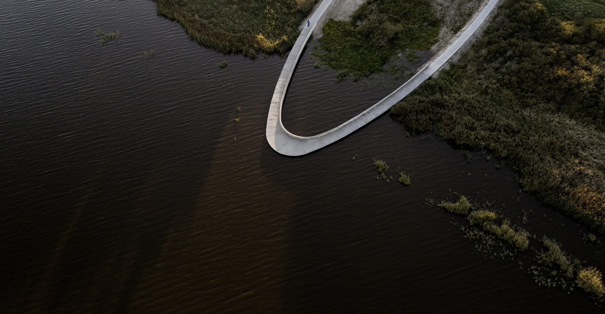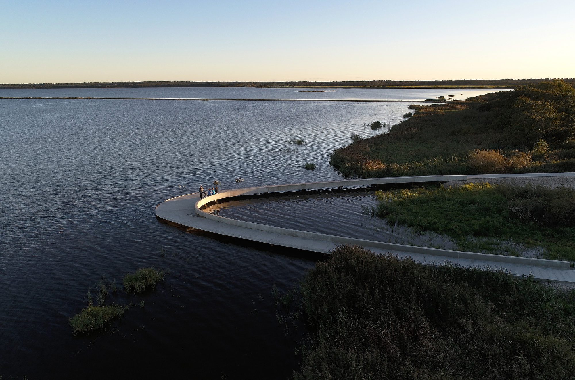 The Solution – The visitor’s center consists of an access road, educational facilities, a landscape bridge, and a parking lot for visitors. The access road winds its way through a spectacular and protected landscape towards the parking lot and the large ellipse-shaped bridge, which in a single gesture anchors the building and unfolds the large horizon, created by the reflection in the water. From the bridge, it is possible to experience Filsø and the vast and spacious landscape. In a single, panning movement, visitors can get very close to the water’s surface and the unique nature of the area. The ellipse shape accentuates the continuous movement through the area from arrival to departure. The bridge is designed with a solid seating edge, which offers visitors the possibility to take a break, sit down and enjoy the view. The school building, which functions as an anchor for the ellipse and counterpoint to the lake, follows the curved structure of the visitor’s center and thus becomes a natural part of the unity – and the movement in the landscape. The vertical shutters of the building mirror the nearby forest.