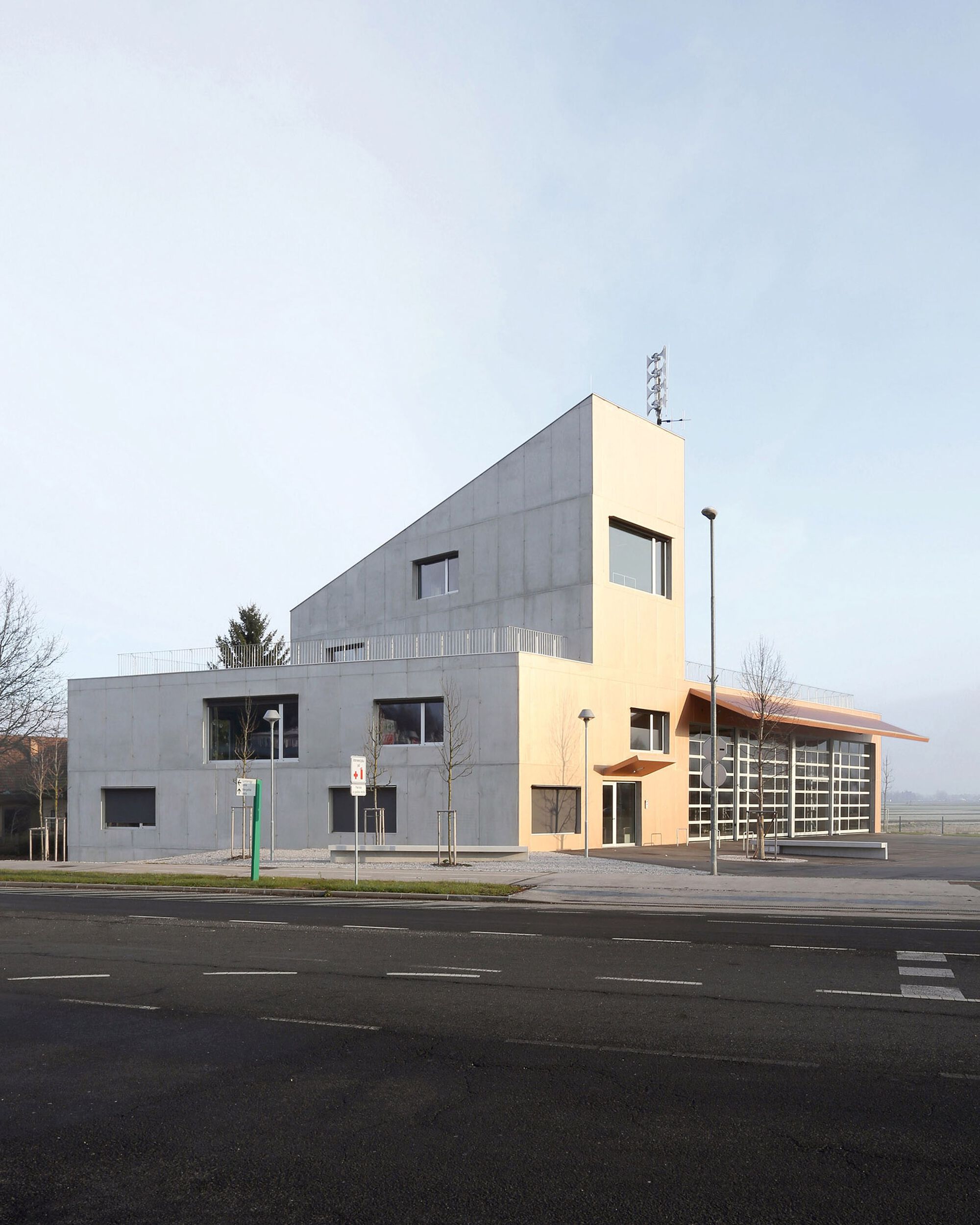 Fire and Rescue Center Trzin, The protection and rescue centre is situated at the entrance to the old part of the municipality of Trzin. Its appearance is inspired by the traditional fire station typology with the characteristic tower (for hose drying), which becomes the new spatial dominant, a symbol signaling arrival in Trzin.