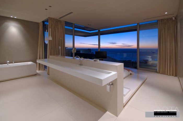 The property, and subsequently the plan of the house, focused on Camps Bay beach, and the views of Lion’s Head in a Northerly direction. There are also great views back to The Twelve Apostles and the Cable Station. To capitalize on the views, meant that the design also needed to respond to issues of privacy with the neighbor’s property. Clerestory frameless glazing (skylights) replaced the structure and framed views which might otherwise have been missed. Sandblasting of the full height glazing at the eastern boundary enabled us to maximize light to the linear passage and maintain views of the mountain peaks whilst adhering to councils requirements and ensuring the privacy of the neighboring property.