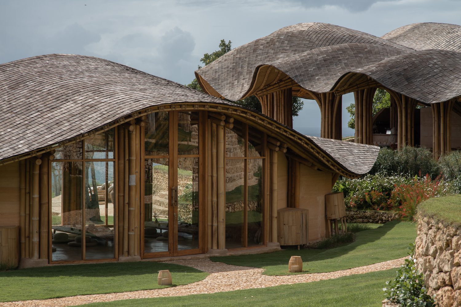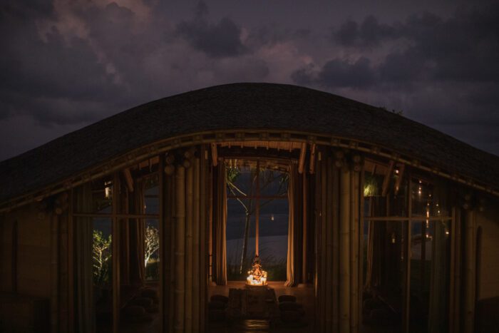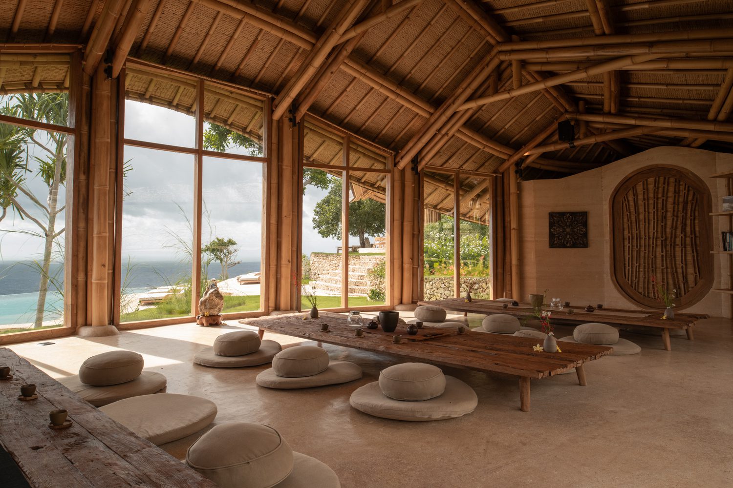 The Fish Tail Tea Room is designed for introspection and connection, embodying Intaaya Retreat’s philosophy of creating serene spaces in harmony with nature. The structure is entirely built with Dendrocalamus asper bamboo, treated and crafted in Bali. The walls are composed of rammed earth, using limestone from the site, while the floors are finished with locally sourced lime. Overhead, the handwoven bamboo ceiling enhances the artisanal texture.