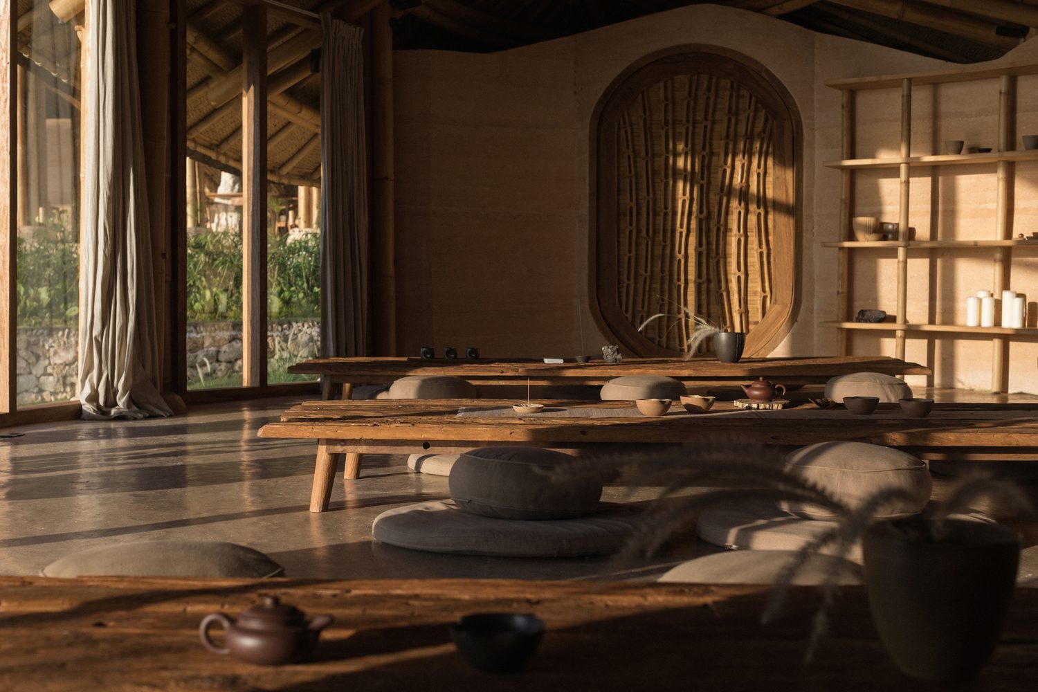 The interior design maintains a cohesive chromatic palette, reinforcing the relationship between space and materiality. The laminated bamboo doors, with an outer bamboo “bone” layer, add texture. Unlike other structures within Intaaya Retreat, the Fish Tail Tea Room was designed with greater enclosure, balancing seclusion and connection.