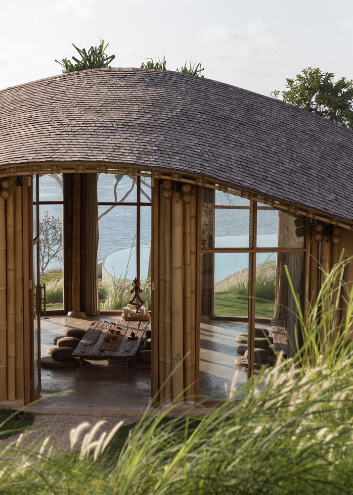This posed a challenge in thermal comfort, solved through passive design. The building faces south, slightly inclined east, optimizing ocean views while ensuring ventilation. Pivoting windows regulate airflow, while rammed earth walls and an insulated bamboo roof stabilize indoor temperatures.`