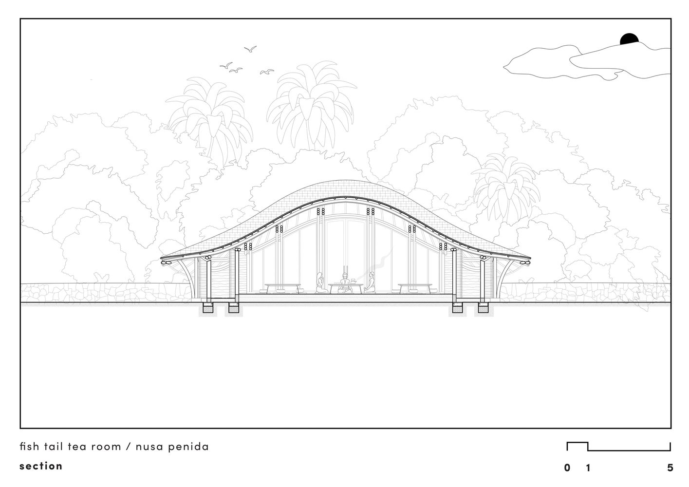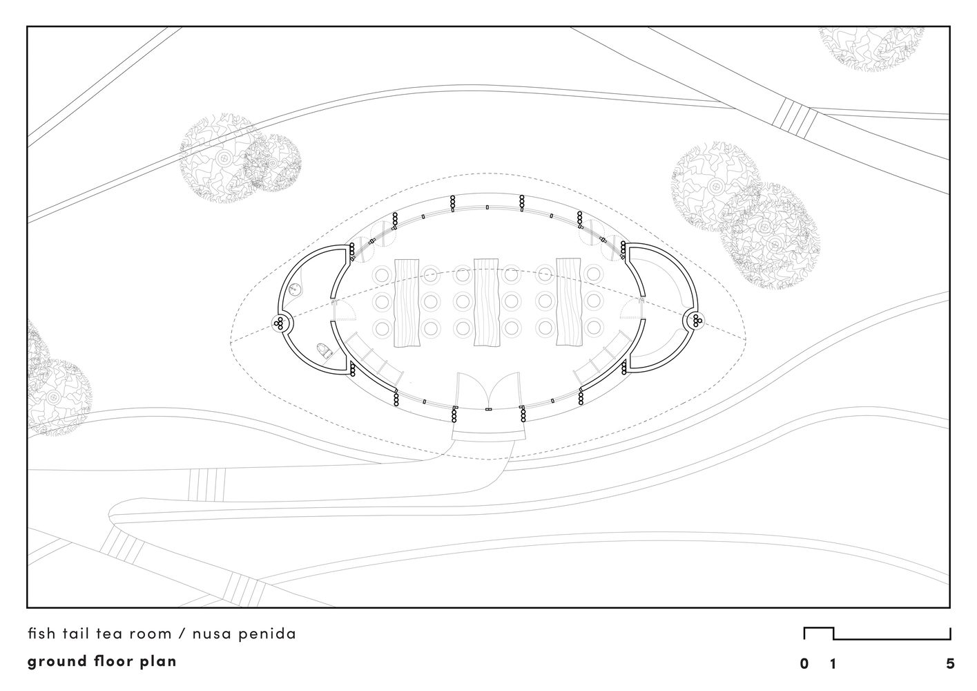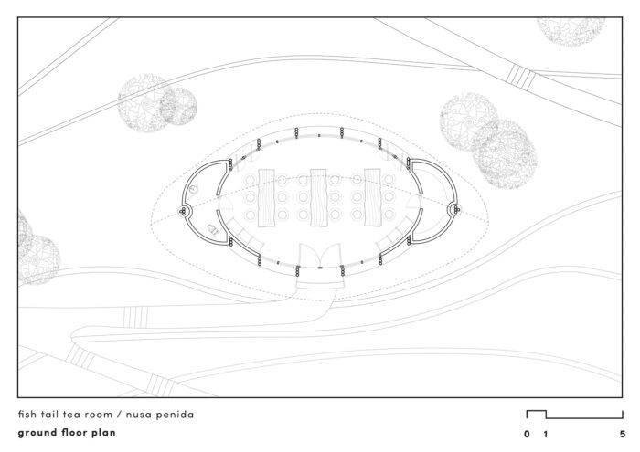 Structurally, the Fish Tail Tea Room follows its oval floor plan through six King Post trusses. At both ends, where the semicircles are located, two support points—each with four bamboo columns—allow for the roof’s extension. Curved purlins, formed by bamboo trios, establish the organic design flow.