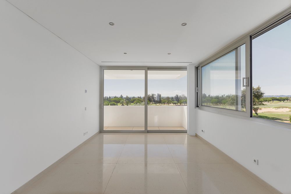 A golf course is limited by empty plots for detached houses and scattered trees of various types and heights. At the ground level an immense lawn is only interrupted by sandboxes and low vegetation arrangements.