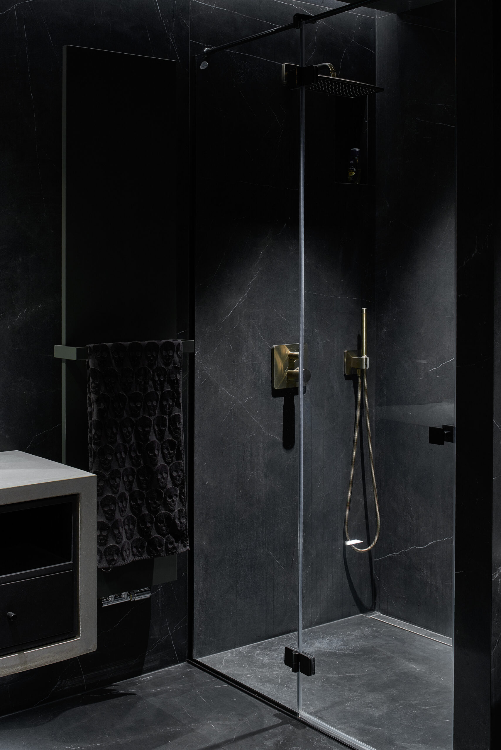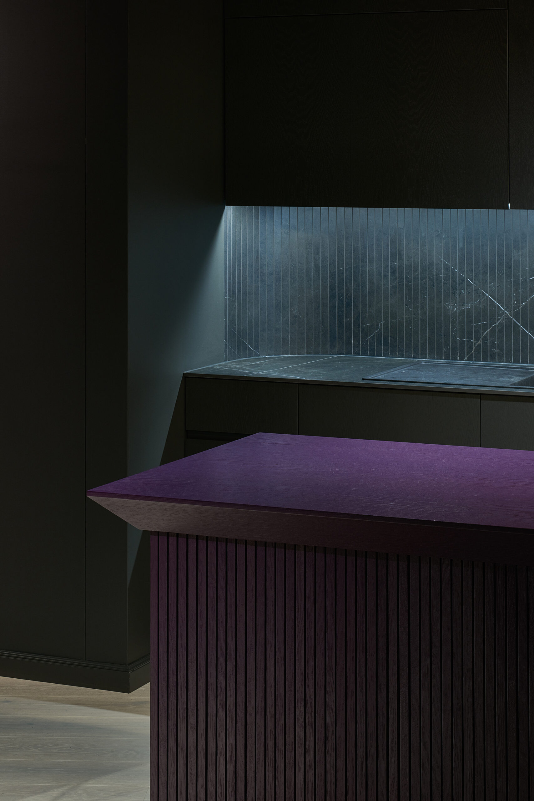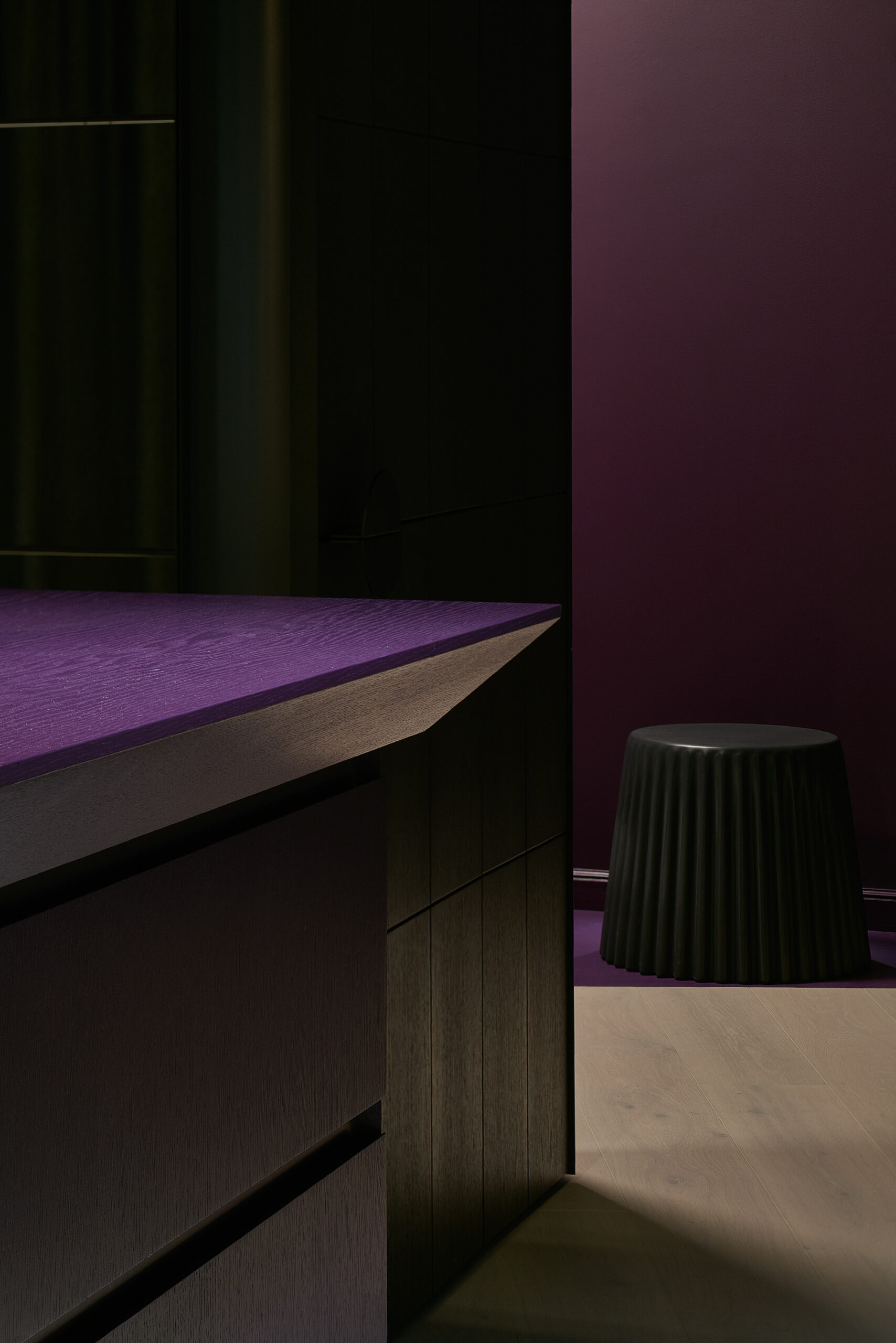 Flat in Black, Originally 2-bedroom apartment was converted into a single bedroom flat. The extra space was given to the living room. A complex geometry of living room was simplified by introducing a diagonal wall. This diagonal direction became the main feature of the living room. Floor direction, furniture and lighting are all aligned to the given diagonal angle. The diagonal wall also allowed the wardrobe layout in the bedroom to be more functional – more depth was given to the walk-in wardrobe and less depth was used for a regular wardrobe.