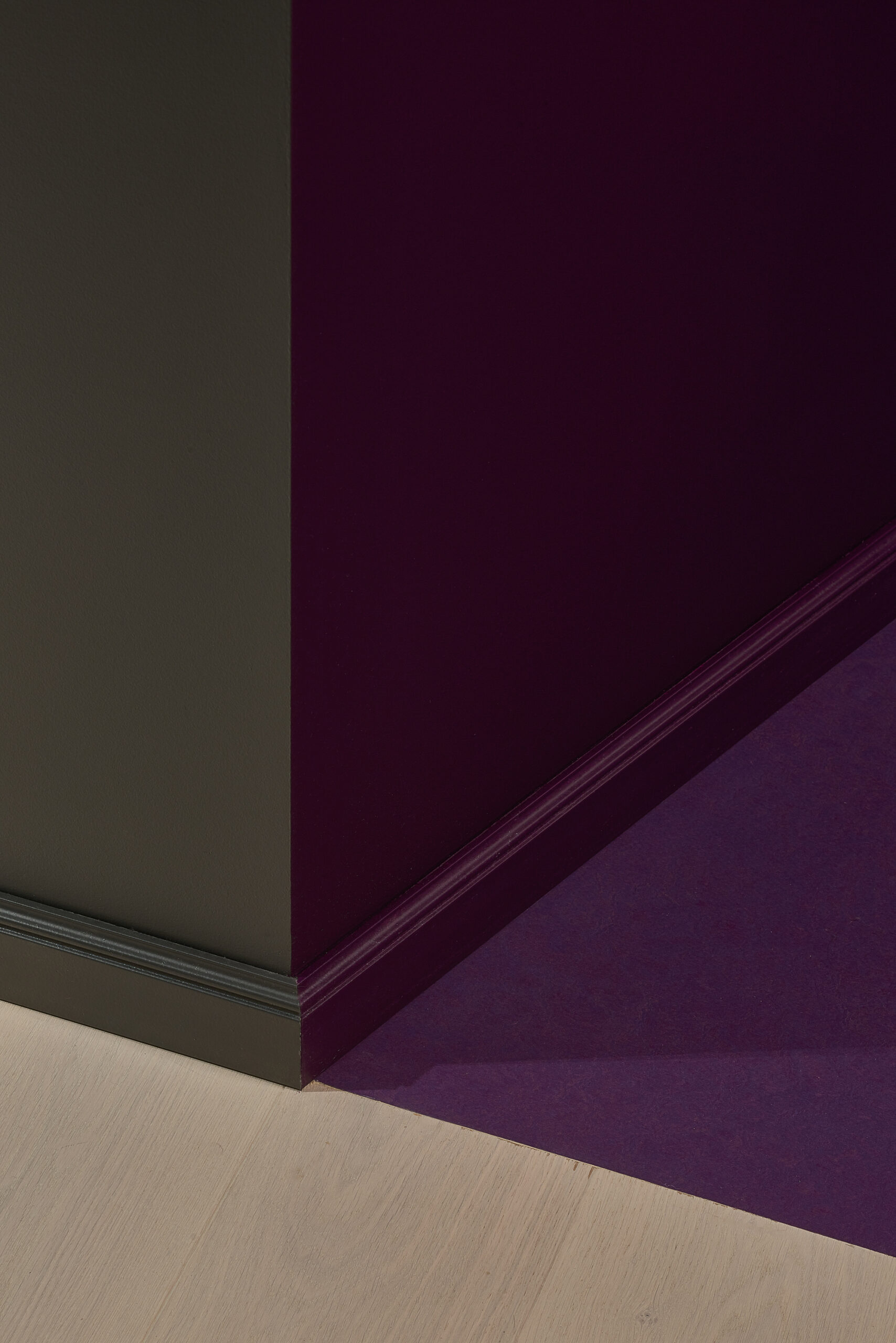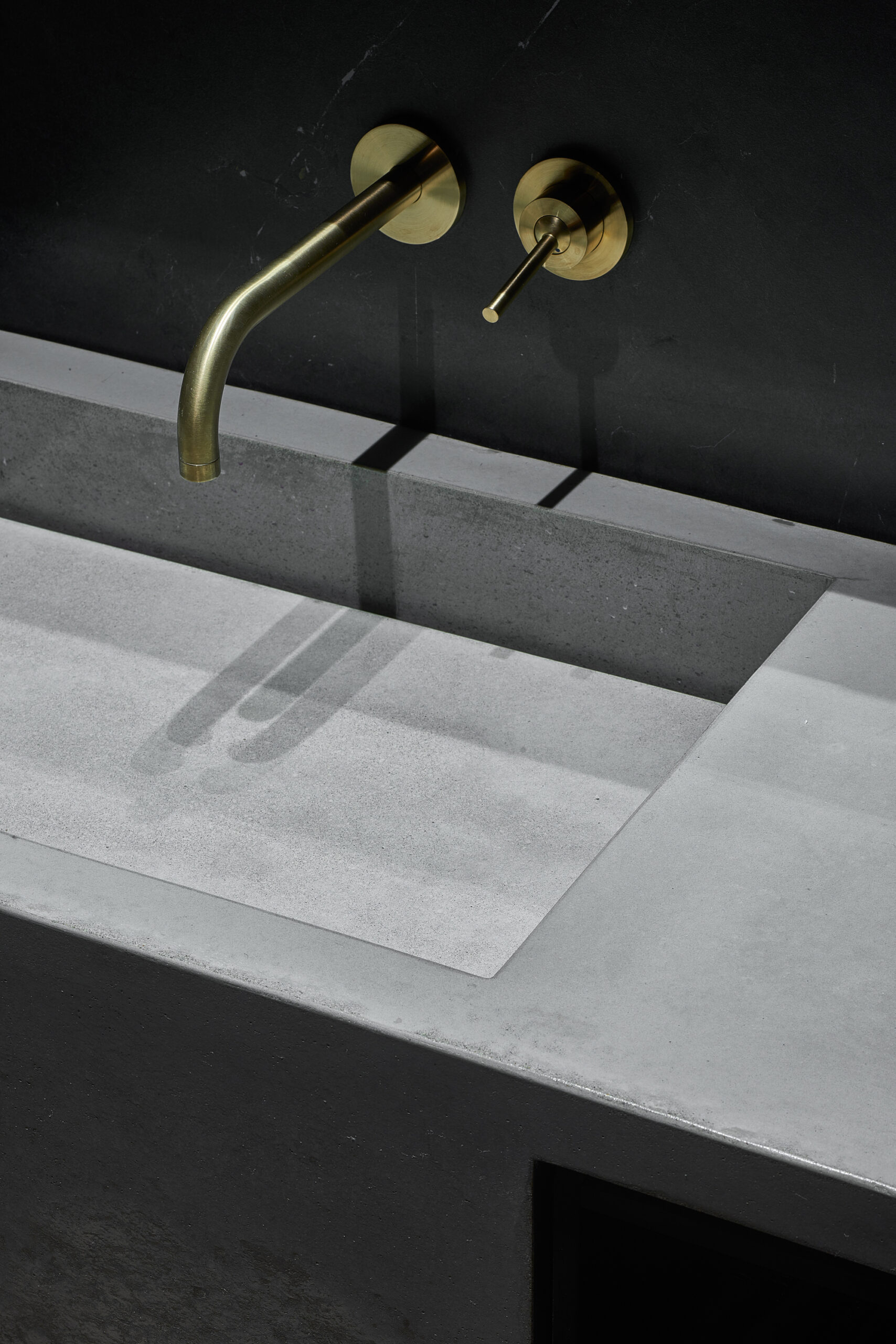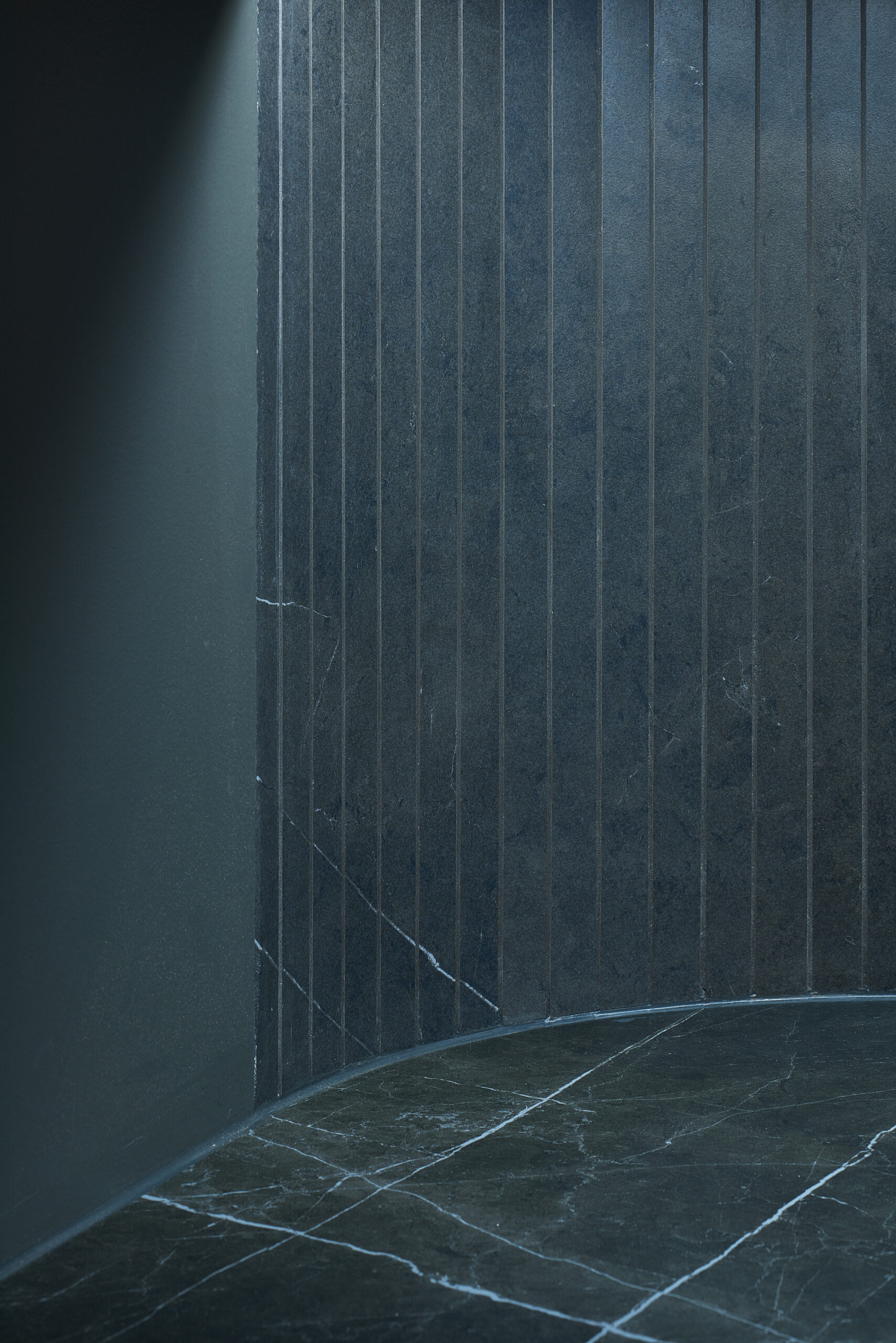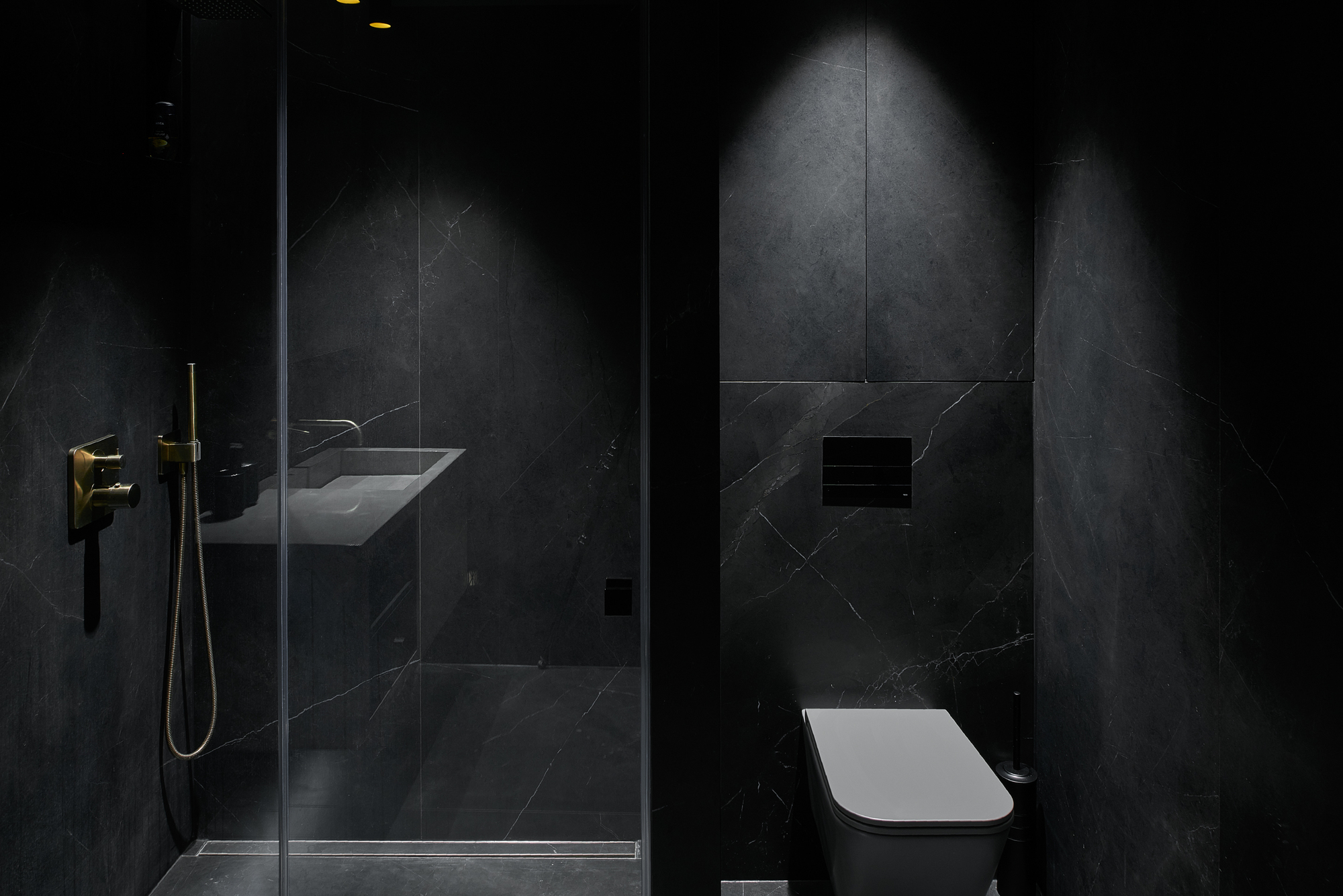 Flat in Black, Originally 2-bedroom apartment was converted into a single bedroom flat. The extra space was given to the living room. A complex geometry of living room was simplified by introducing a diagonal wall. This diagonal direction became the main feature of the living room. Floor direction, furniture and lighting are all aligned to the given diagonal angle. The diagonal wall also allowed the wardrobe layout in the bedroom to be more functional – more depth was given to the walk-in wardrobe and less depth was used for a regular wardrobe.