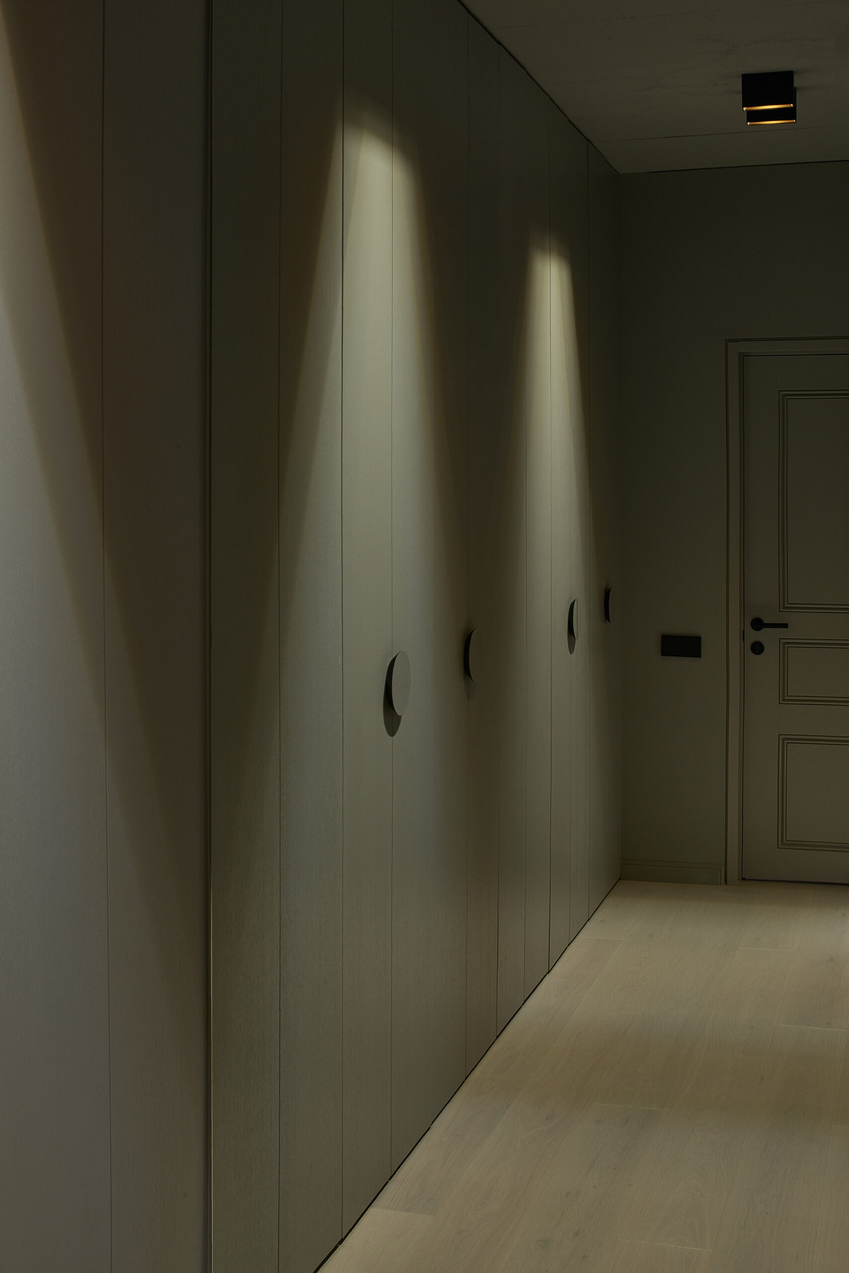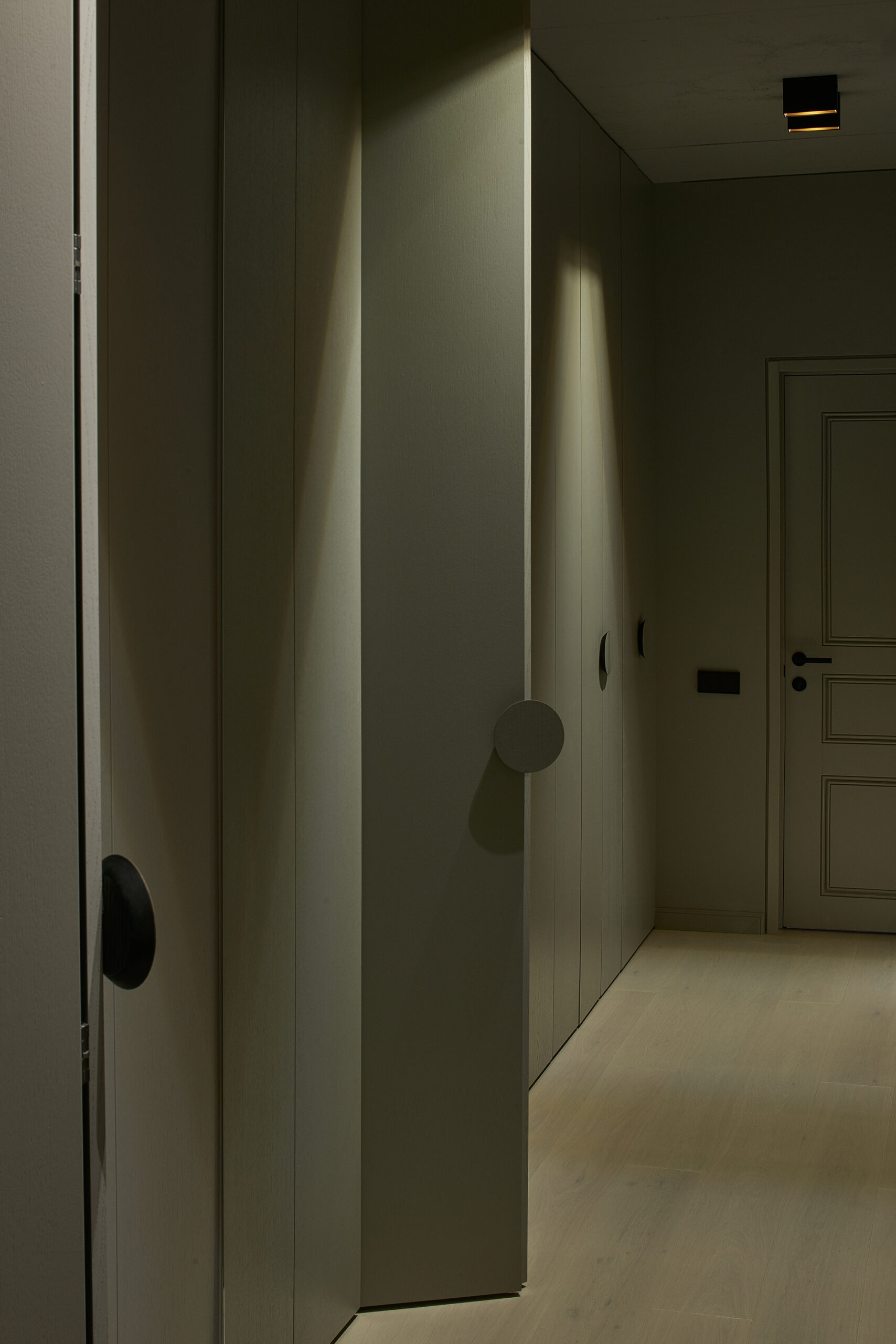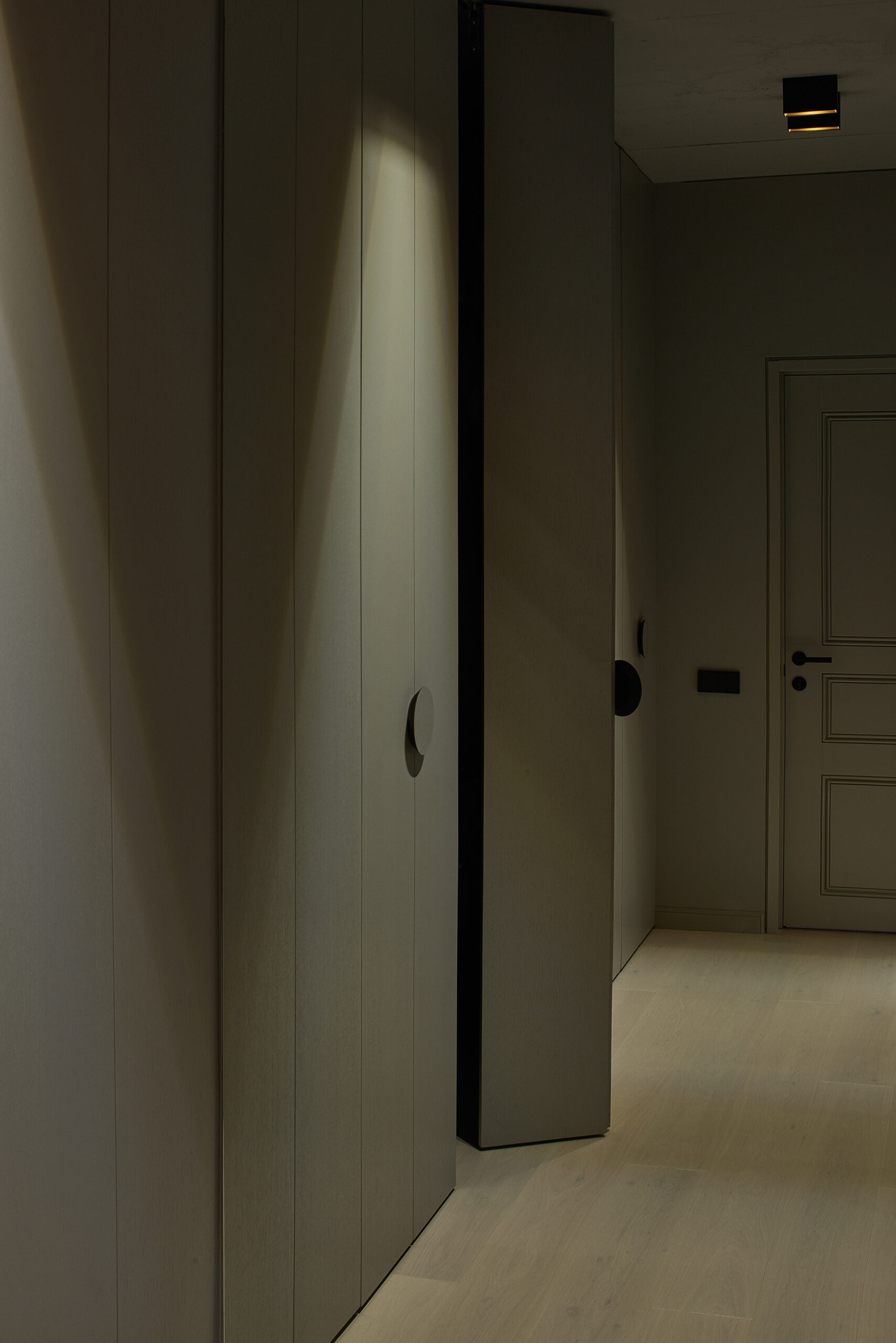The original apartment plan featured a chimney shaft, but the client did not want a fireplace. The chimney shaft was extended to form a bigger volume that helped to shape a separate entrance zone. This central volume houses a mirror, shelves, utility closet and a fridge. Moving the fridge out of the kitchen niche allows a strictly horizontally oriented kitchen furniture design without any vertical furniture where typically fridge is.