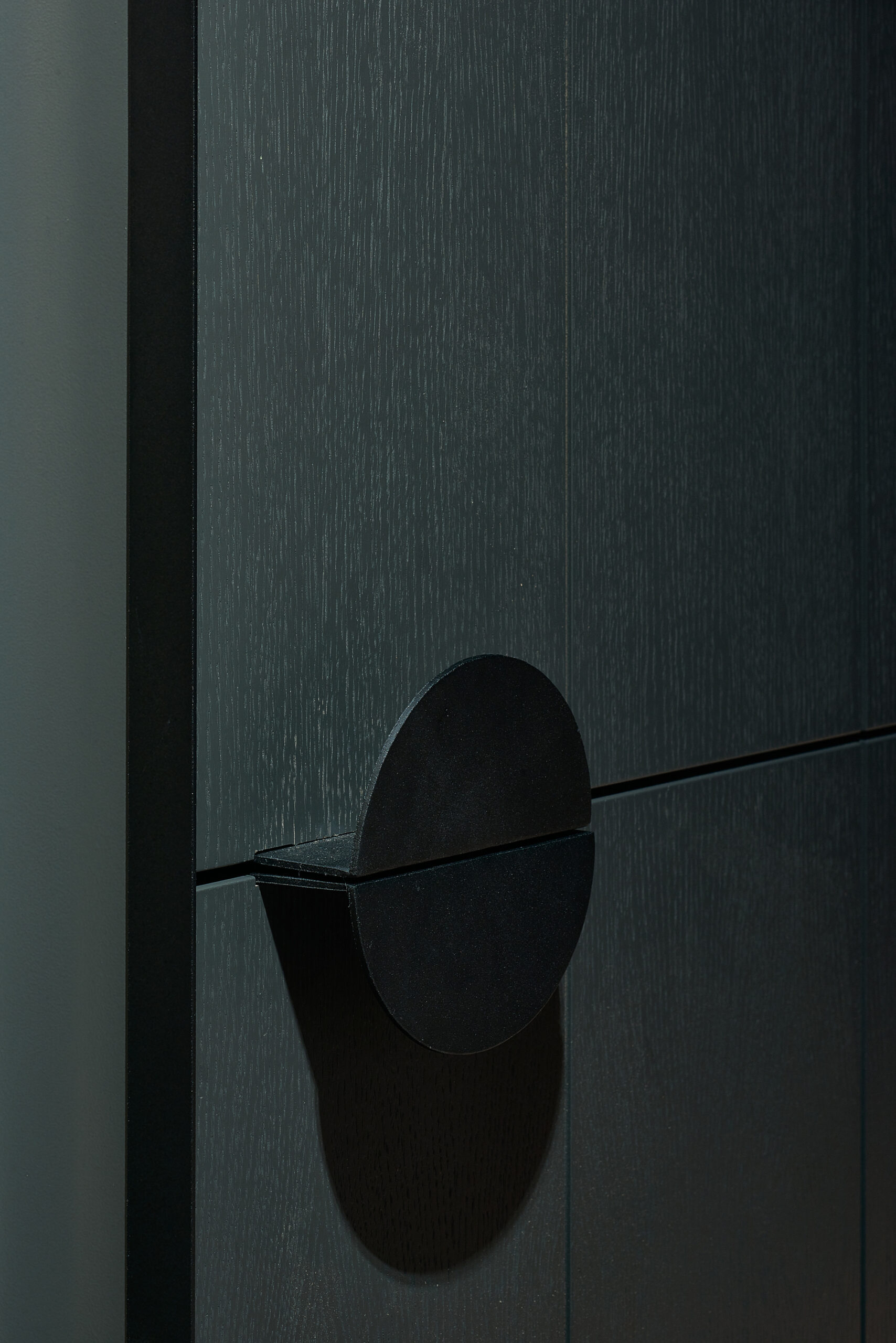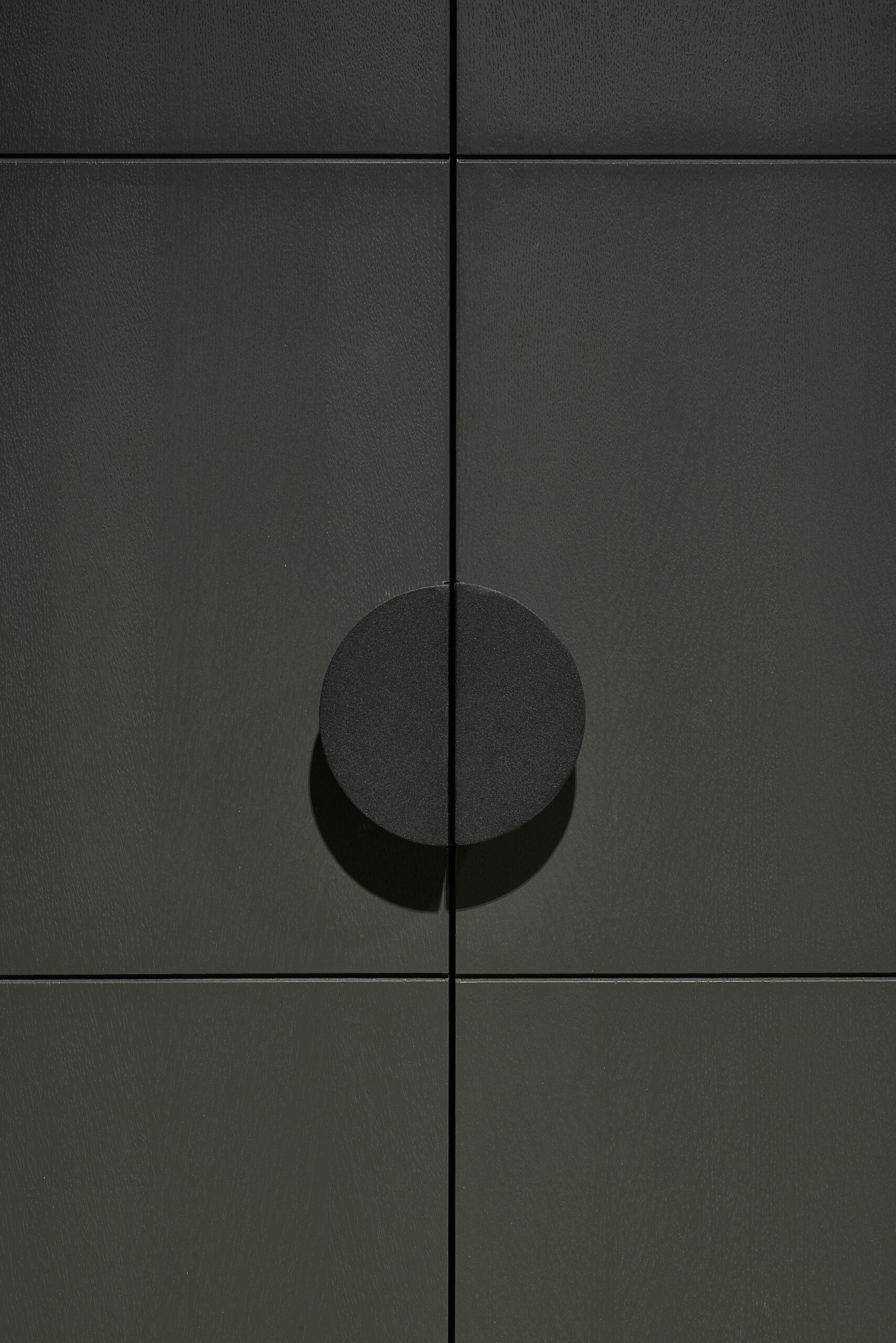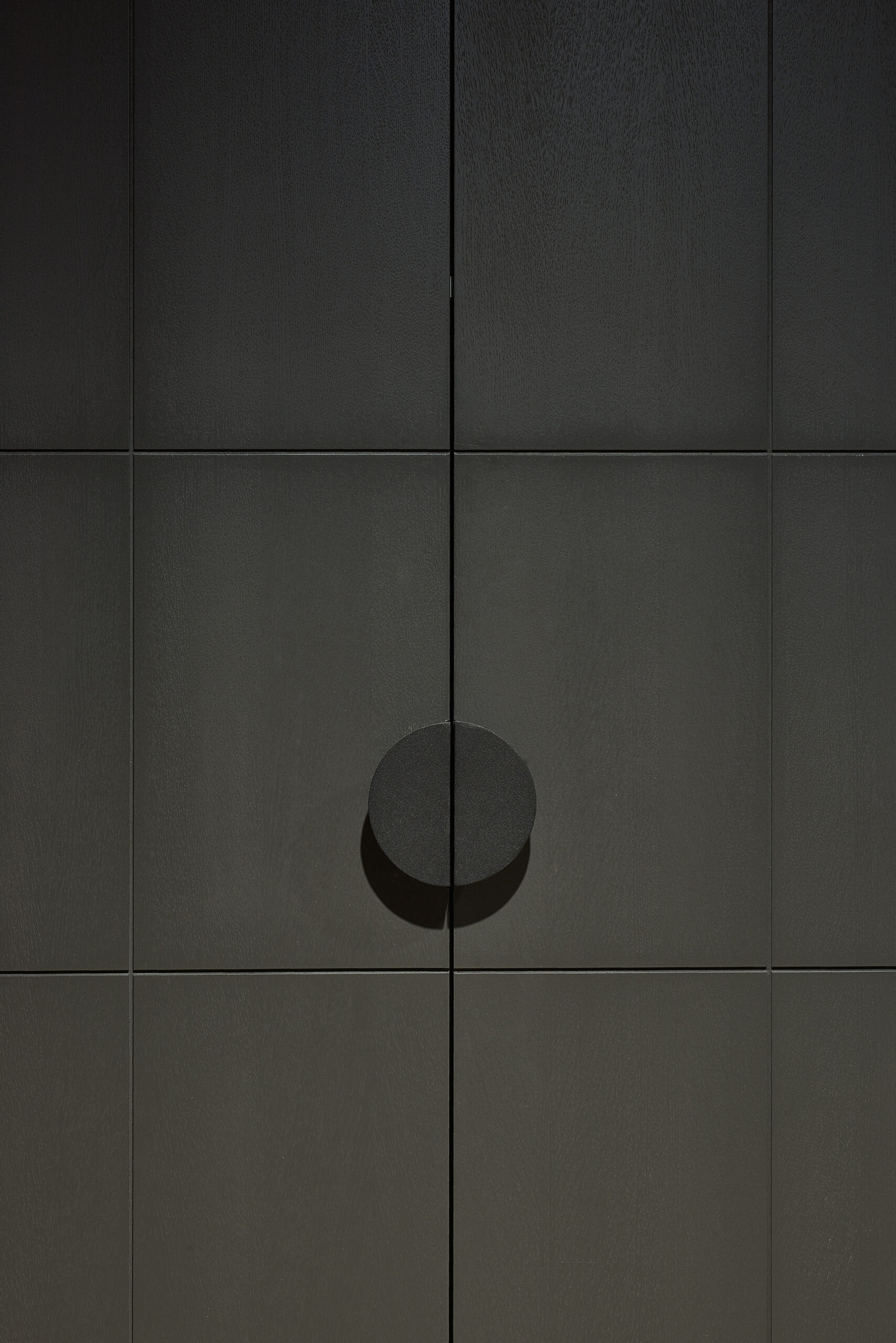 The original apartment plan featured a chimney shaft, but the client did not want a fireplace. The chimney shaft was extended to form a bigger volume that helped to shape a separate entrance zone. This central volume houses a mirror, shelves, utility closet and a fridge. Moving the fridge out of the kitchen niche allows a strictly horizontally oriented kitchen furniture design without any vertical furniture where typically fridge is.
