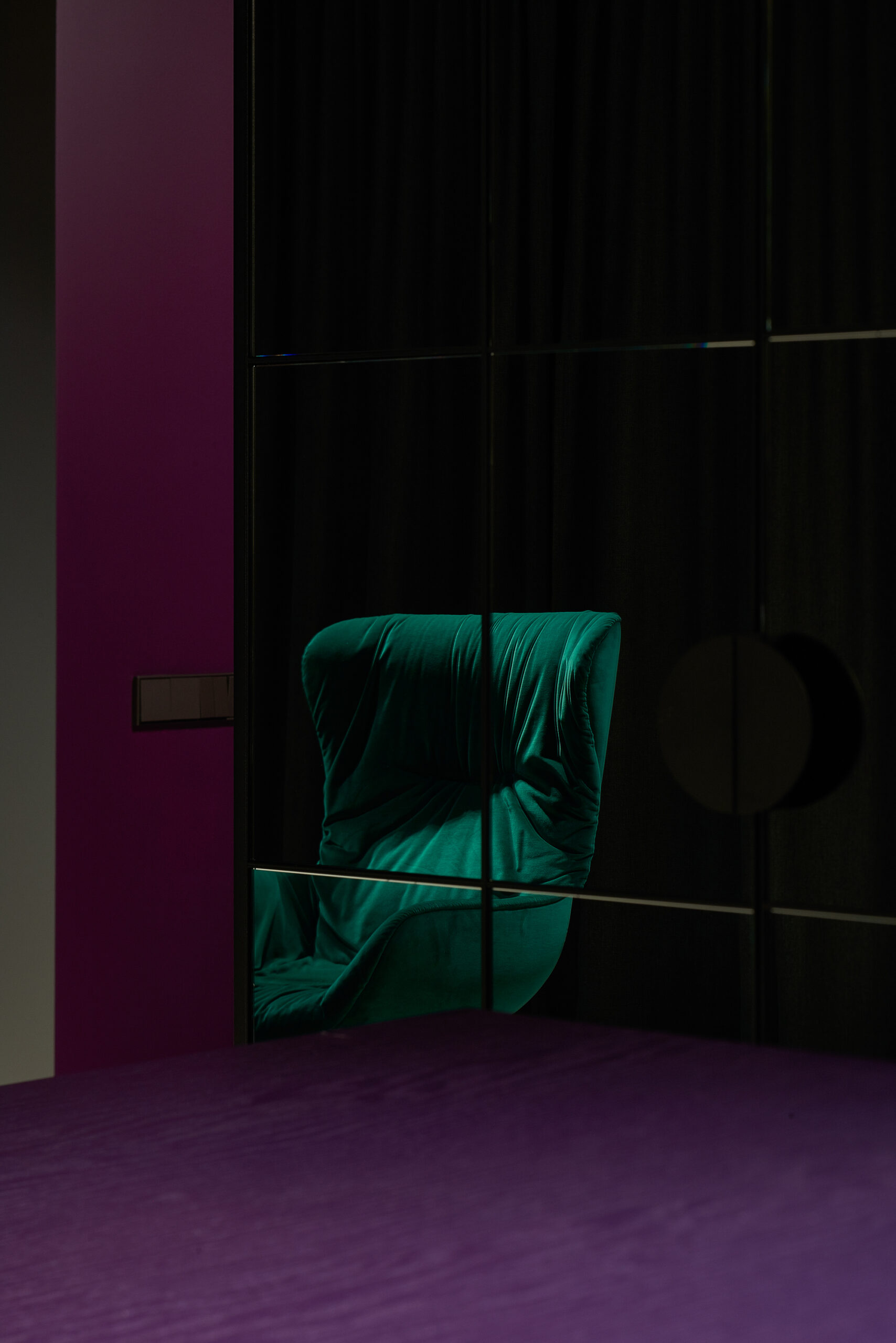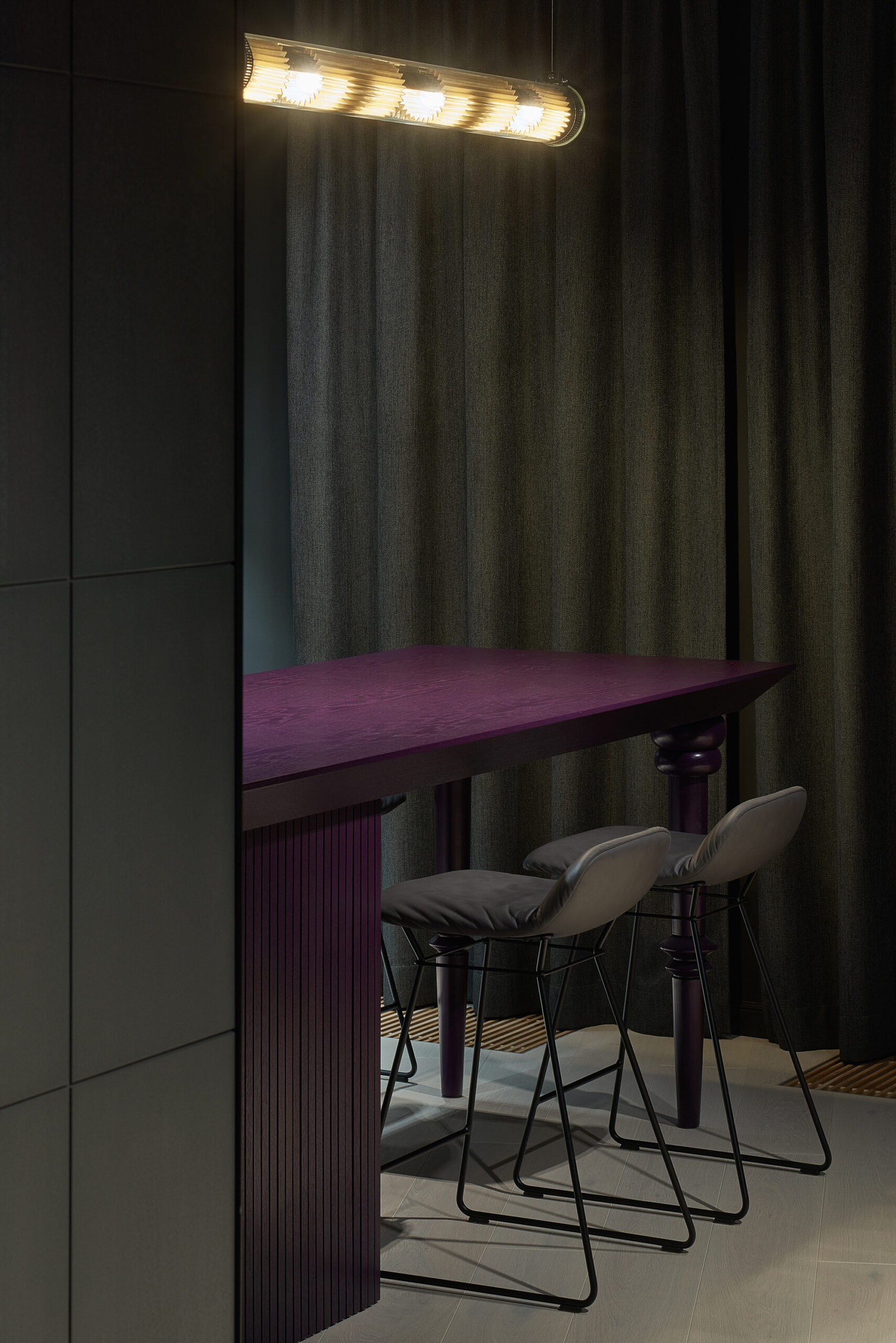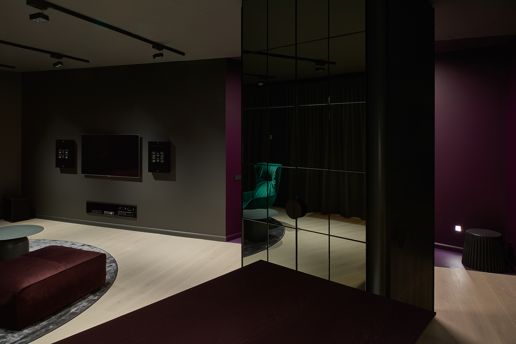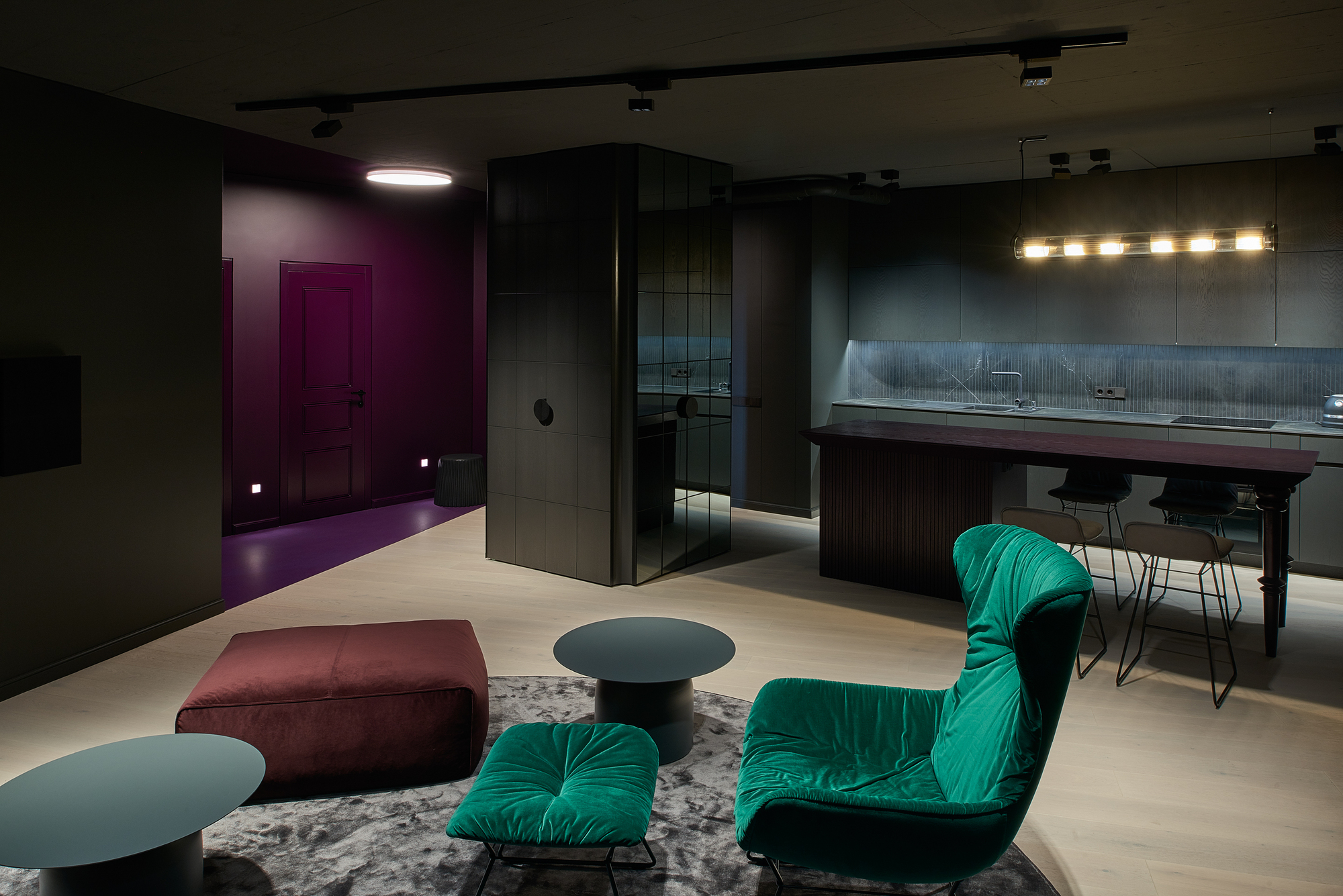 The apartment was given dark grey, almost black color, so the limits of the room dissolve in the shadows. Bright saturated colors of the furniture put accents in the space. The spotlights highlighting the colors and the shapes. The contrasts between light and shadow, saturated color and black all together create a theatre-like feeling.