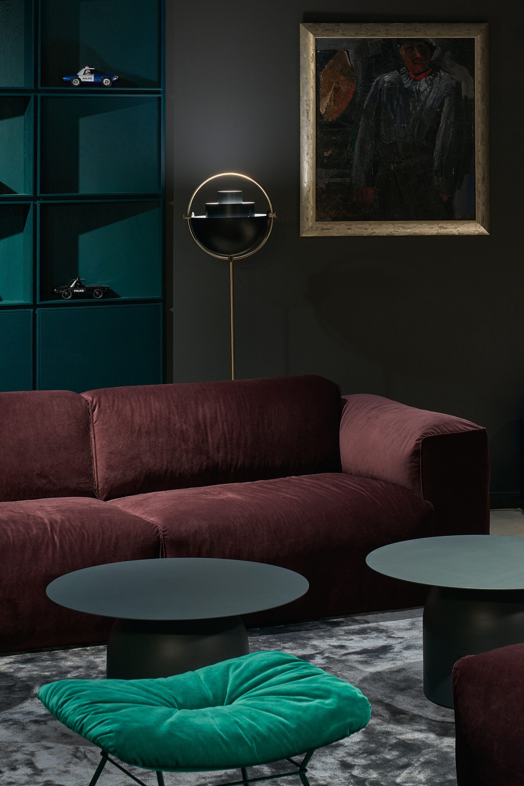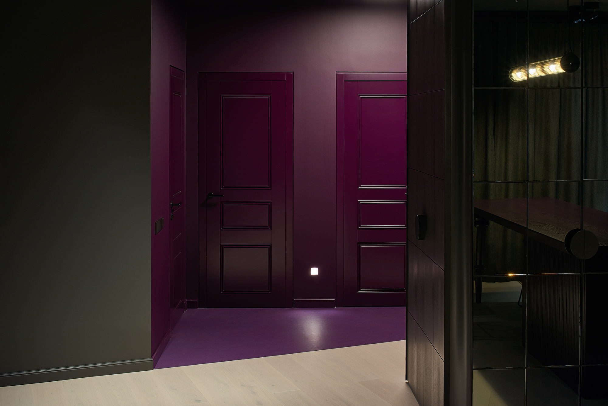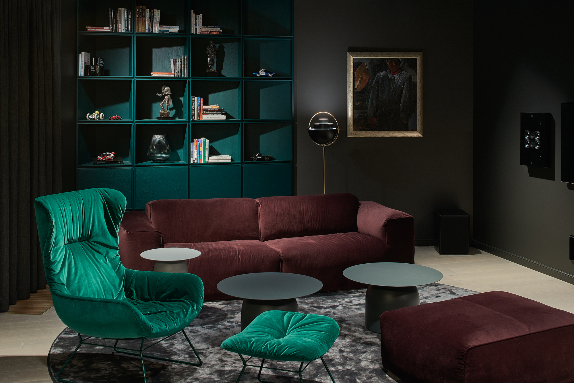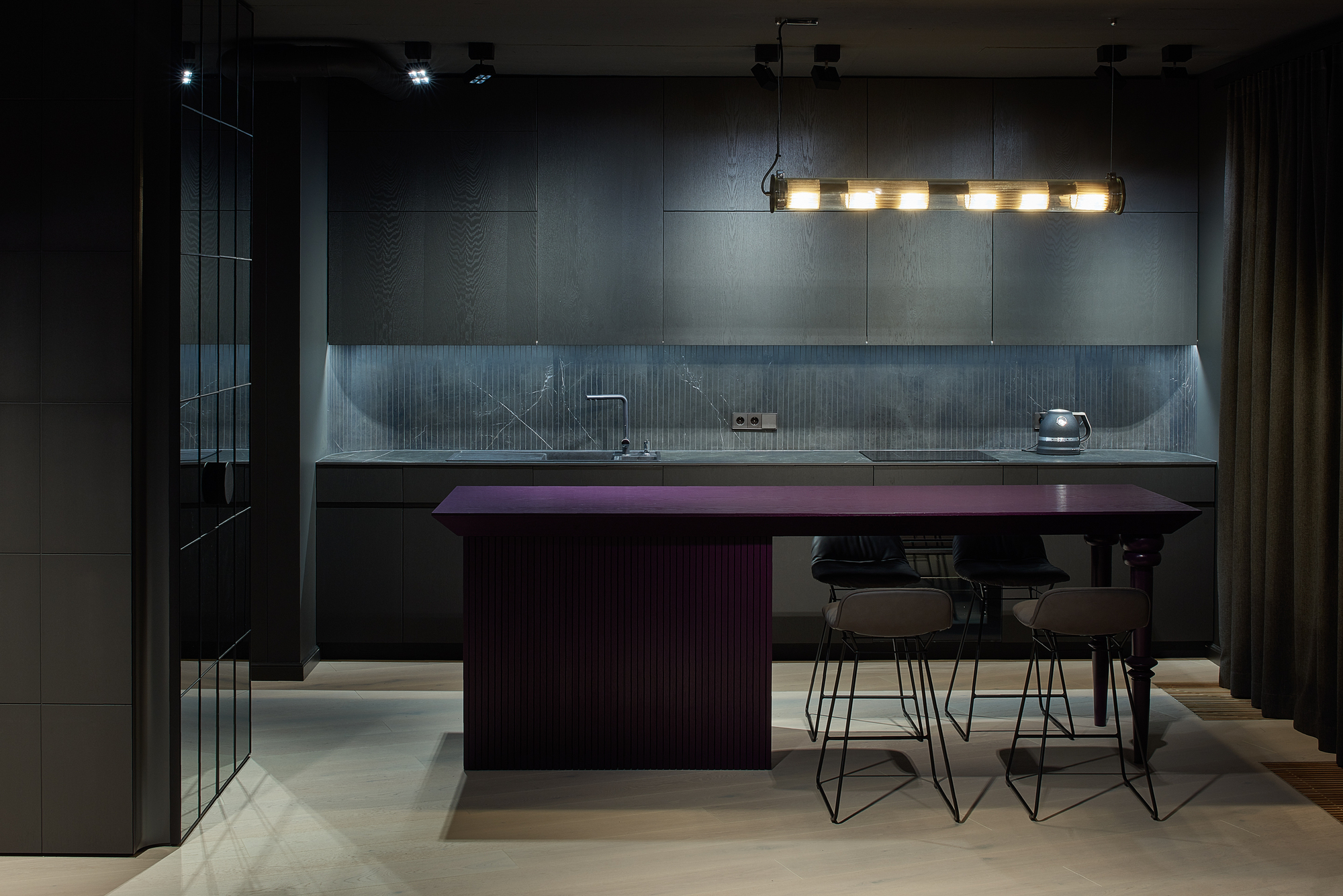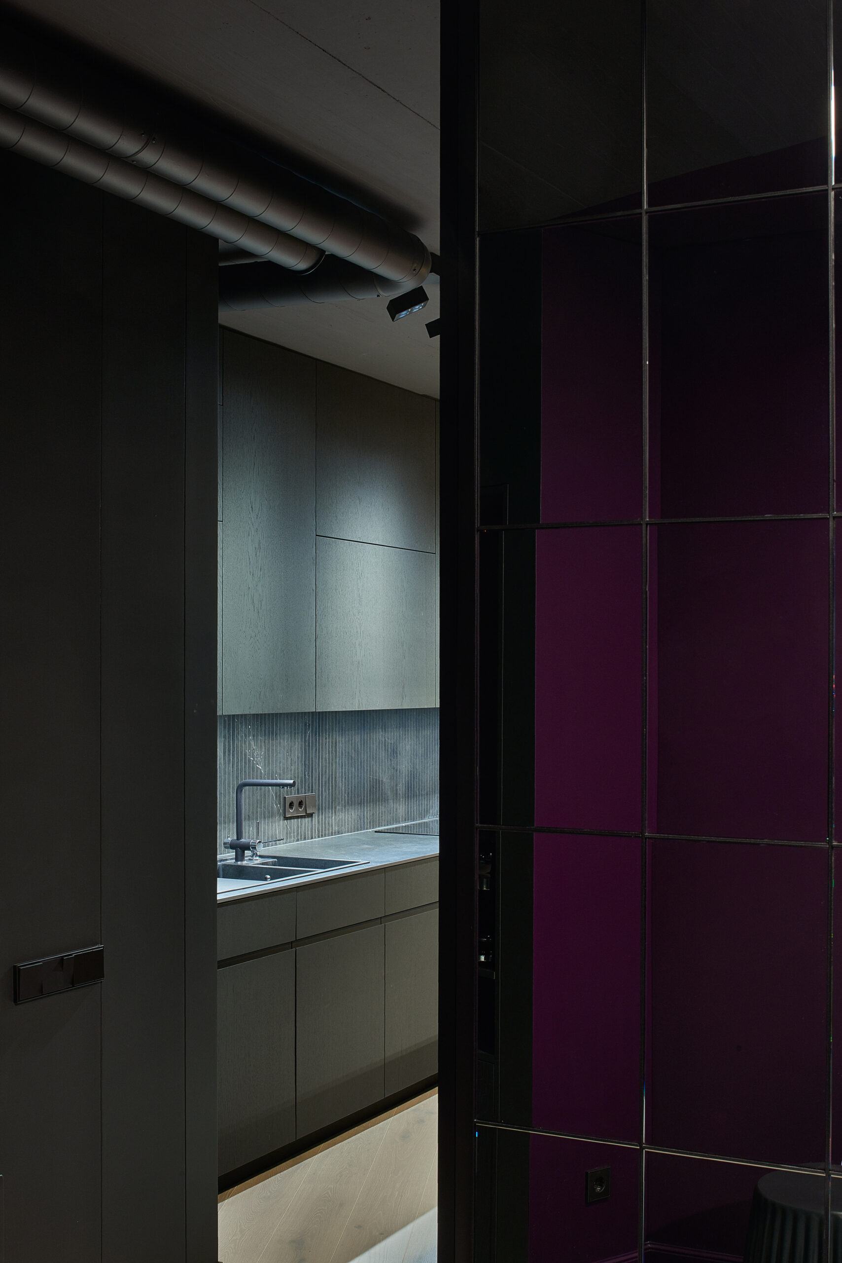 The apartment was given dark grey, almost black color, so the limits of the room dissolve in the shadows. Bright saturated colors of the furniture put accents in the space. The spotlights highlighting the colors and the shapes. The contrasts between light and shadow, saturated color and black all together create a theatre-like feeling.