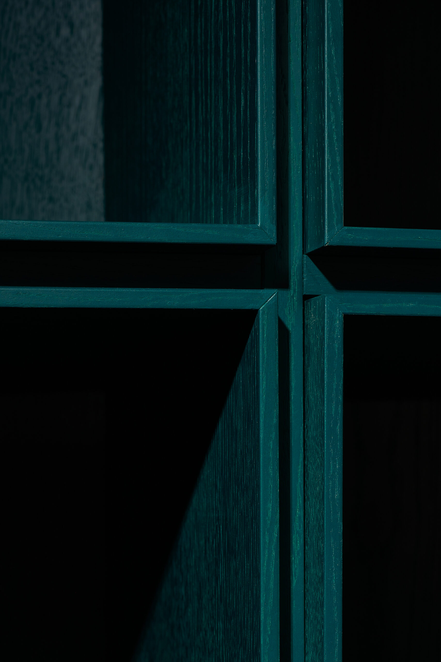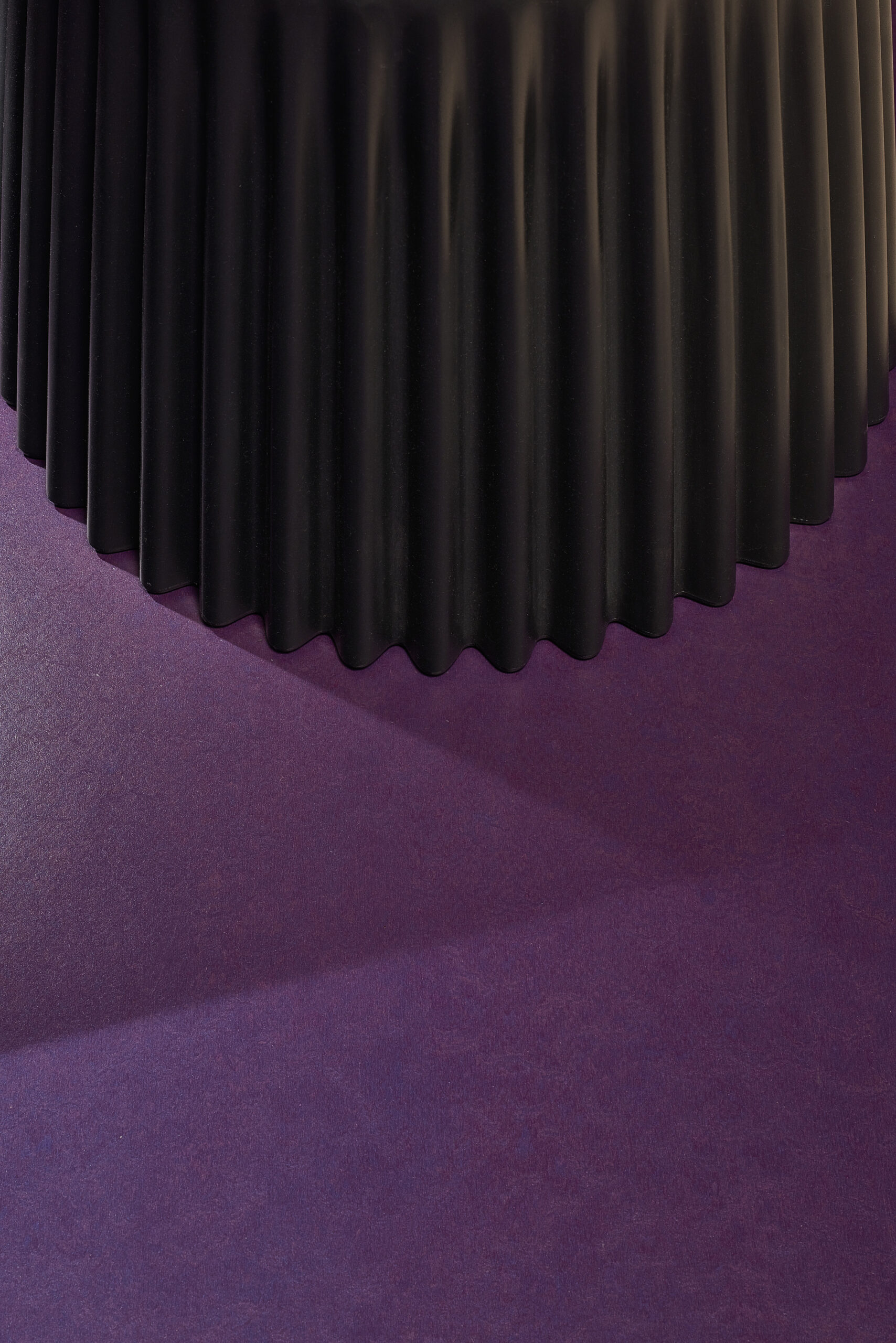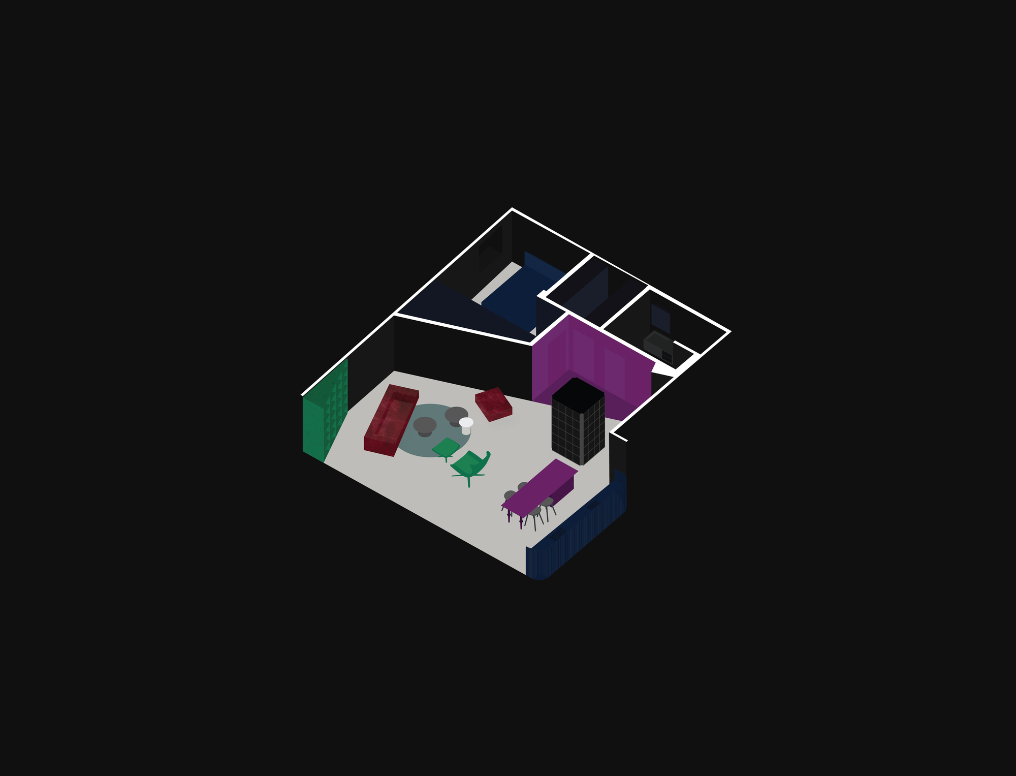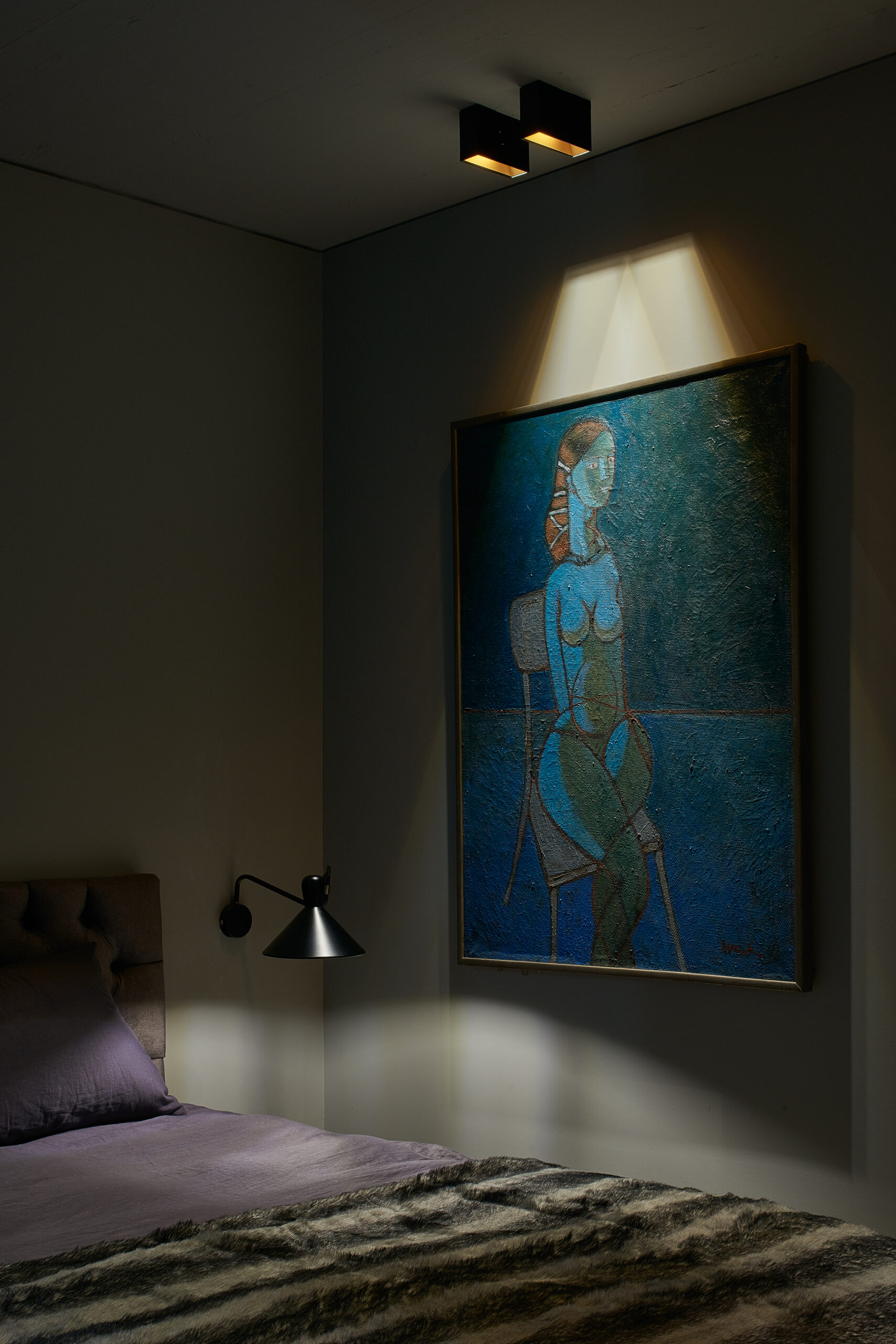 The apartment was given dark grey, almost black color, so the limits of the room dissolve in the shadows. Bright saturated colors of the furniture put accents in the space. The spotlights highlighting the colors and the shapes. The contrasts between light and shadow, saturated color and black all together create a theatre-like feeling.