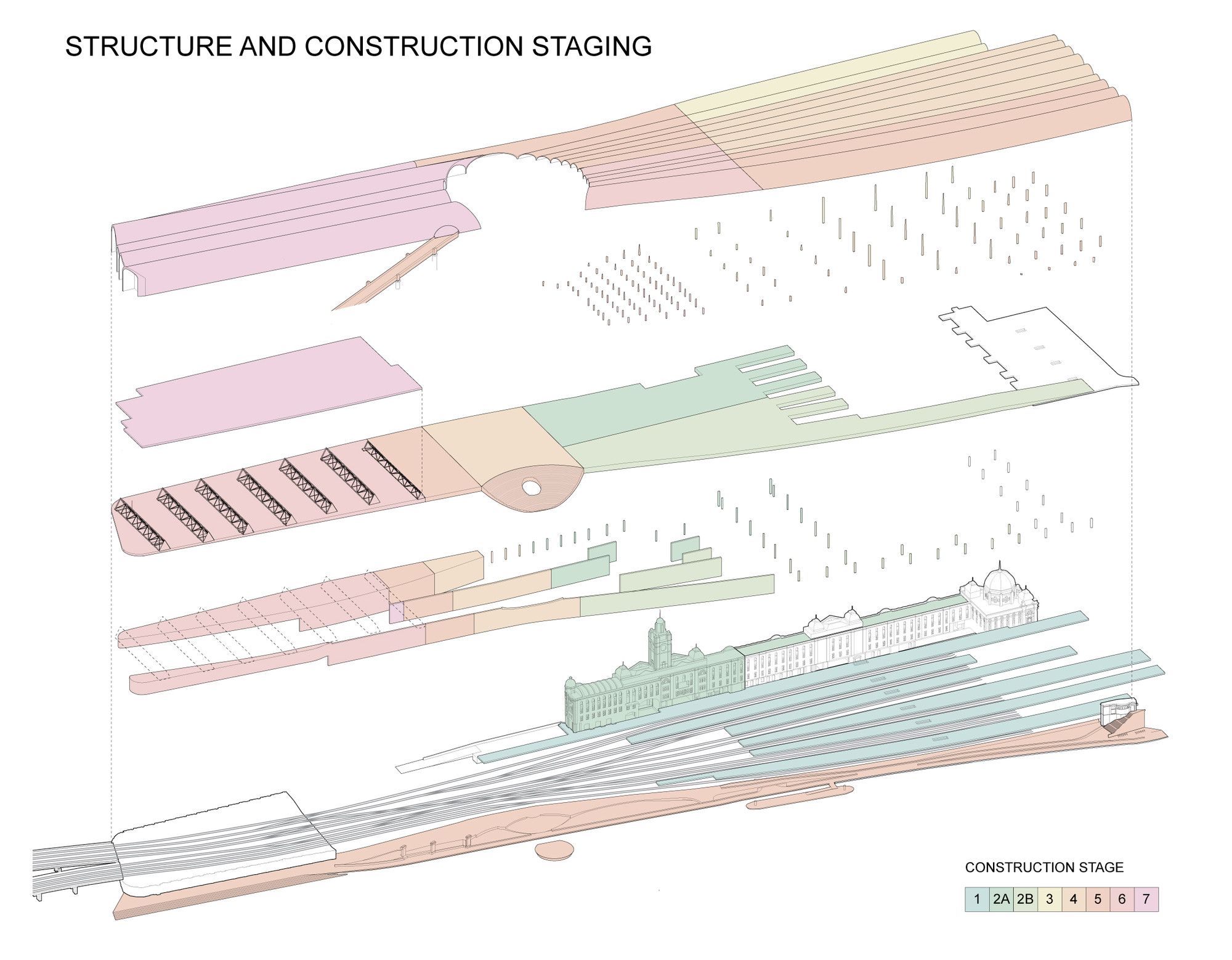 Rather than creating one monumental gesture, a series of vaults of varying height and scale follow the track lines, defining the space above each train platform. The result is an articulated roofscape made up of individual, smaller vaults.