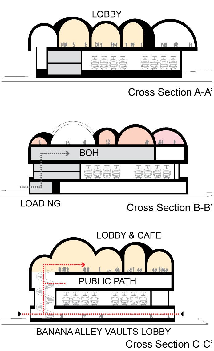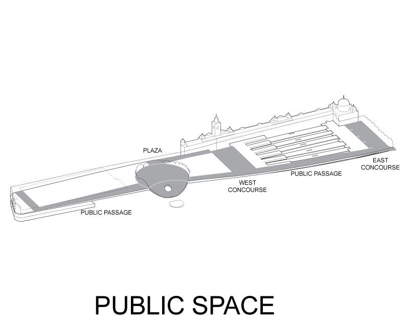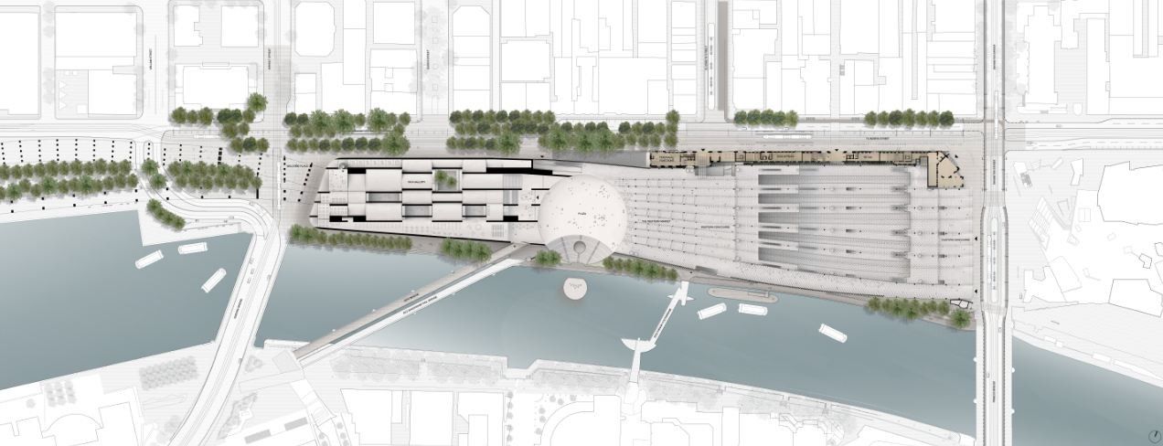 _Transforms the site into a new civic precinct with an art gallery, a public plaza, an amphitheater, a marketplace and a permanent home for arts and cultural organizations.