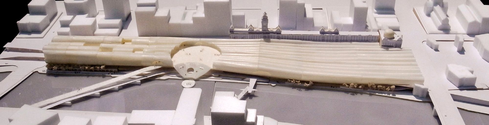 An important part of the original design for the station was a collection of arched roofs, adjacent to the heritage buildings, with large vaults covering the platforms. These were never built, so the station never realized its full potential.