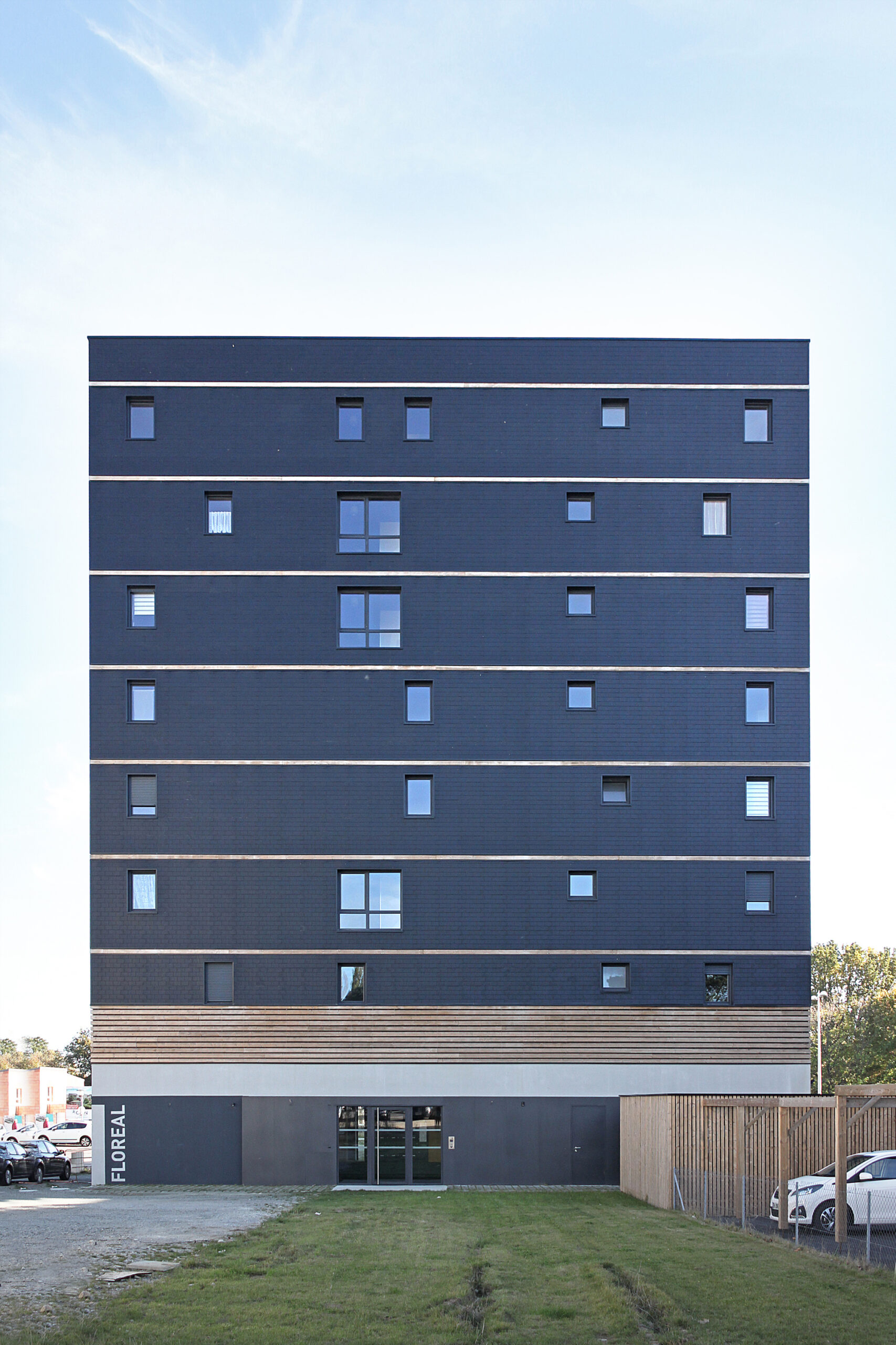 Floreal Apartments, The site hosting the project is located in St Nazaire (France). The plot is rectangular in shape, its small side aspecting the S. Bernhardt Lane and the large side aligned on the Broodcoorens boulevard. The north-west dividing line separates the land from the second part of block, which will later be urbanized, and also intended to accommodate a housing program.