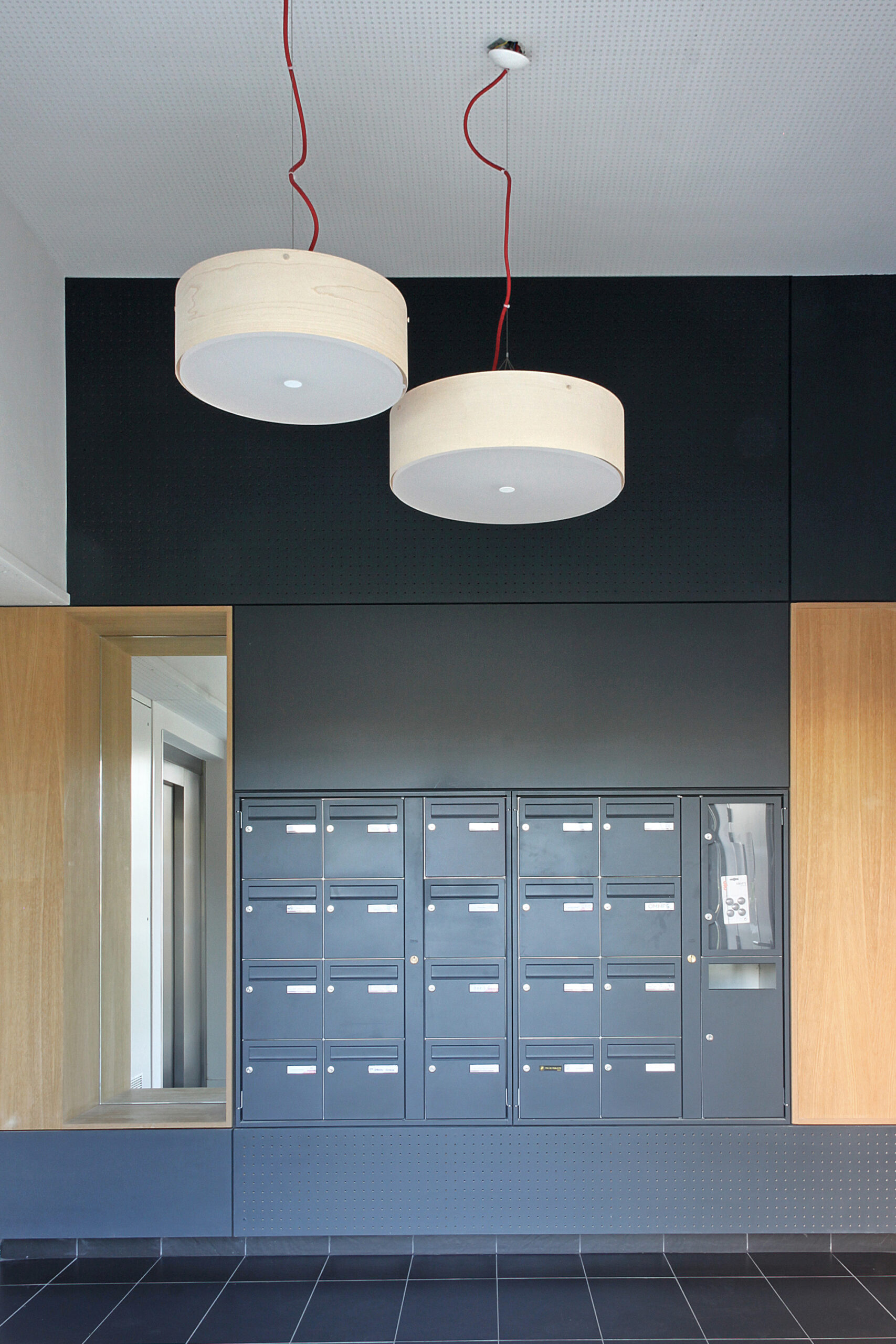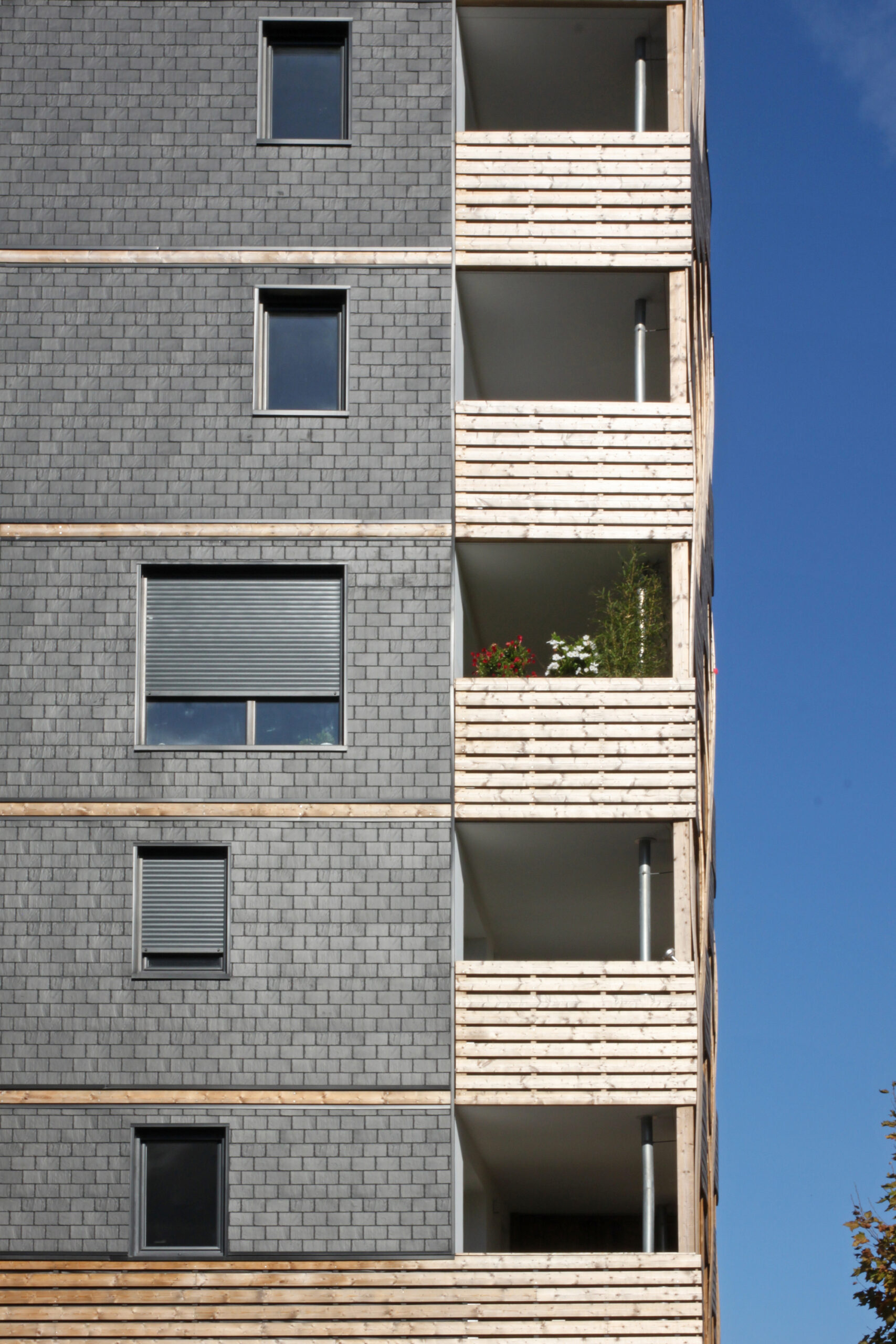 Between the two previous registers, a dialogue opens through wooden spars that surround the building on three sides. First, the wide cane band that covers the glass strip of the trade is invited around the building, then, in the upper levels, one of the wooden boards composing the south balconies is continued on the three facades and marks the level all by lightening the overall mase of the building. The panels will be charcoal gray, the wood will be left in the natural state (Spruce).