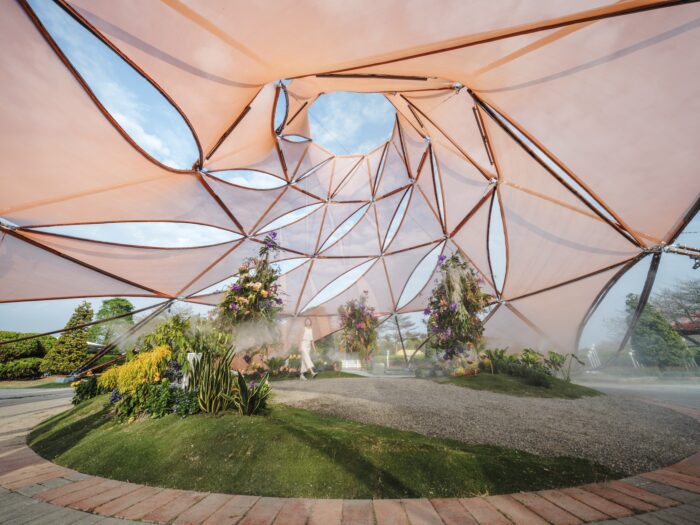 Flourish Pavilion, In the greenhouse, where sunlight and moisture converge, emerges a sacred space for the growth of flowers and crops. Inspired by the everyday scenery of agricultural greenhouses in Changhua, Taiwan, “Flourish” features a bamboo-structured dome. This artwork utilizes agricultural materials such as bamboo and agricultural mesh, aiming to showcase the vitality of blooming flowers through modern geometric structures. The interior of the dome presents a variety of spaces, including large floral floating islands, greenhouse mist irrigation systems, original electronic music, and projection art, intending to bring a vibrant new atmosphere of spring to the public.
